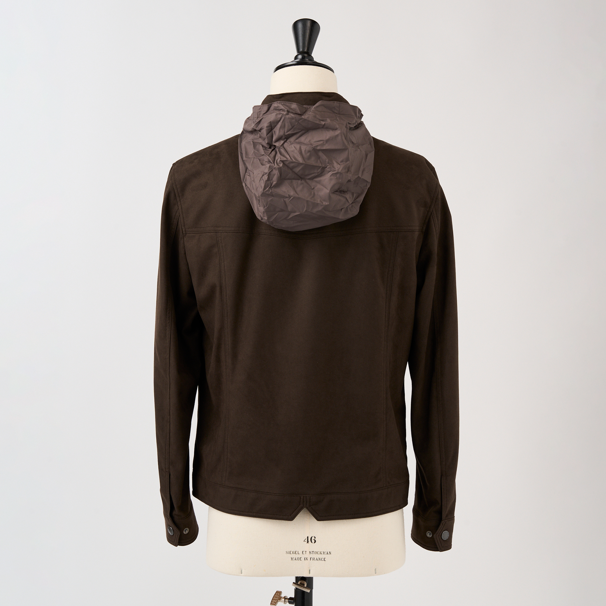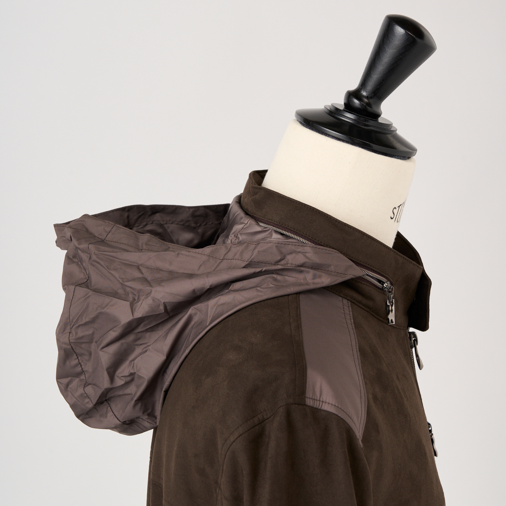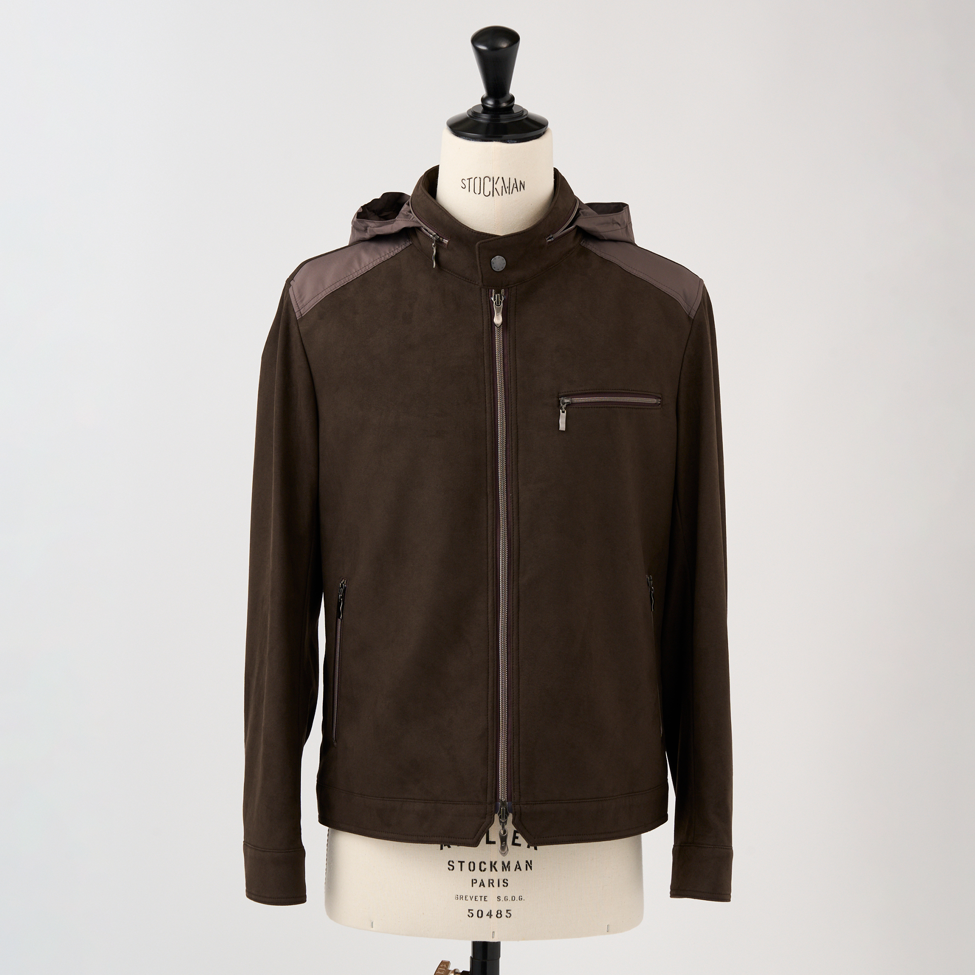 高級人工皮革(アマレッタ)素材の高級感溢れるシャープなシルエットのドライビングブルゾン。ファスナーもハイクオリティーなメタリオンファスナーを使用し、高級感を演出しています。突然の雨にも撥水加工のフードが衿に備わっており雨をカットすることが出来ます。