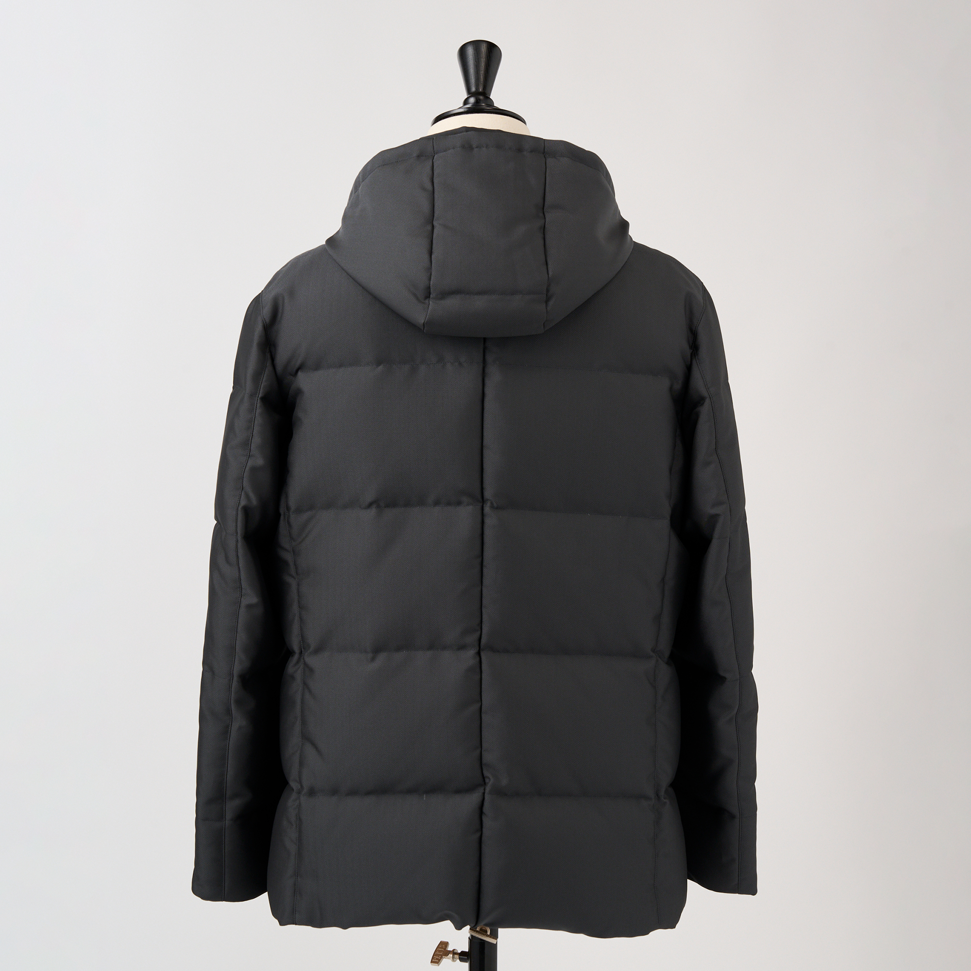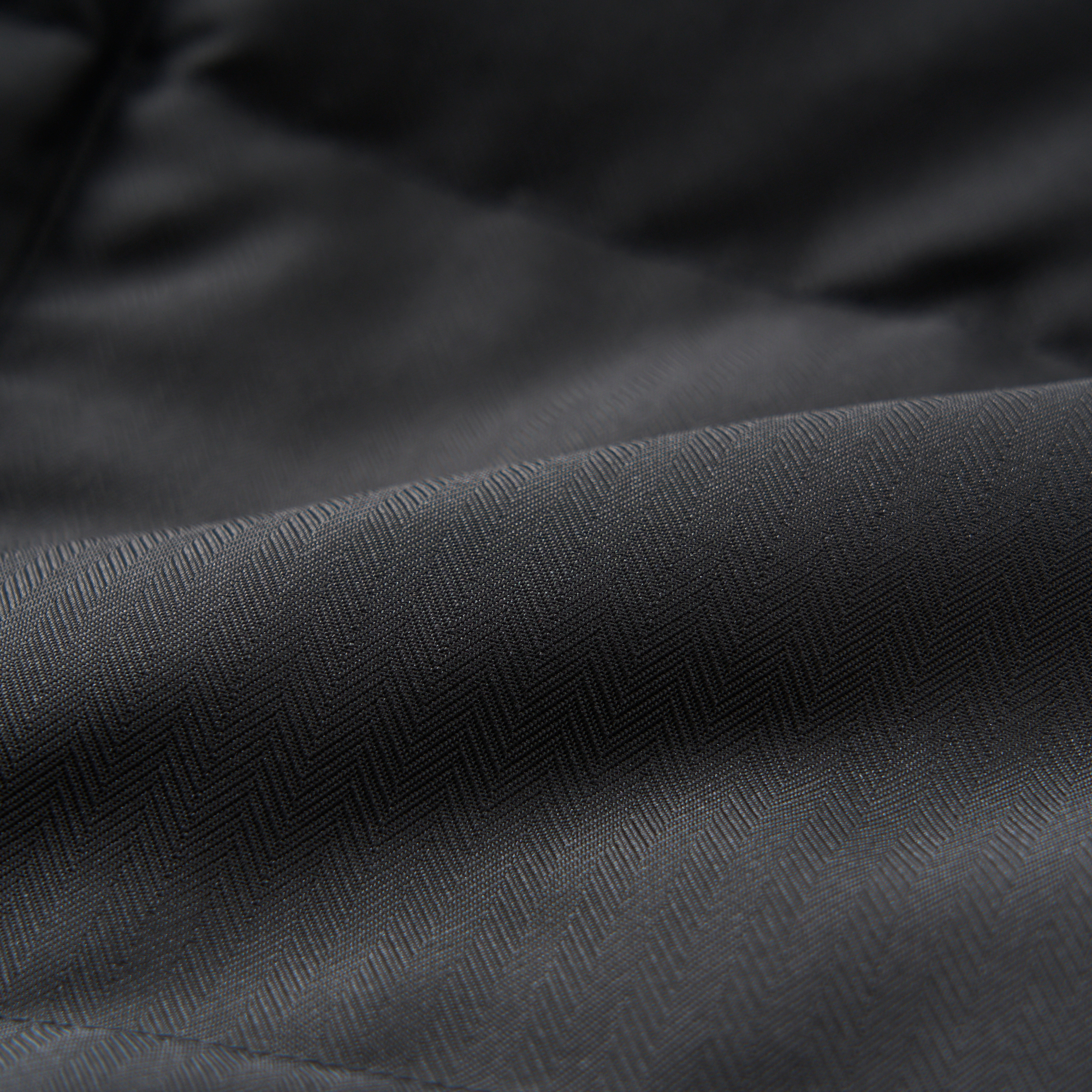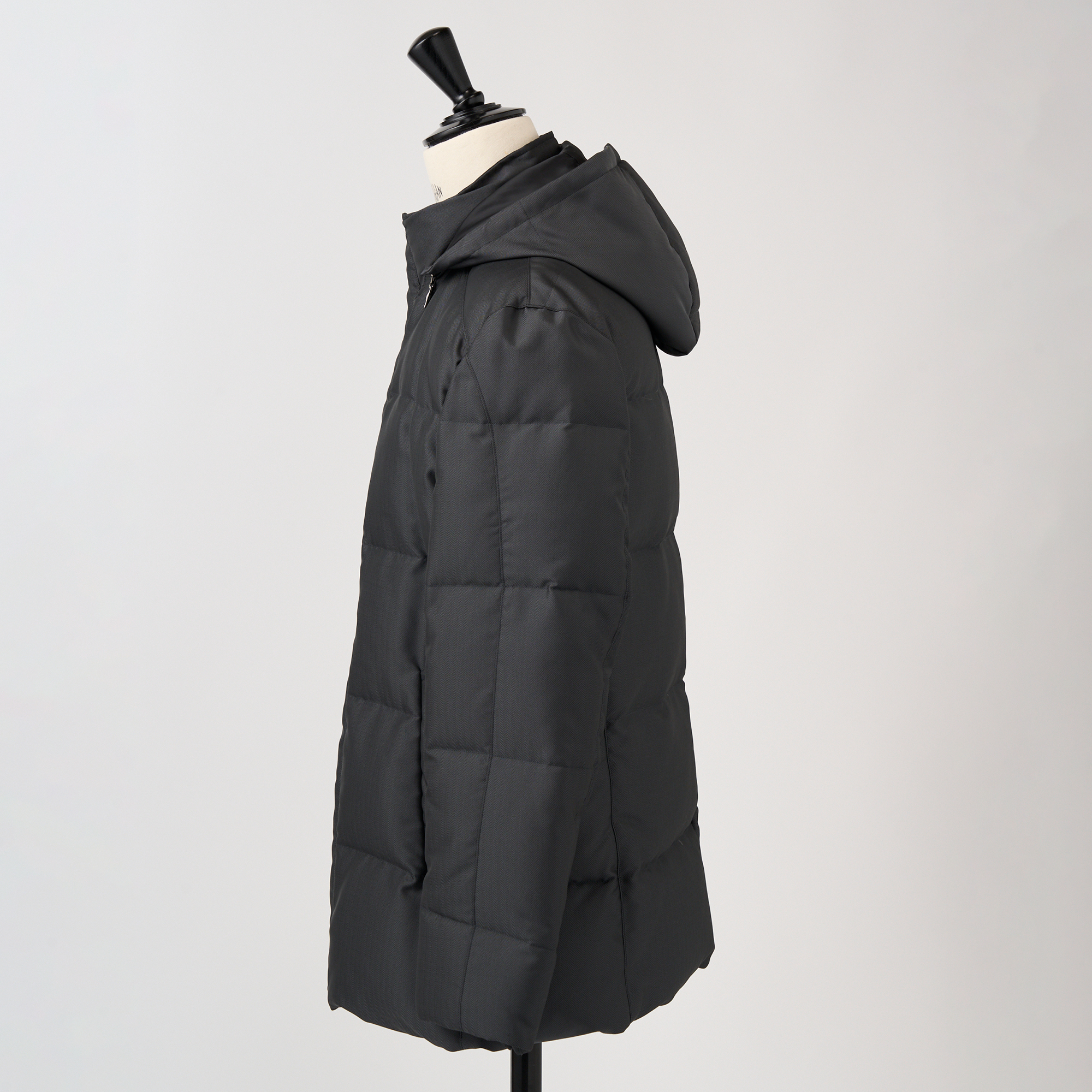 群馬県桐生市の生地産地で織り上げた撥水性のあるヘリンボーンポリエステルのダウンジャケット。ダウンジャケットには余り見られないサイバラのあるパターン設計で仕立てているので着用時のシルエットがシャープで綺麗です。