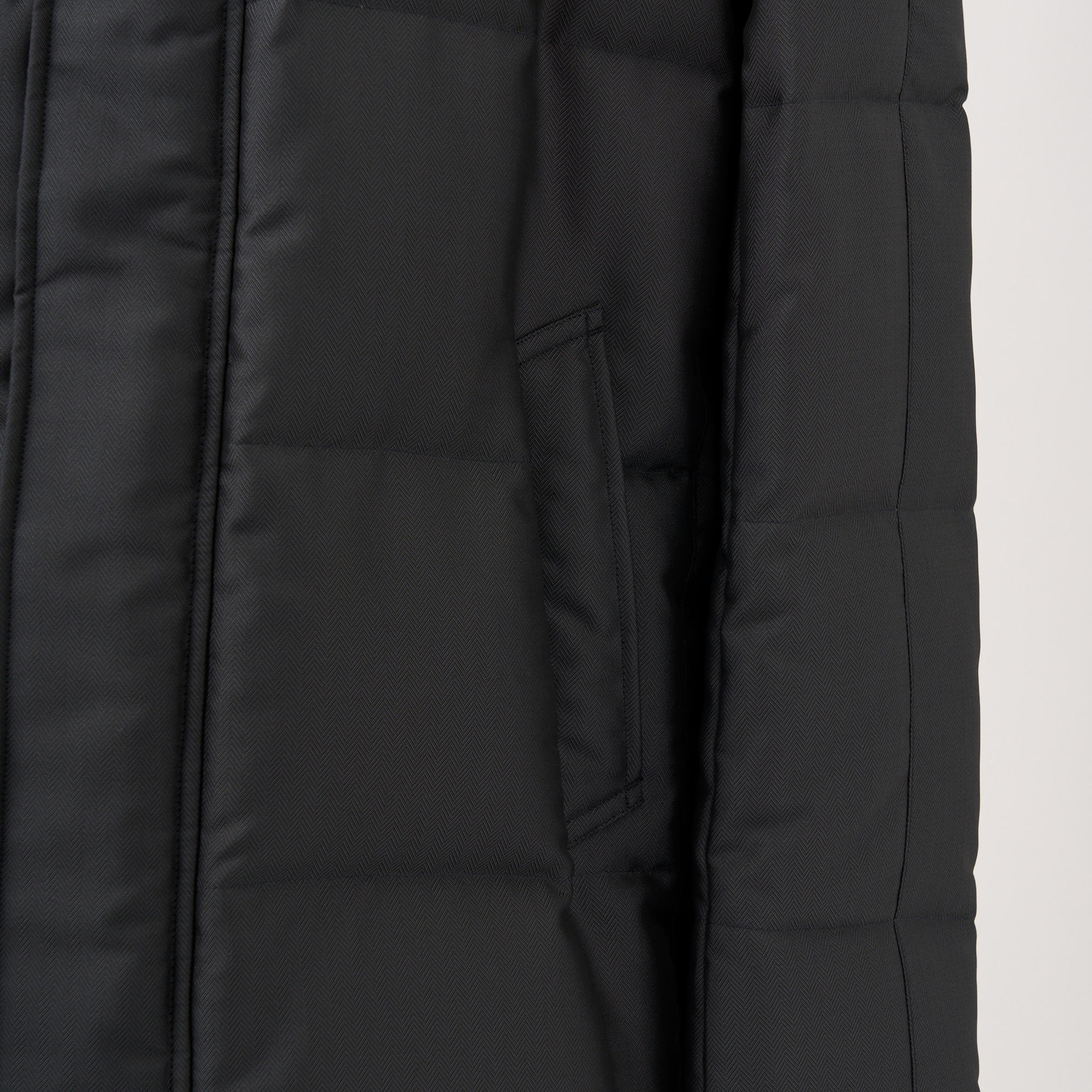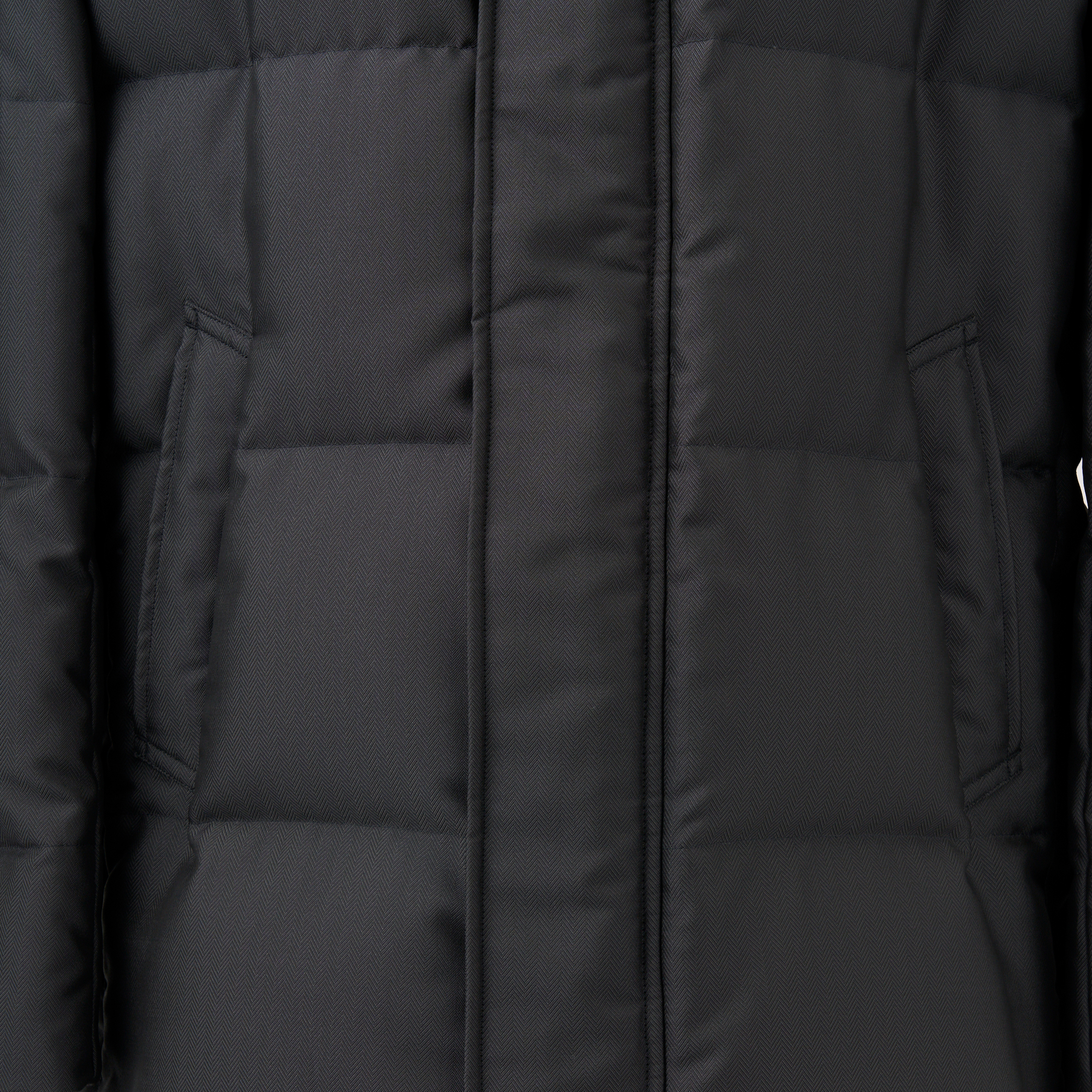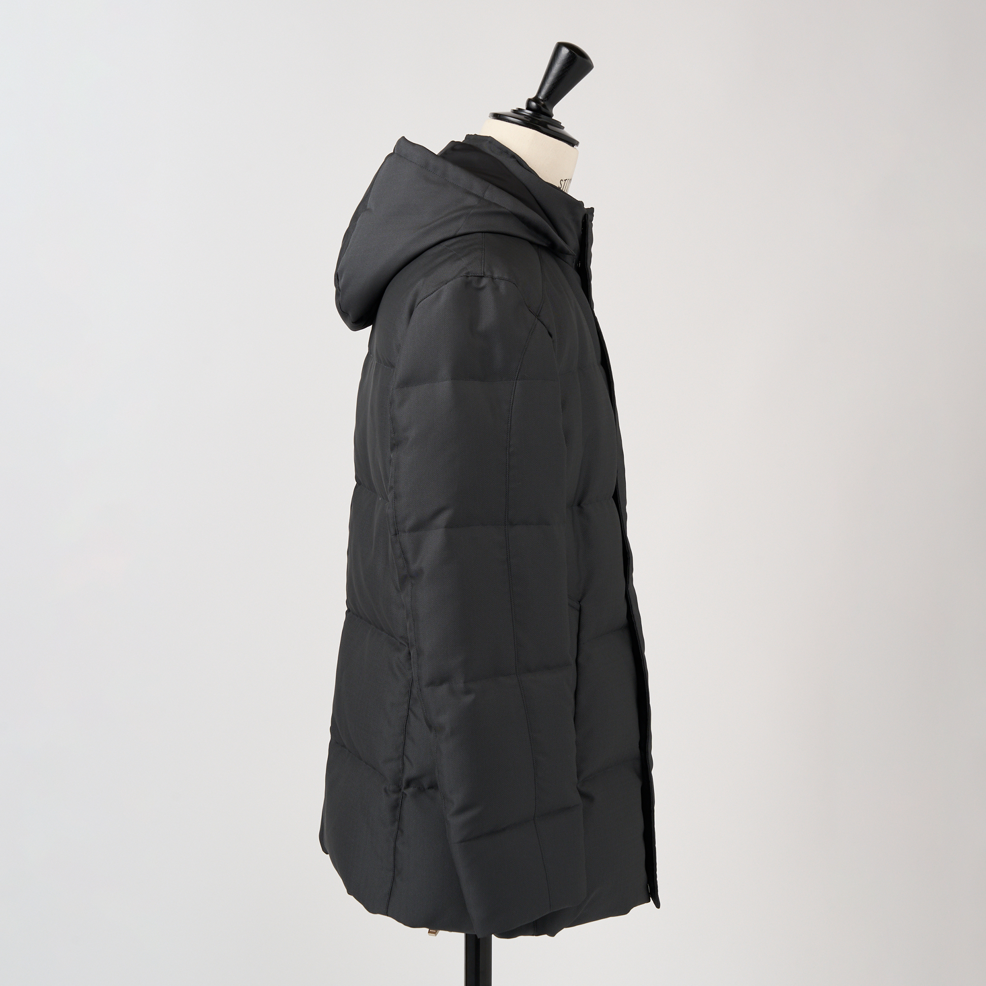 群馬県桐生市の生地産地で織り上げた撥水性のあるヘリンボーンポリエステルのダウンジャケット。ダウンジャケットには余り見られないサイバラのあるパターン設計で仕立てているので着用時のシルエットがシャープで綺麗です。