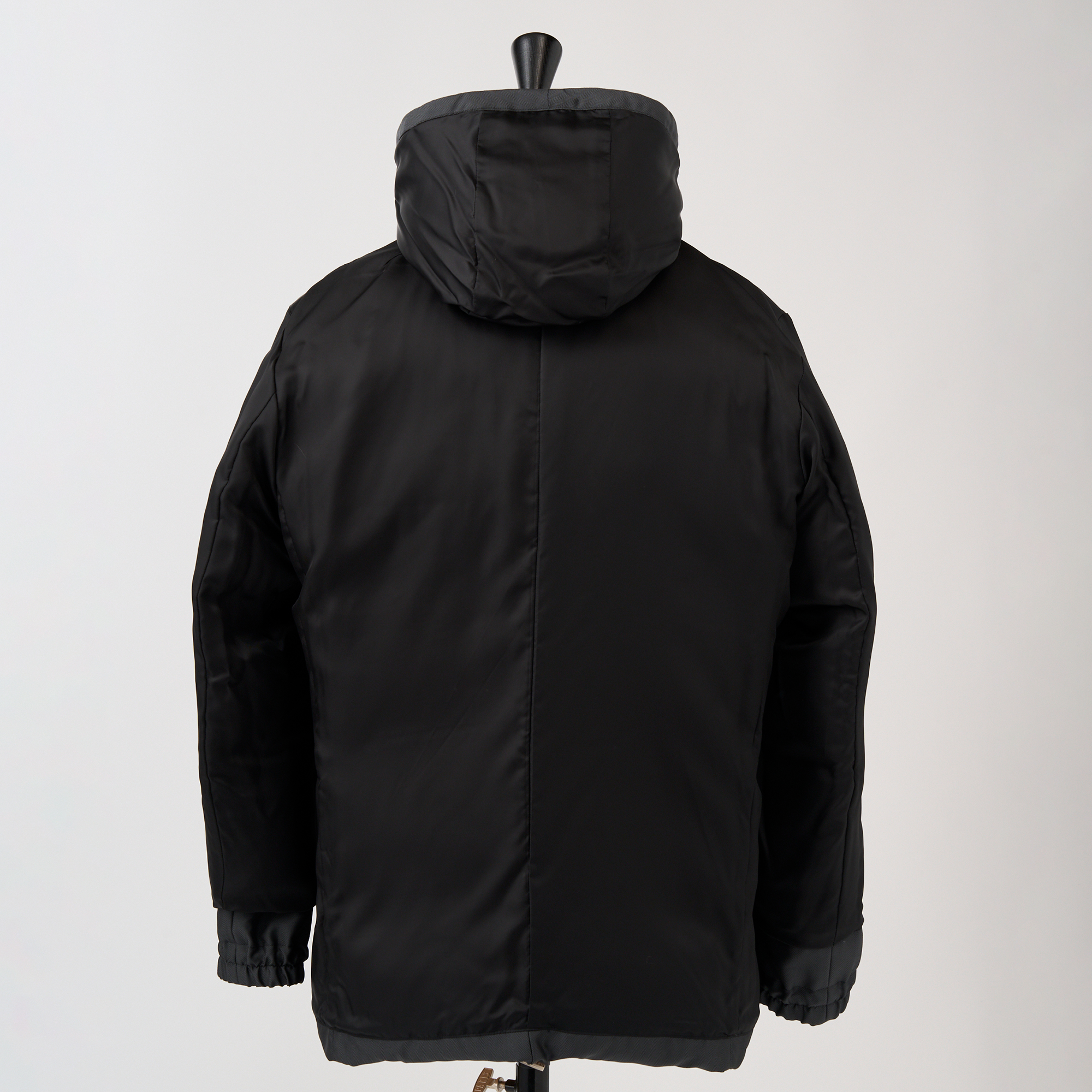 背中芯にも切り替えを入れて更に立体的な雰囲気を醸し出しています。ダウン入りのフードはファスナーで取り外しが可能です。