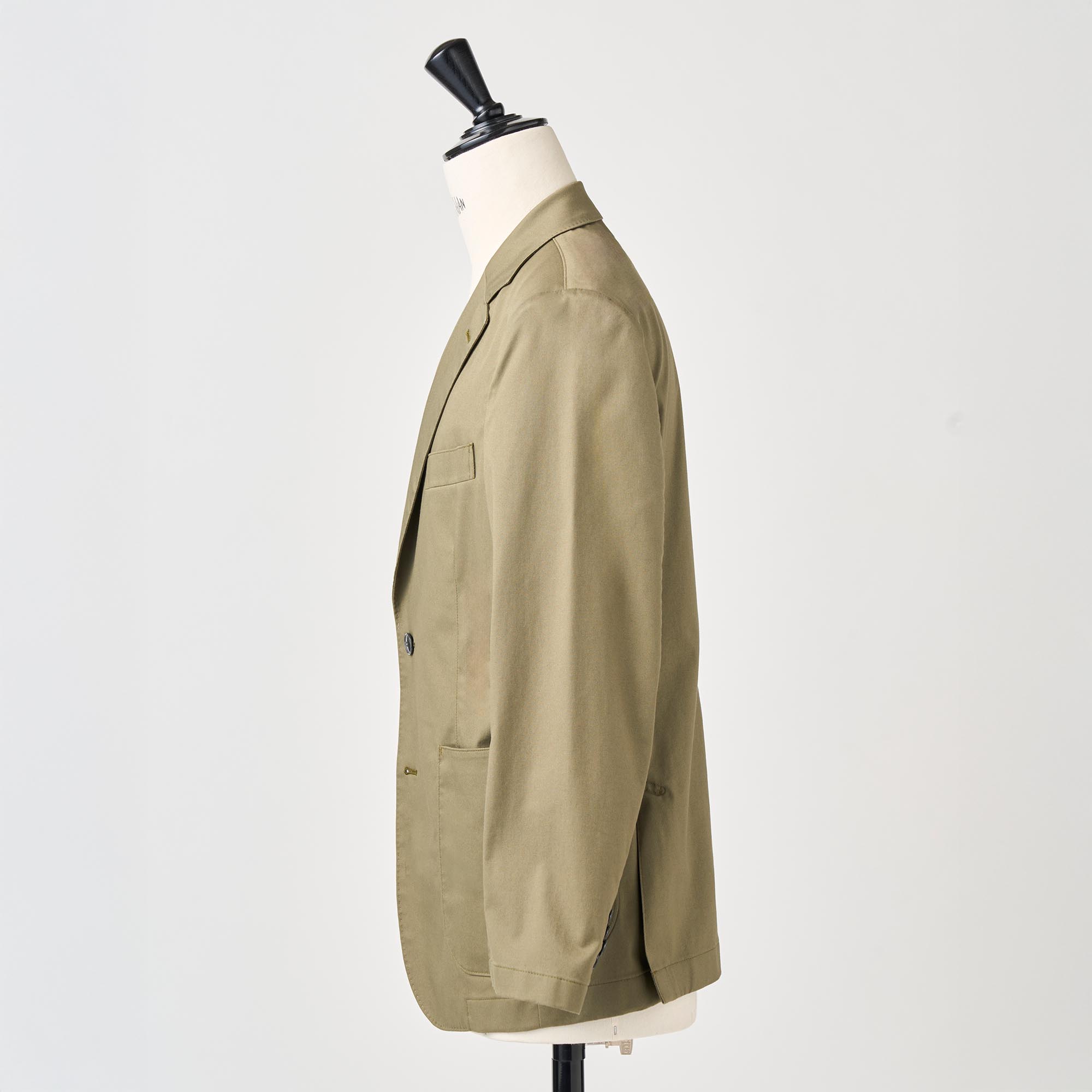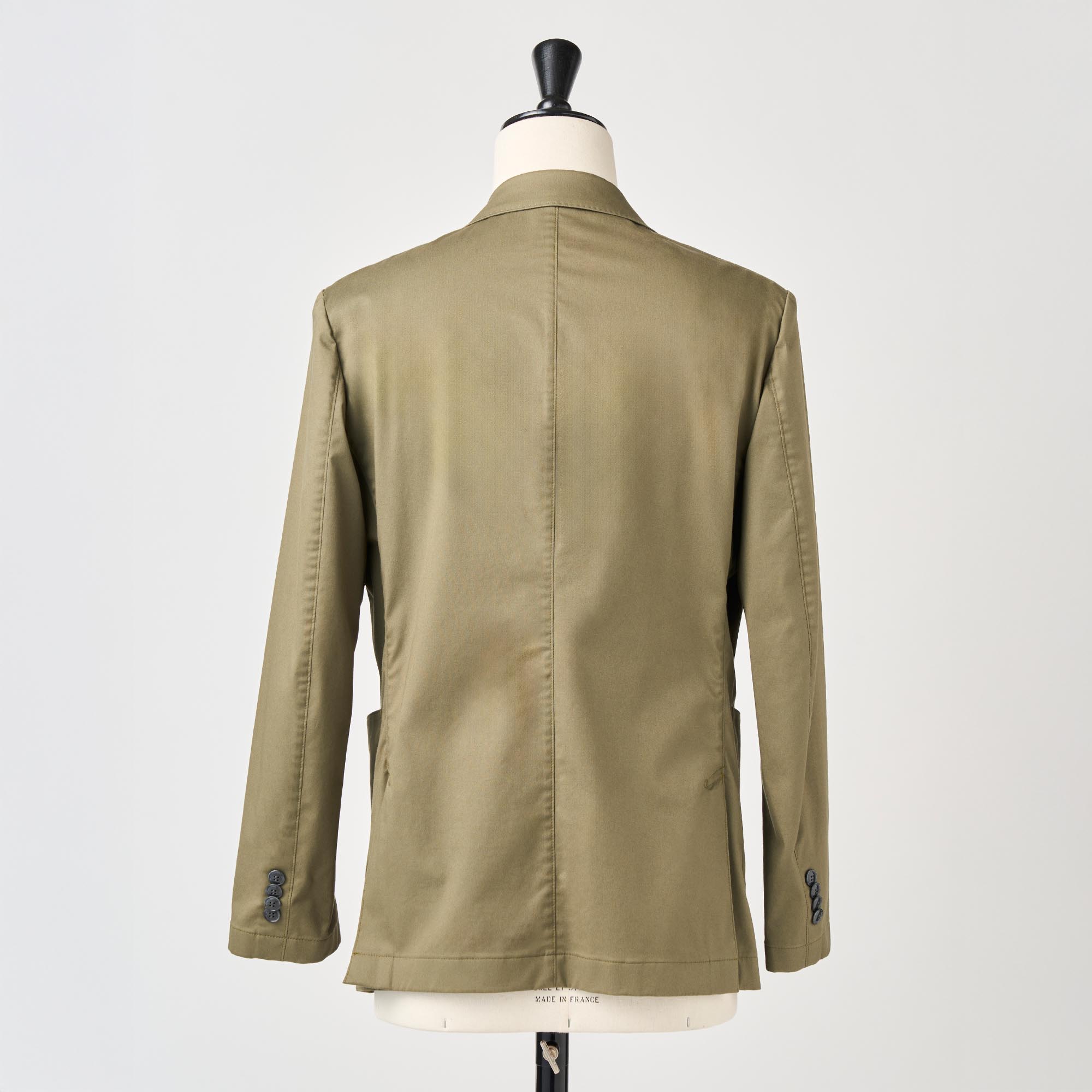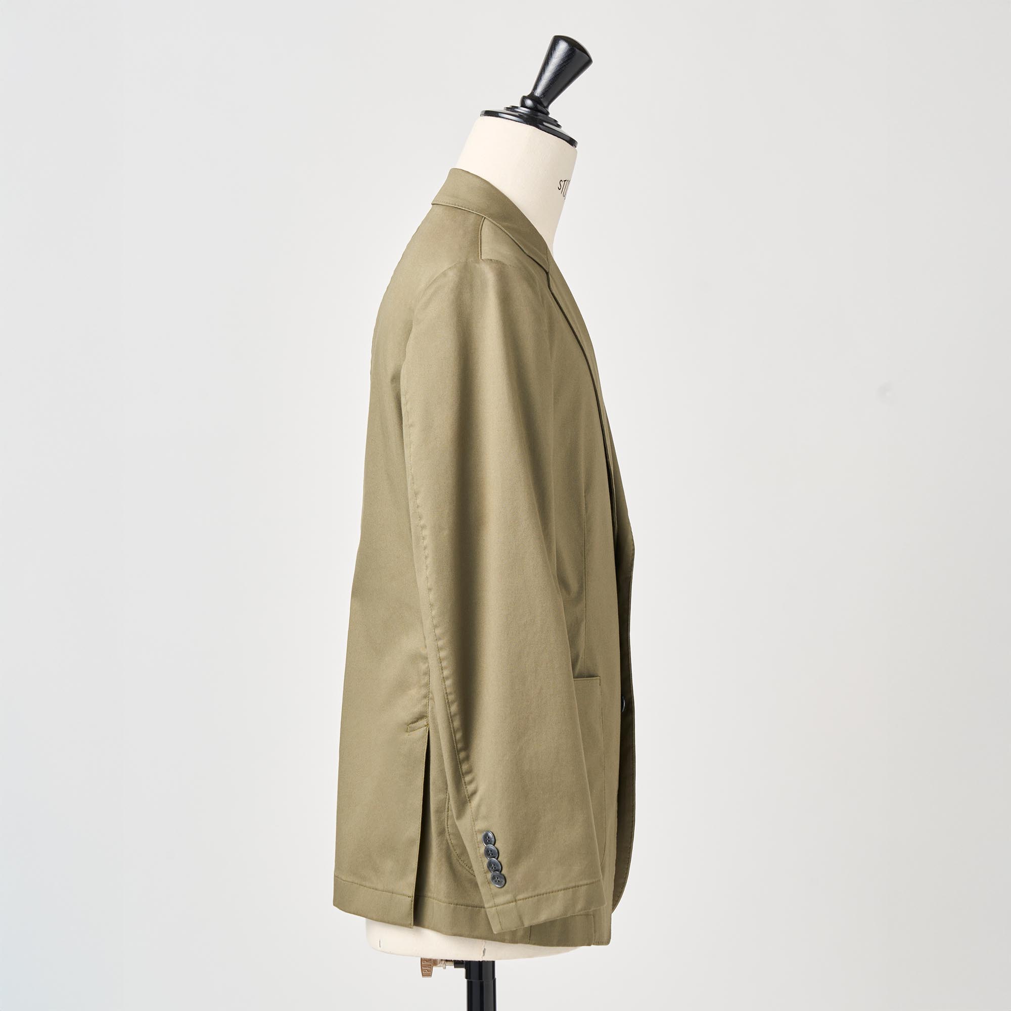 カーキのストレッチコットンを使用し、製品に仕立ててからガーメントウォッシュ加工を施してカジュアル感を出したジャケットです。芯地や裏地を省いて軽く仕立てました。