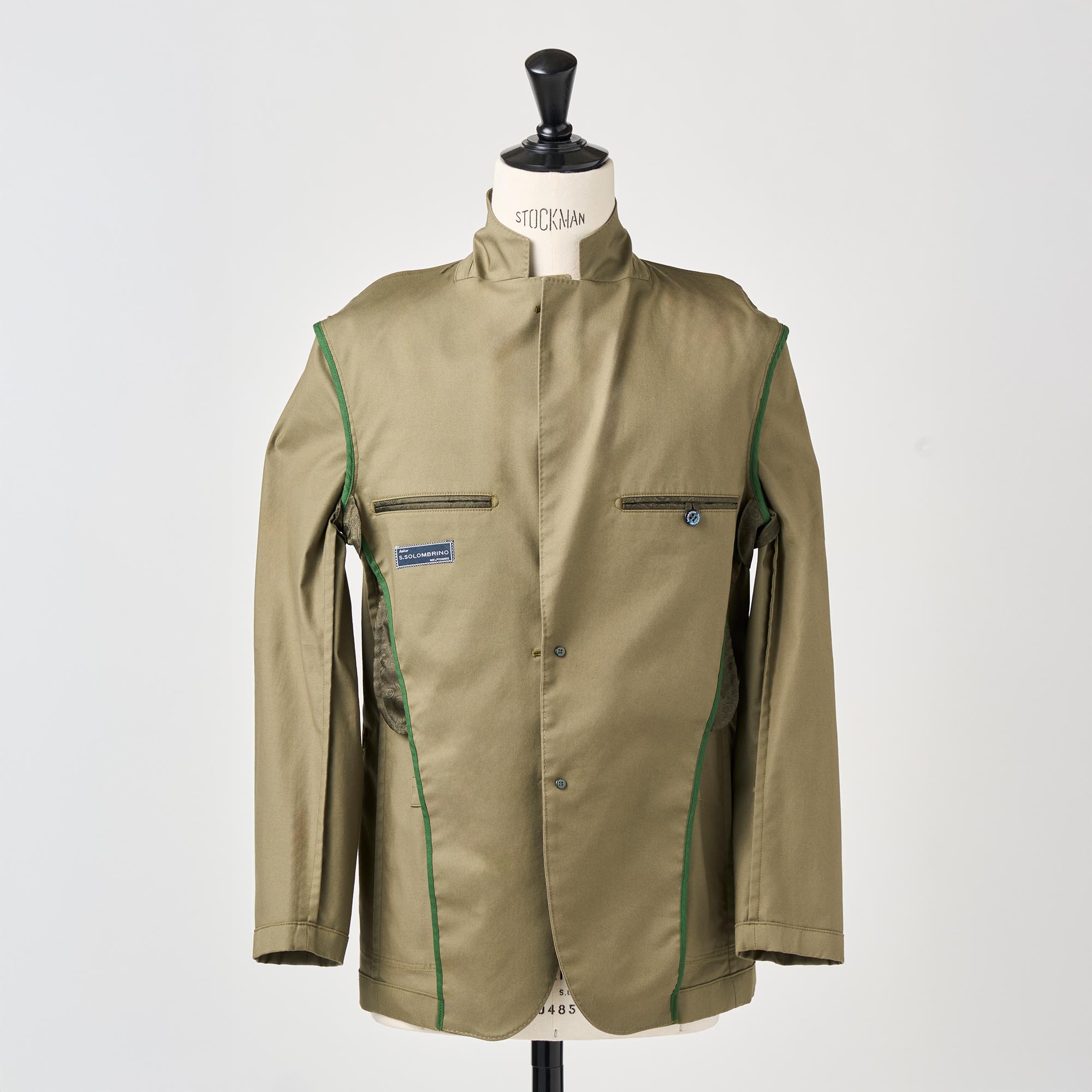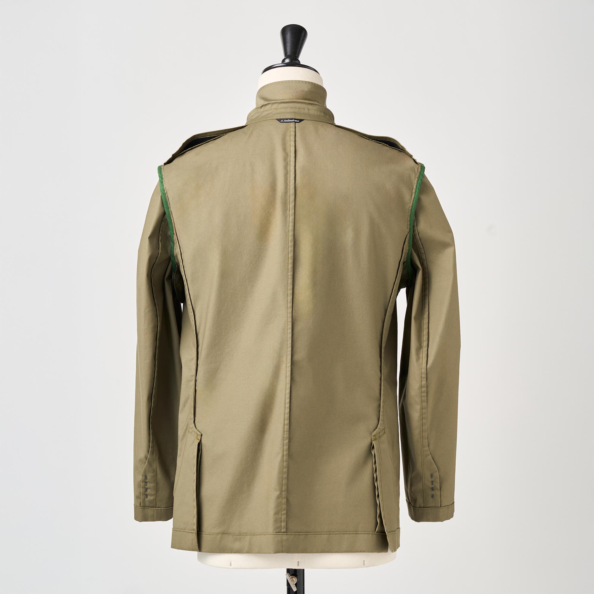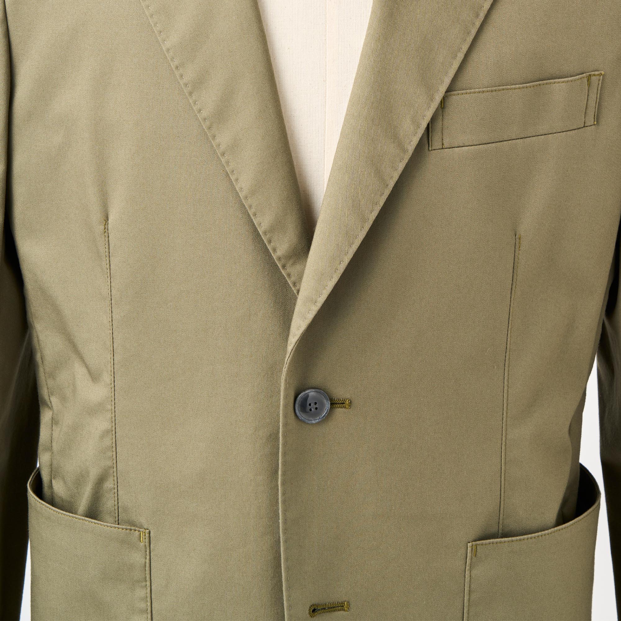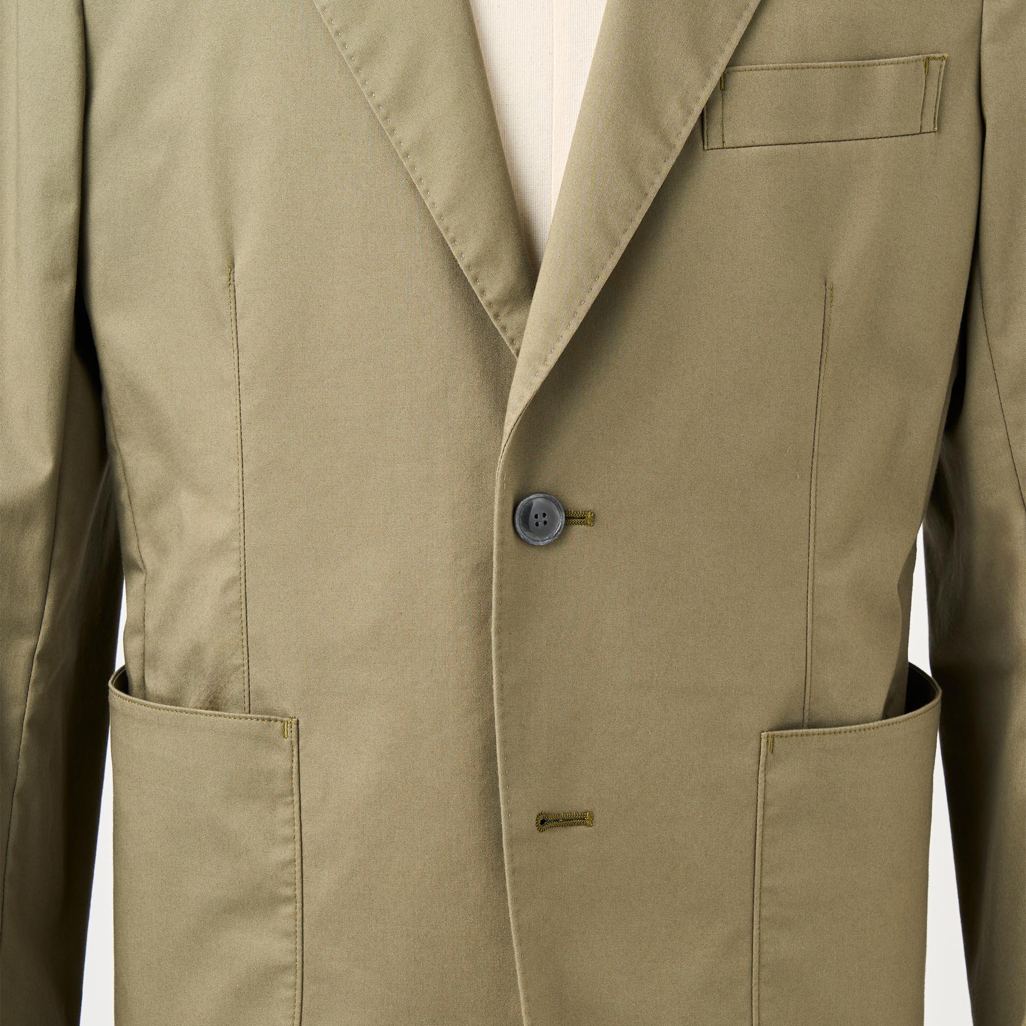 カーキのストレッチコットンを使用し、製品に仕立ててからガーメントウォッシュ加工を施してカジュアル感を出したジャケットです。芯地や裏地を省いて軽く仕立てました。