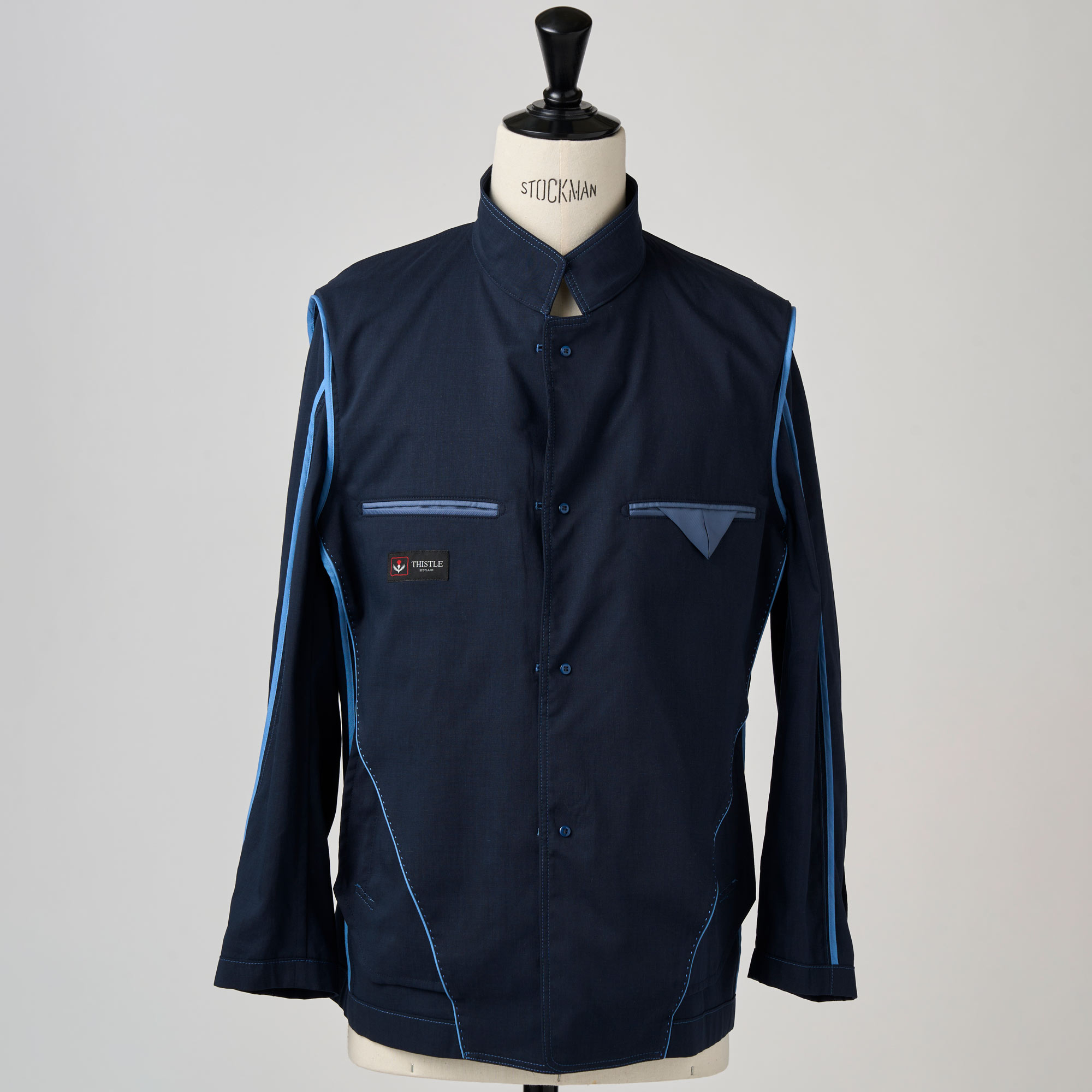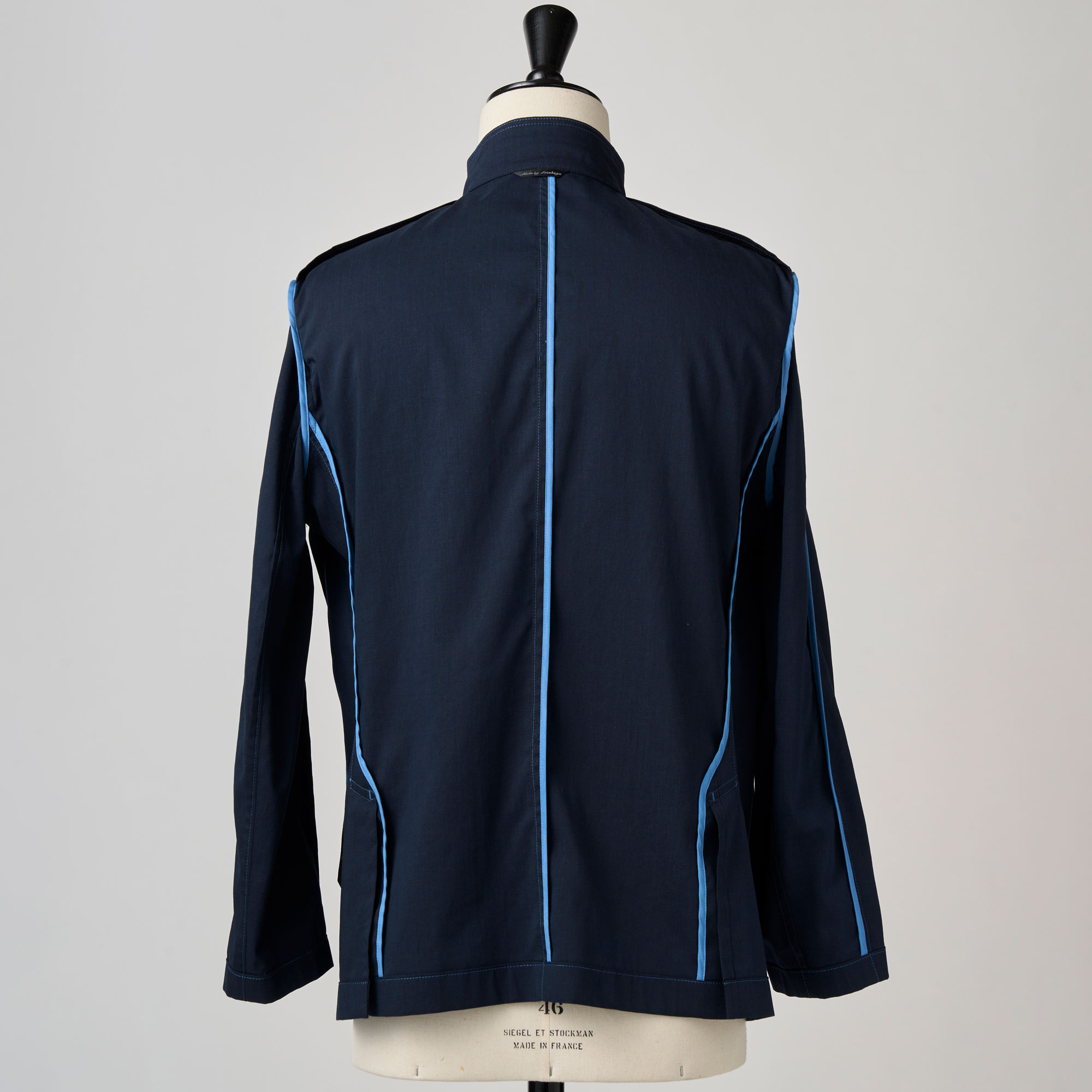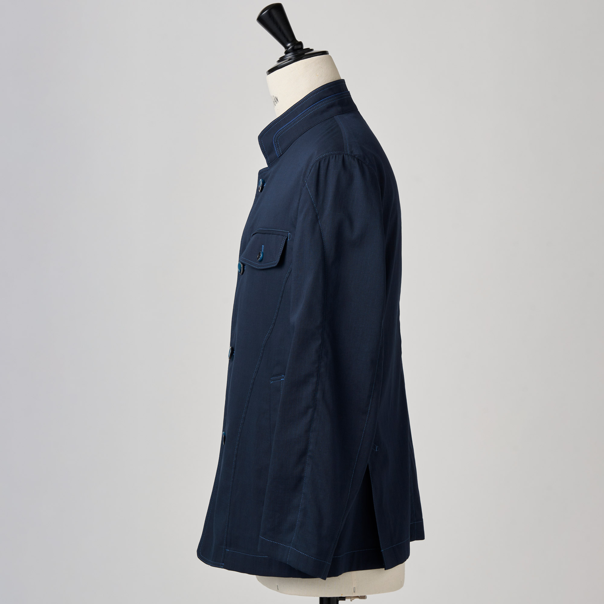 非常に薄手のポリエステルリネン素材を使用し、シャツのような感覚で仕立てたスタンドカラーのジャケットです。ポリエステルとリネンを混紡したハイブリット素材です。お互いの弱点を補い合うこの素材はリネン100%だと深くシワが入りますが、ポリエステルが入ることで復元力が加わり、清涼感はあるのに、だらしなく見えない、絶妙な質感をキープします。汗をかいてもすぐ乾き、夏場のデイリーユースに最適です。クラシックなスタイルとは一線を画す、現代的な機能性と東洋的なモード感が融合した非常にスマートな一着です。