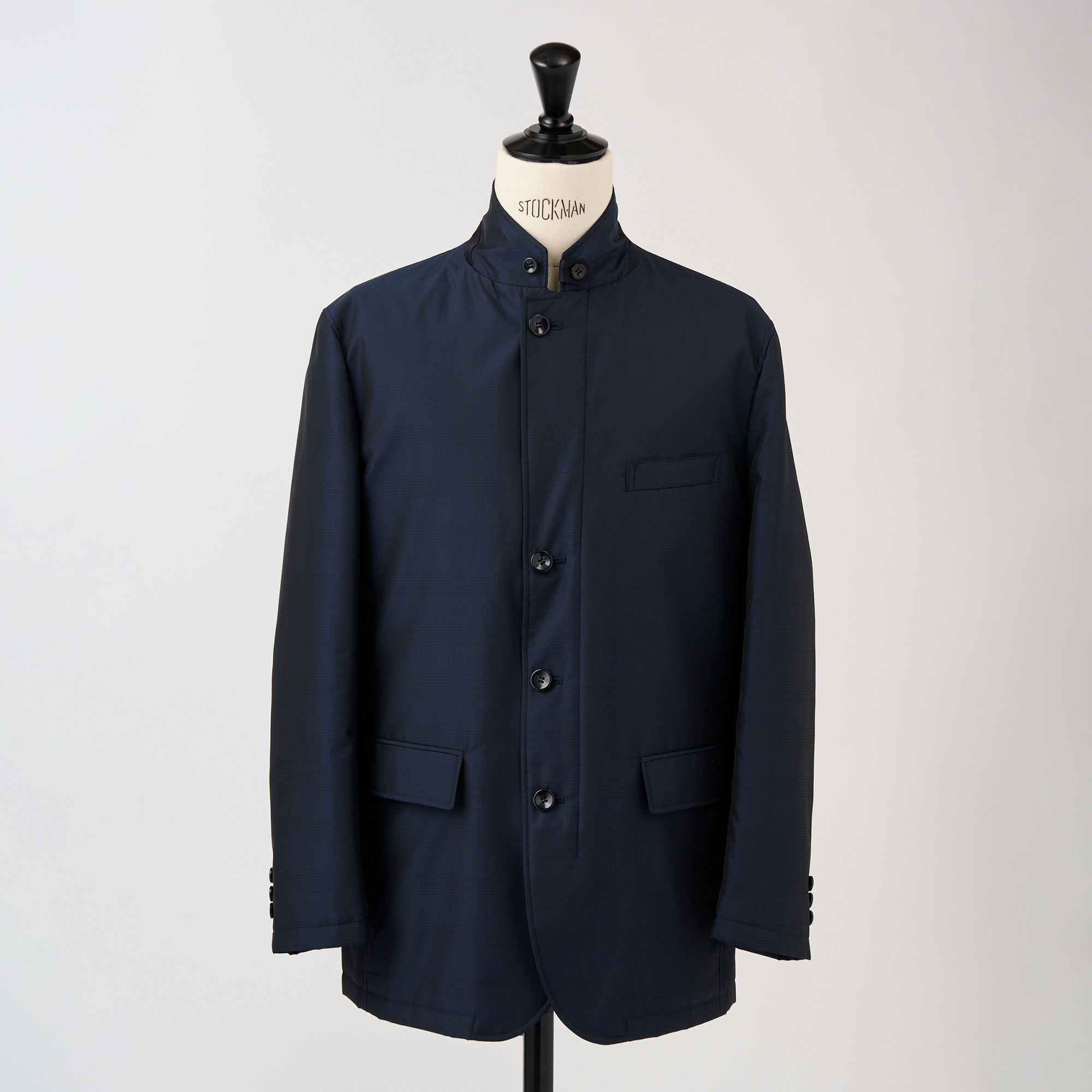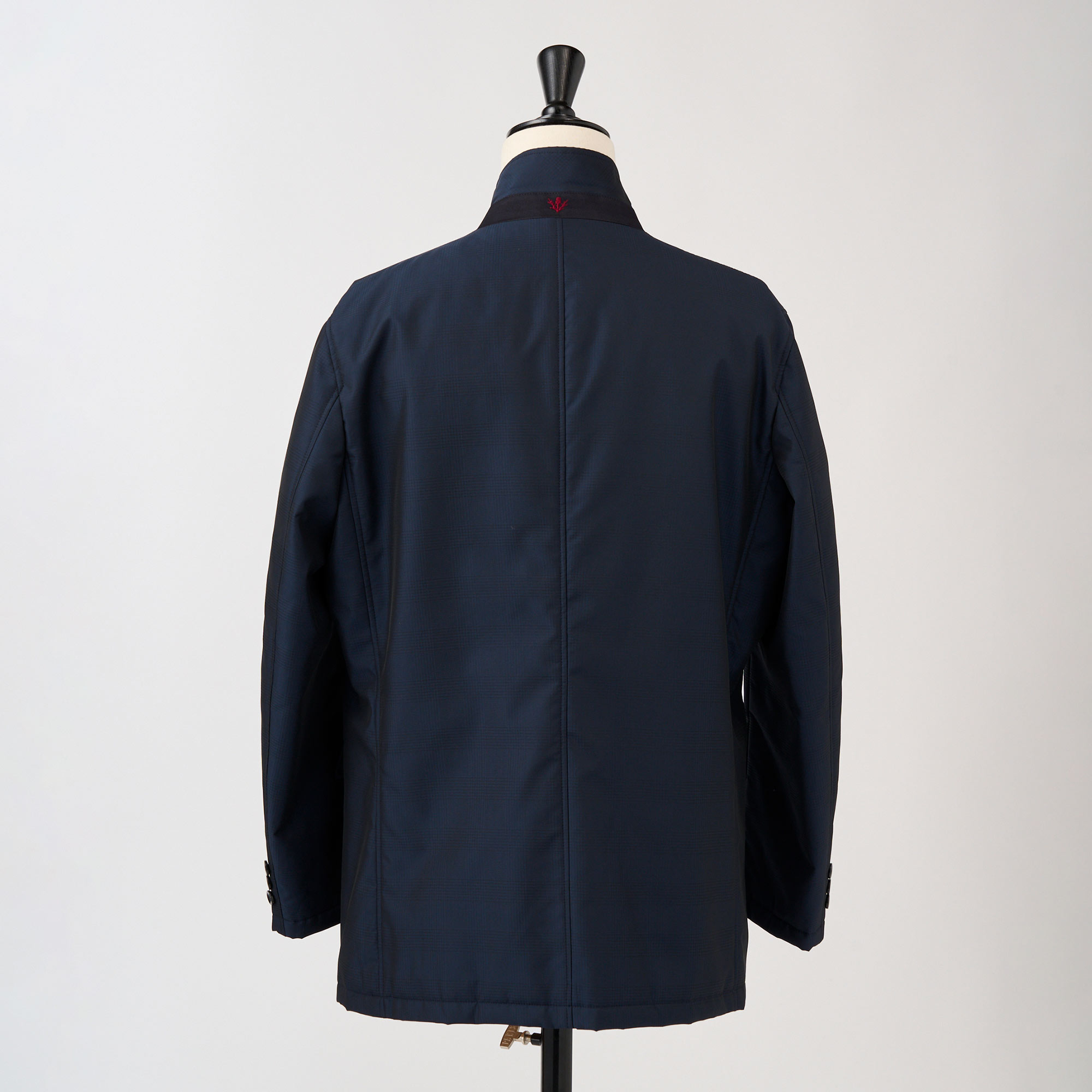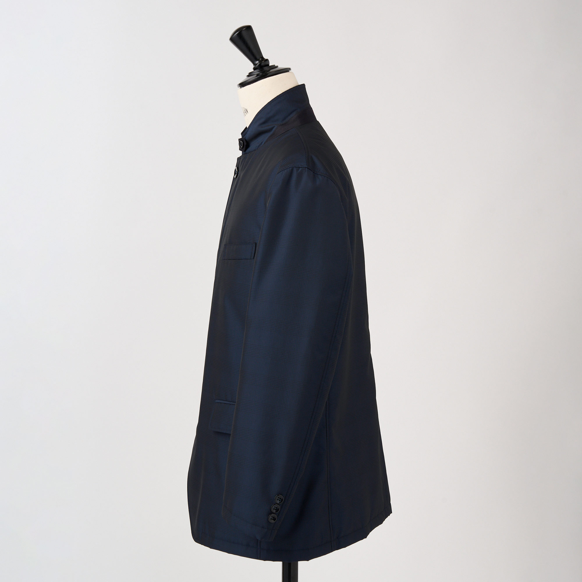 撥水性のあるグレンチェック柄のポリエステル素材を使用した中綿入り仕立てのジャケット。ラペルは立てても寝かせても使用出来る2Wayカラーのデザインです。