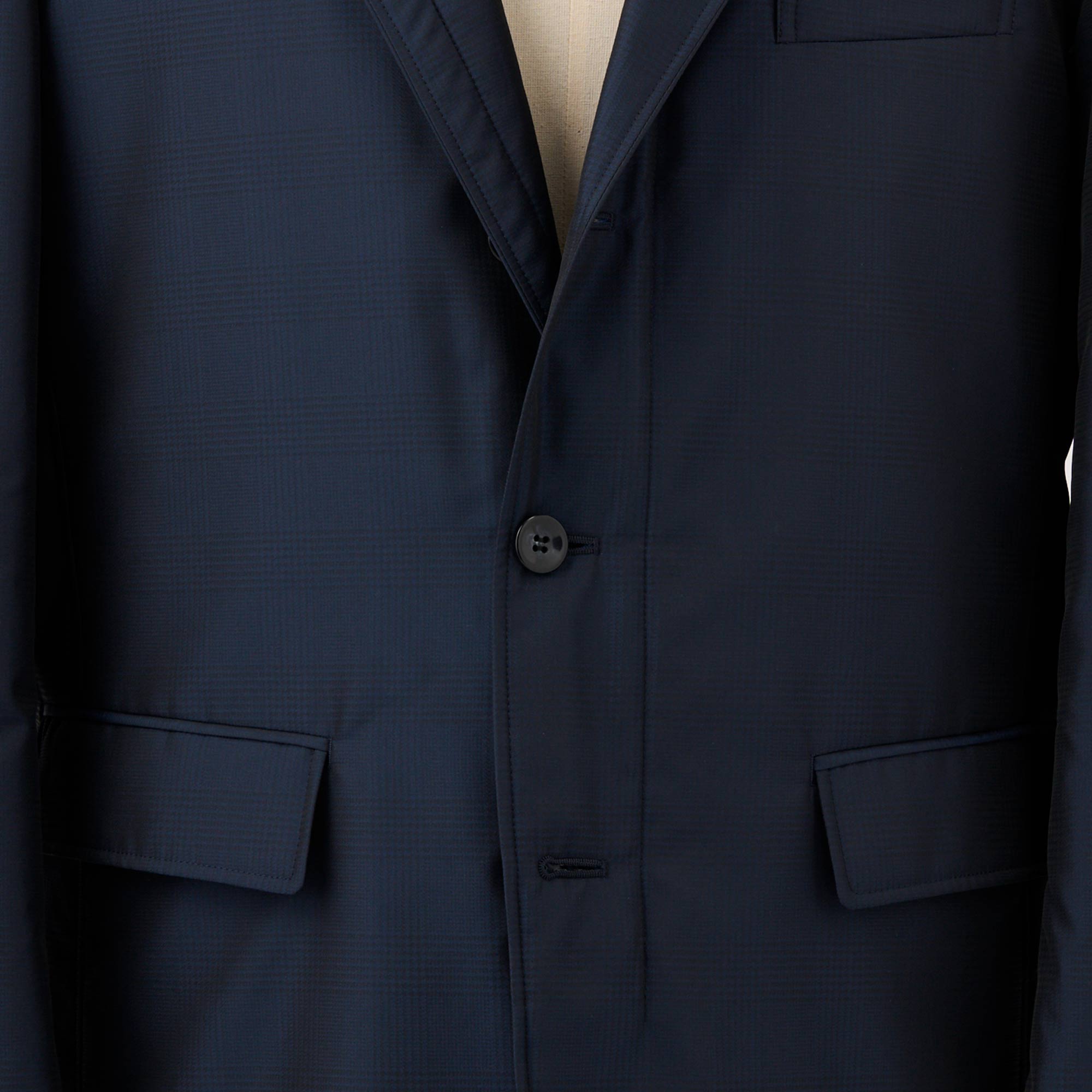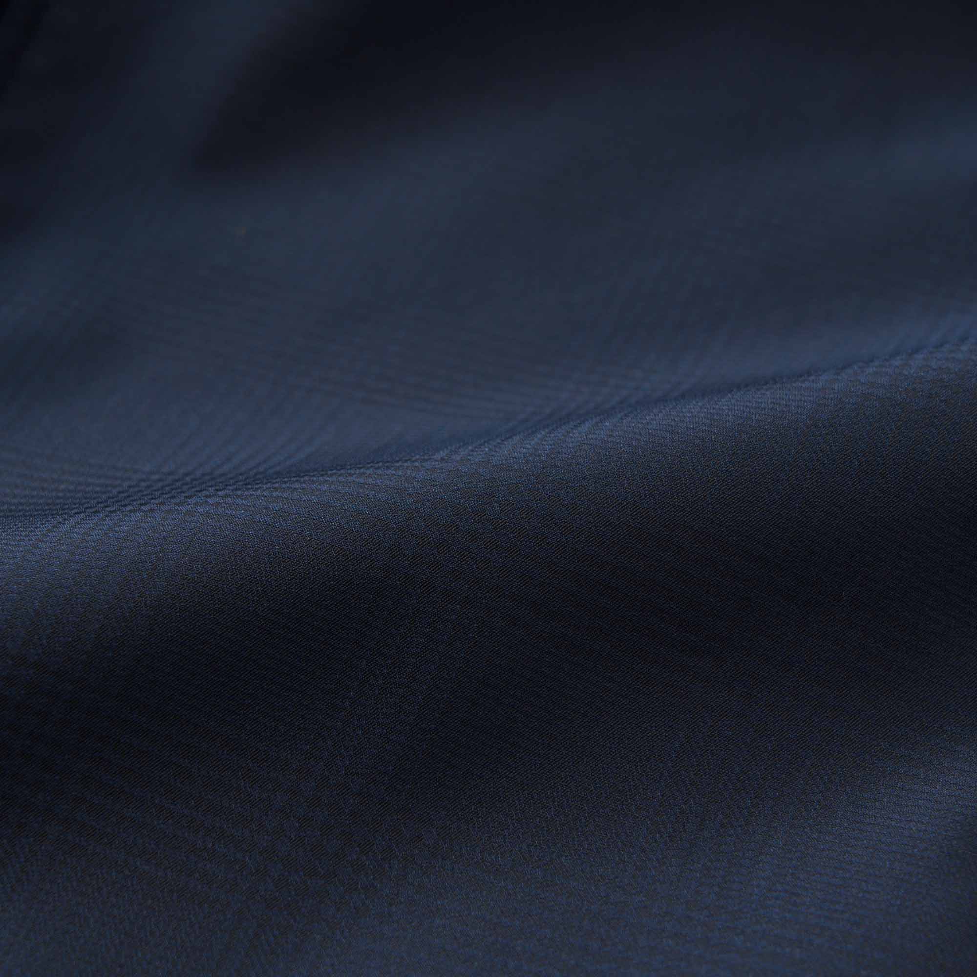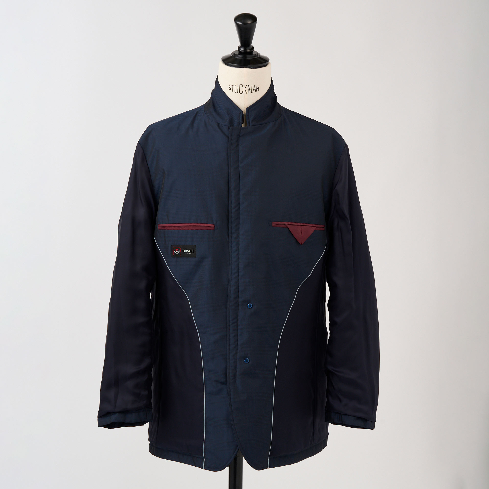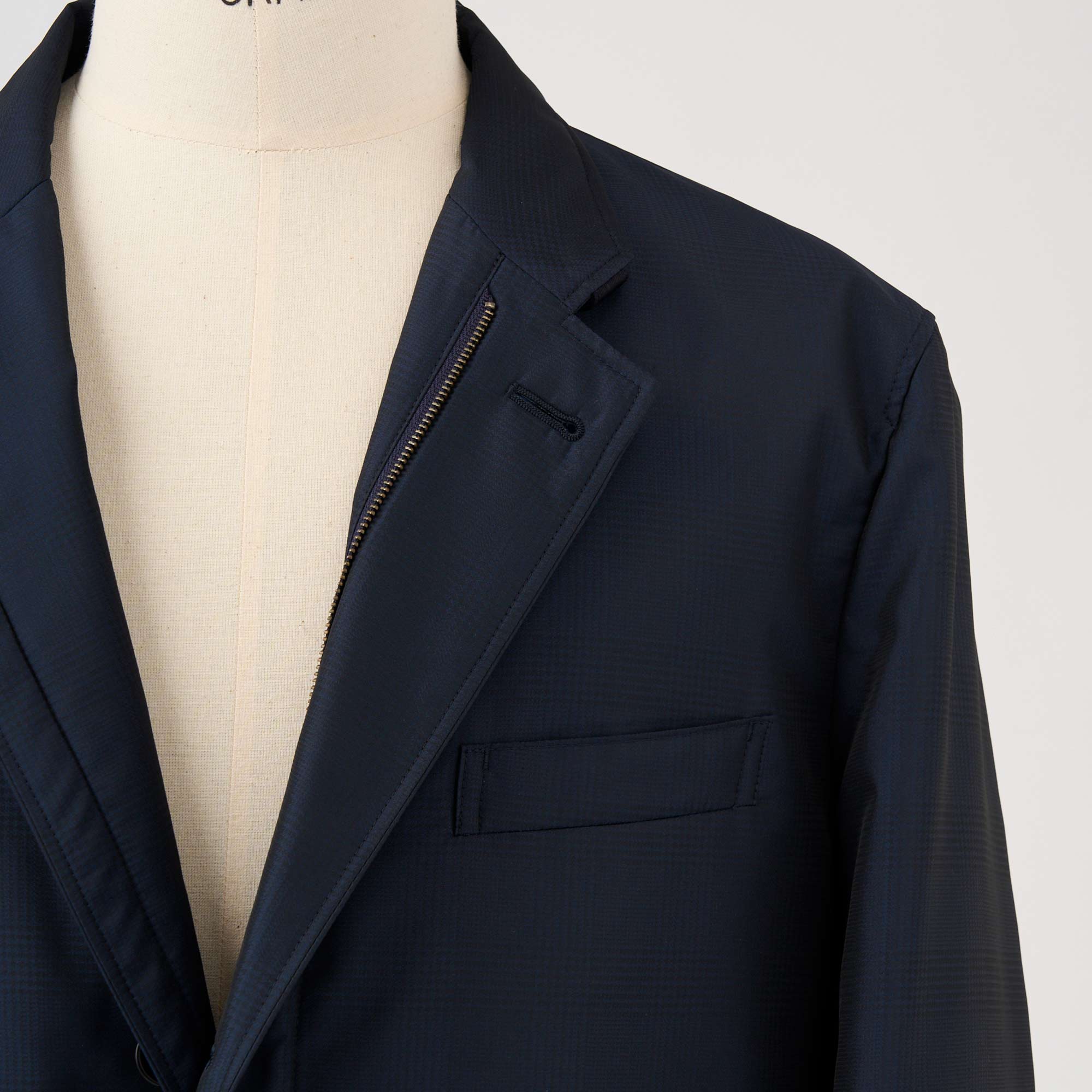 撥水性のあるグレンチェック柄のポリエステル素材を使用した中綿入り仕立てのジャケット。ラペルは立てても寝かせても使用出来る2Wayカラーのデザインです。