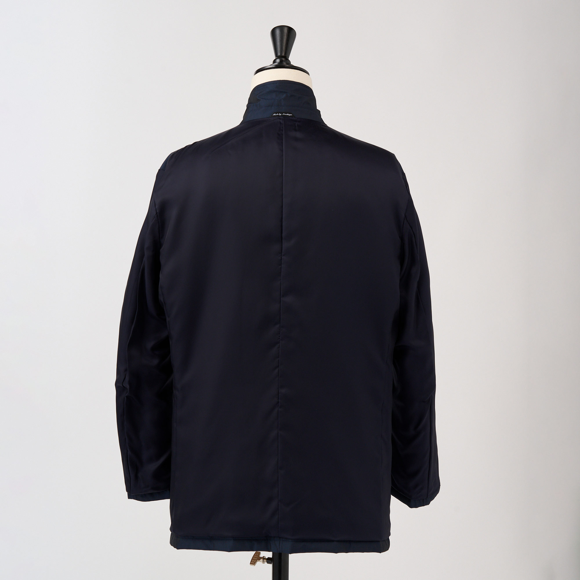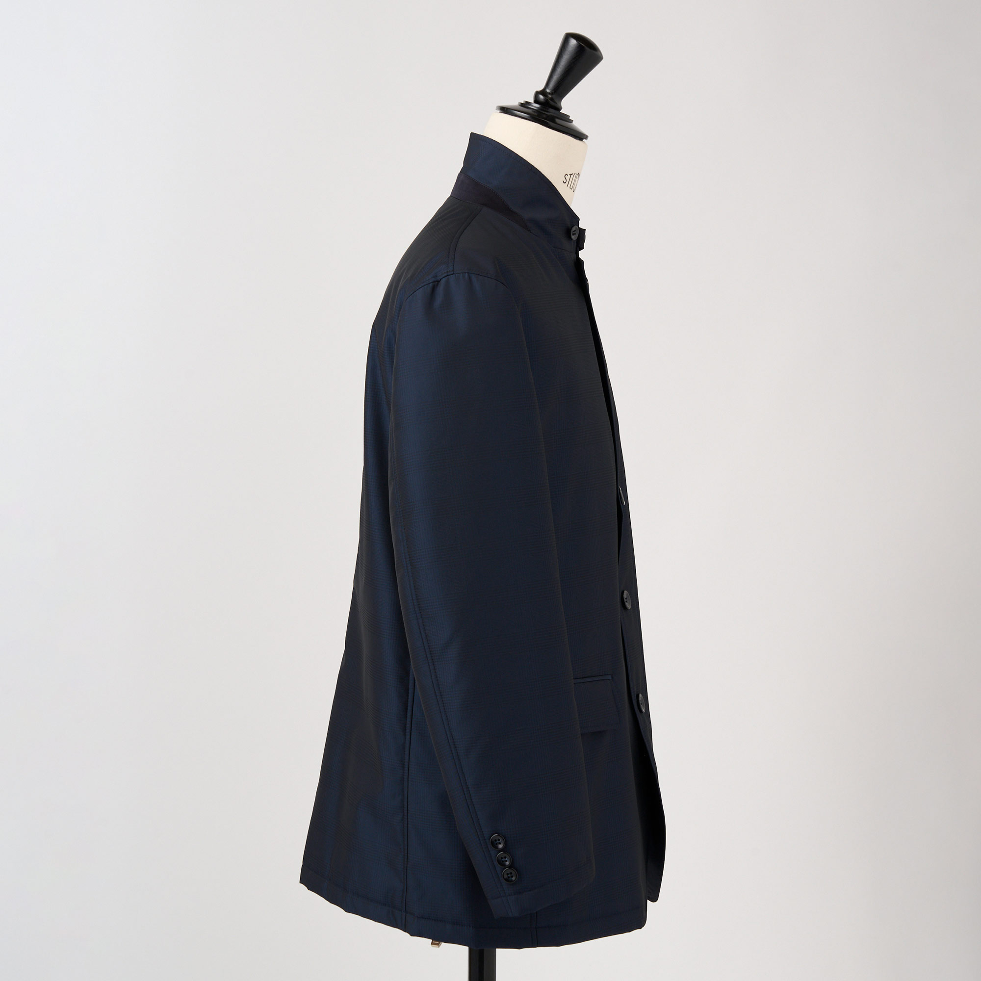 衿を立てた時に風が入らない様にフロントにはファスナーを付けています。優れた保温性があり、軽くシワにもなりづらいので長時間の着用やトラベルジャケットとしても最適な1着です。