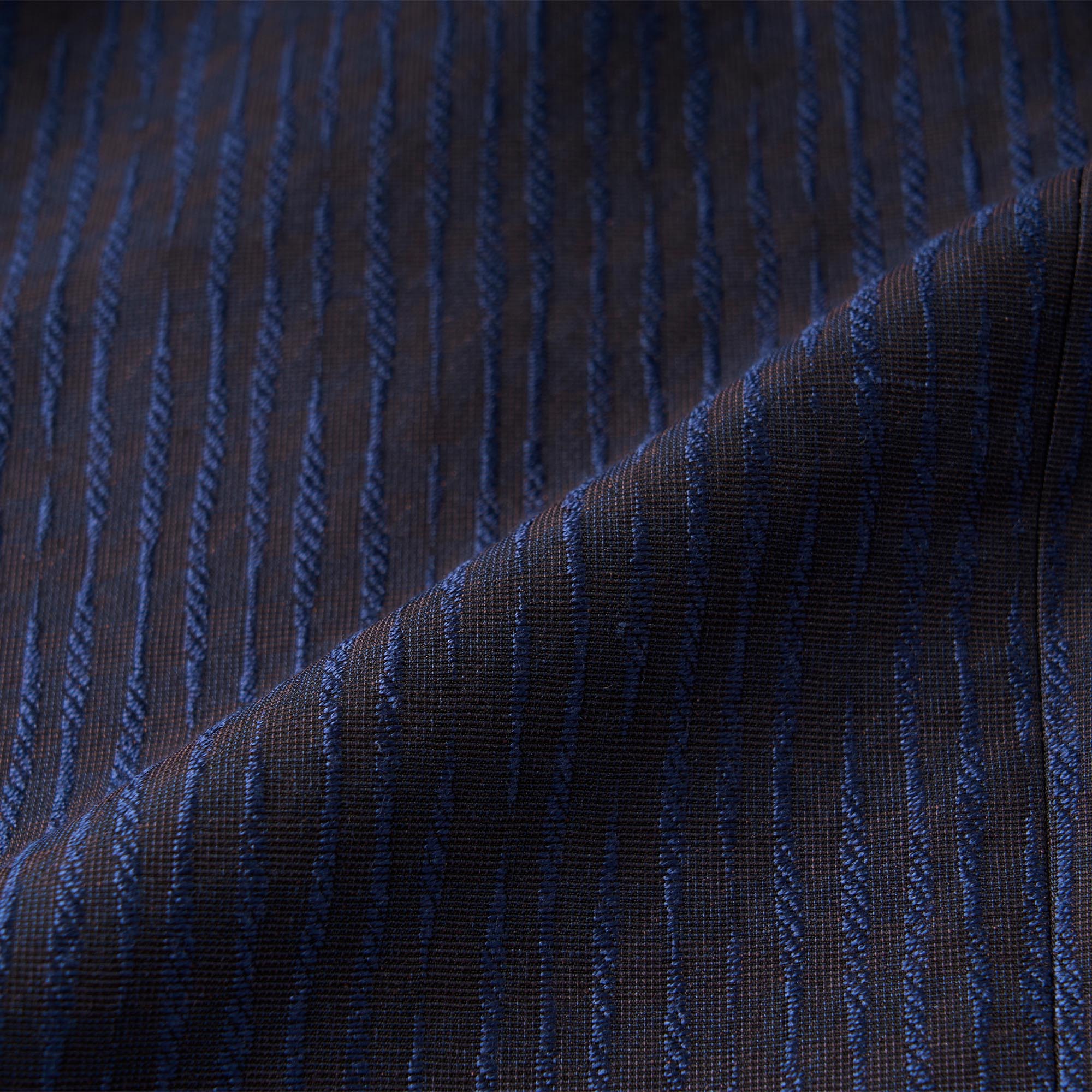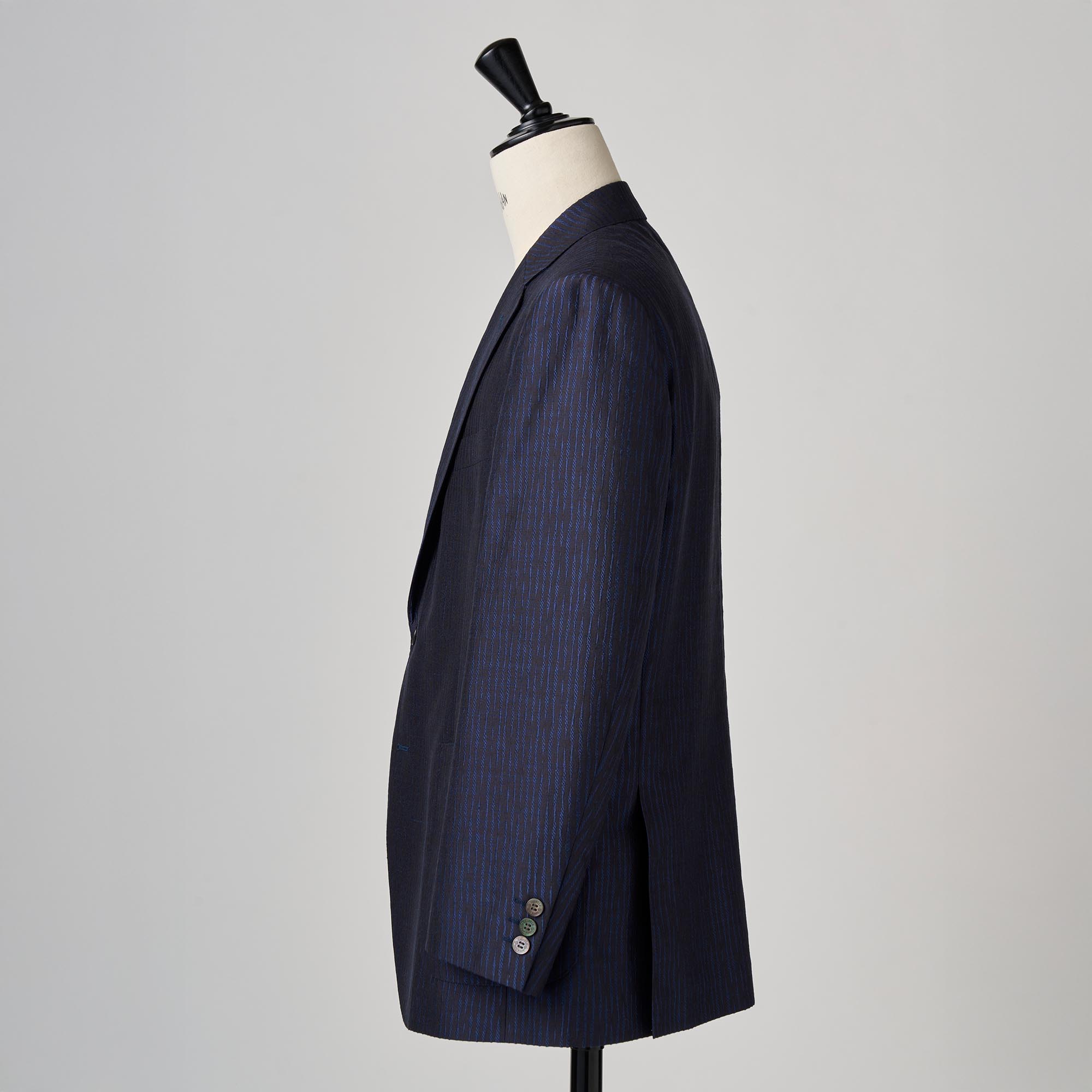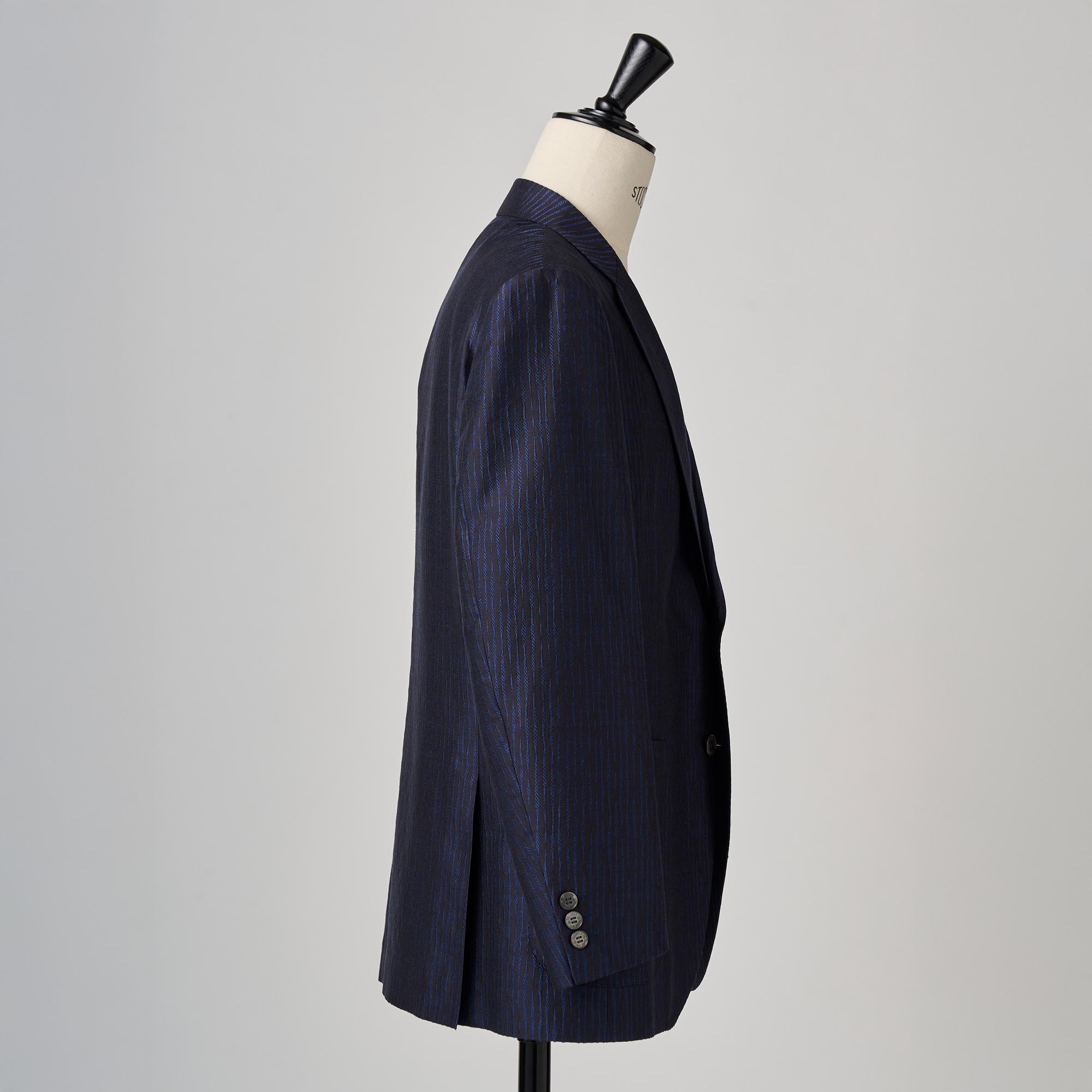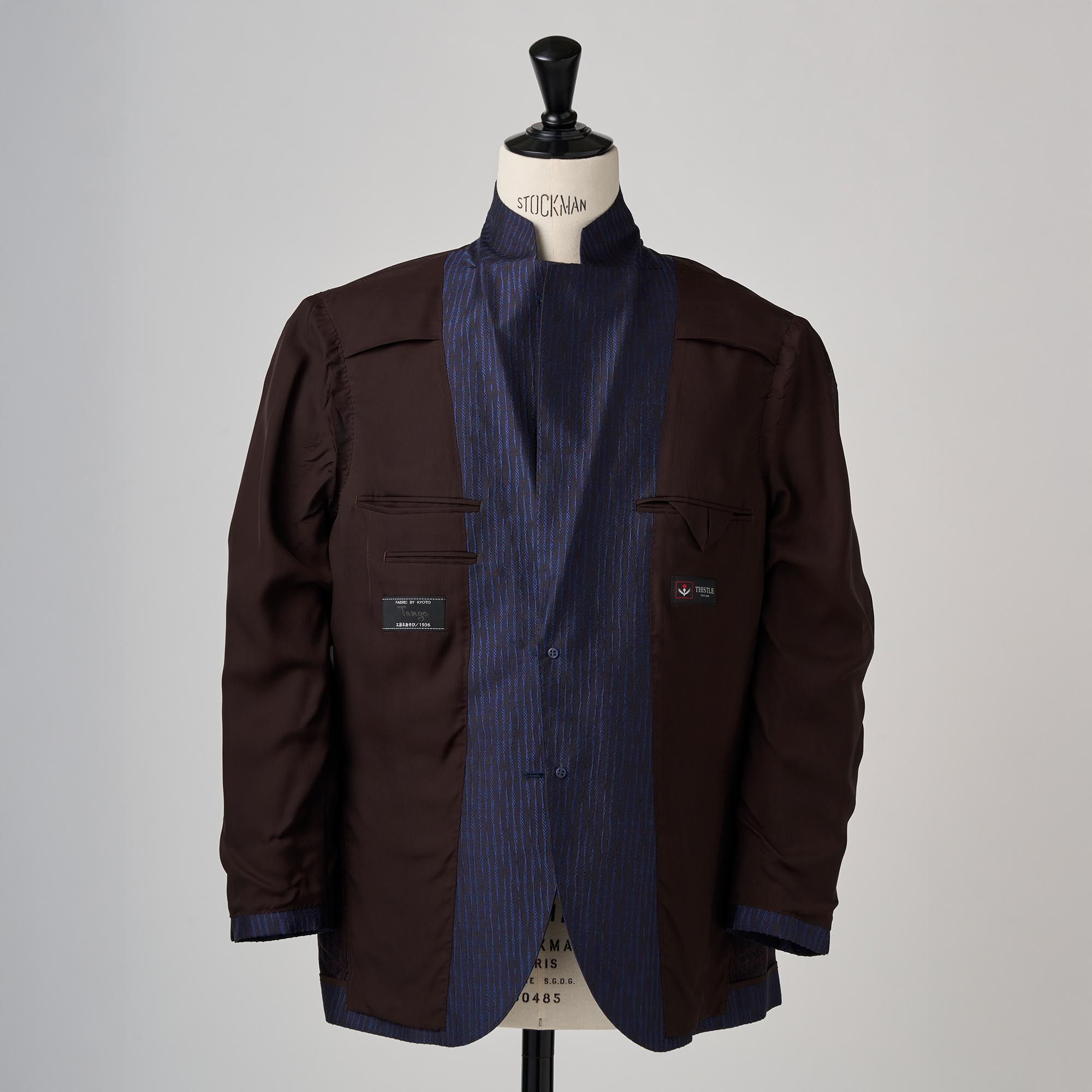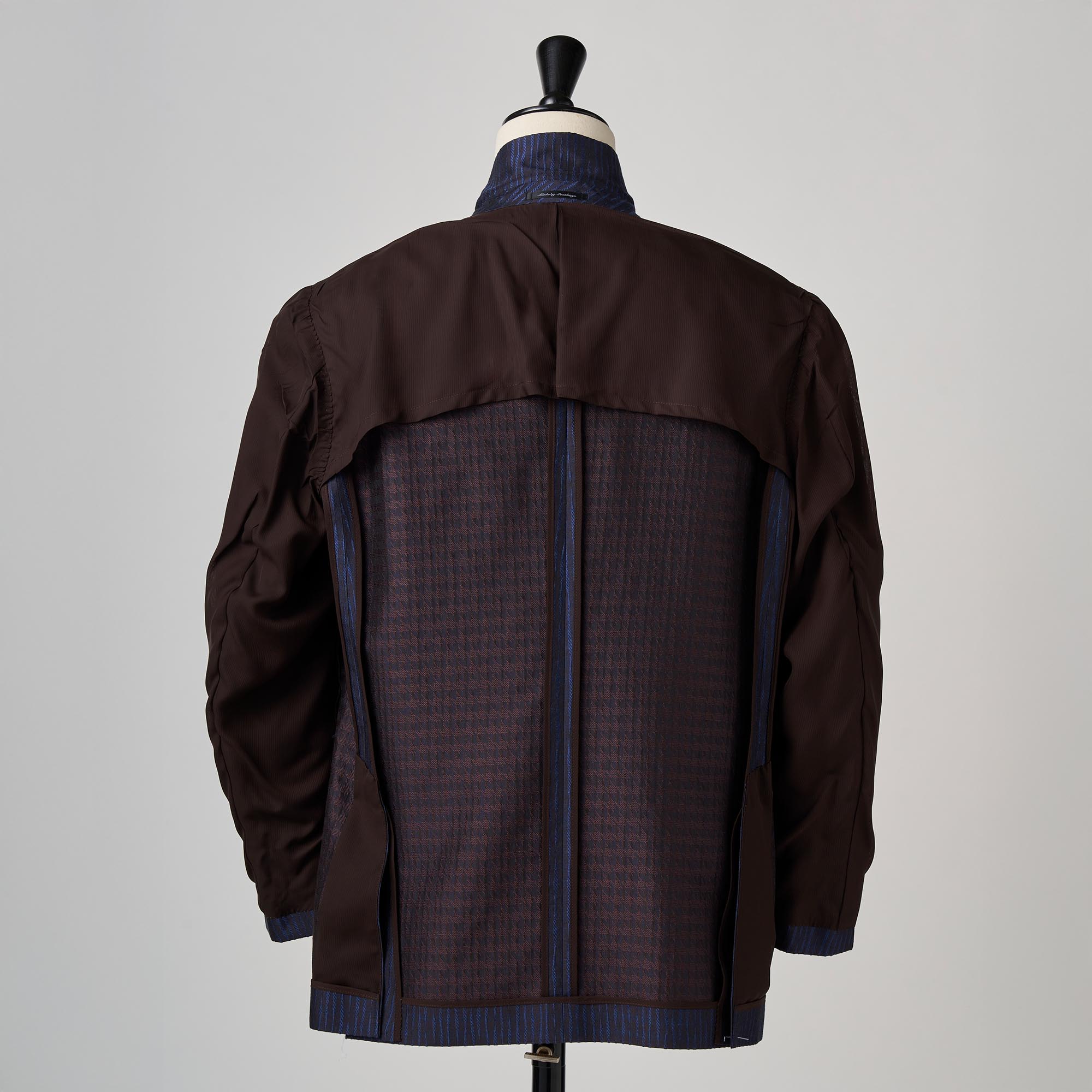 シルクの産地、京都府丹後地域の生地メーカーとのコラボレーションから生まれたシルク100%のダブルフェイス生地を使用したジャケットです。軽量でありながら芯地をしっかりと使用して構築的に仕立てています。表面にネイビー、裏面にブラウンのカラーが出る特殊な織り組織の素材です。