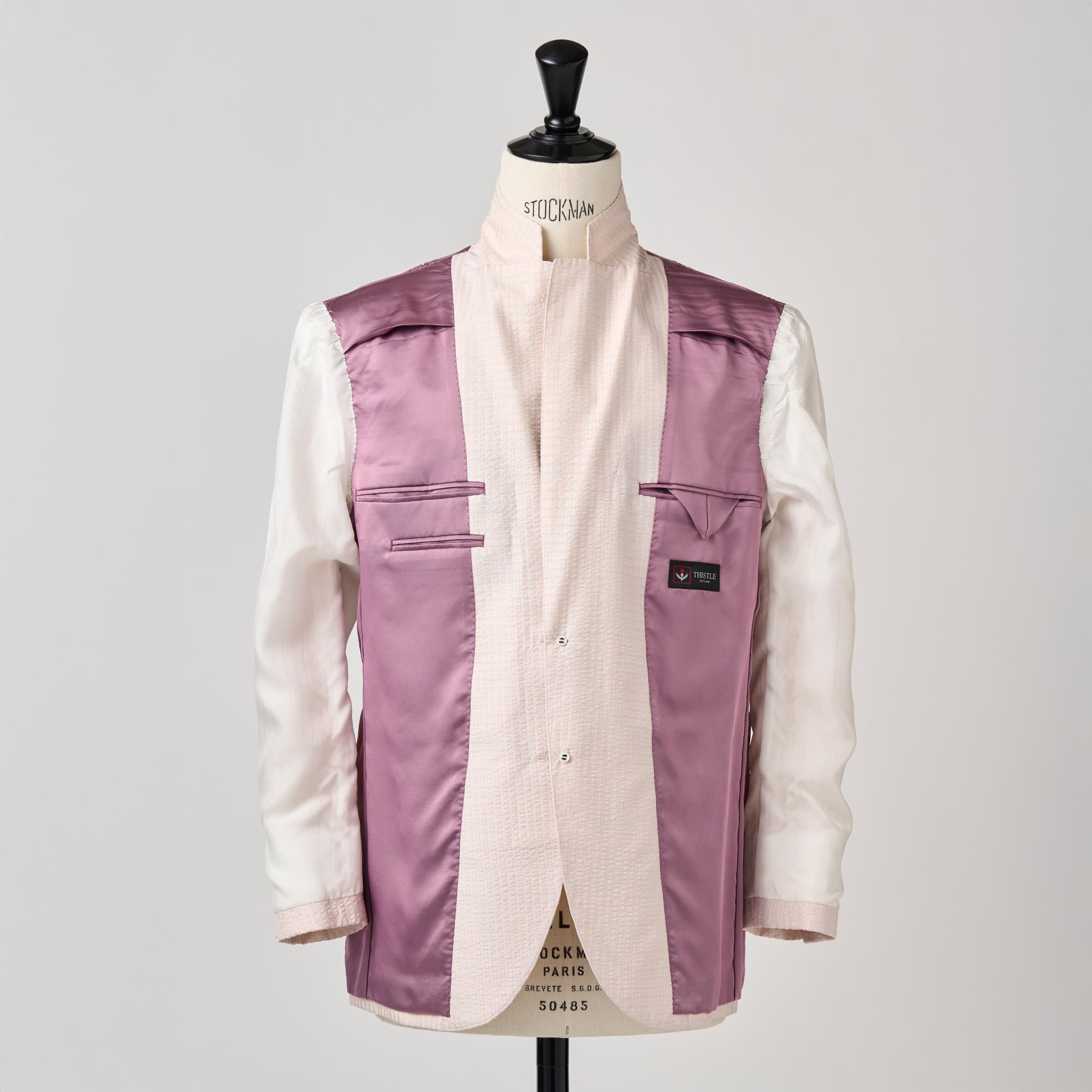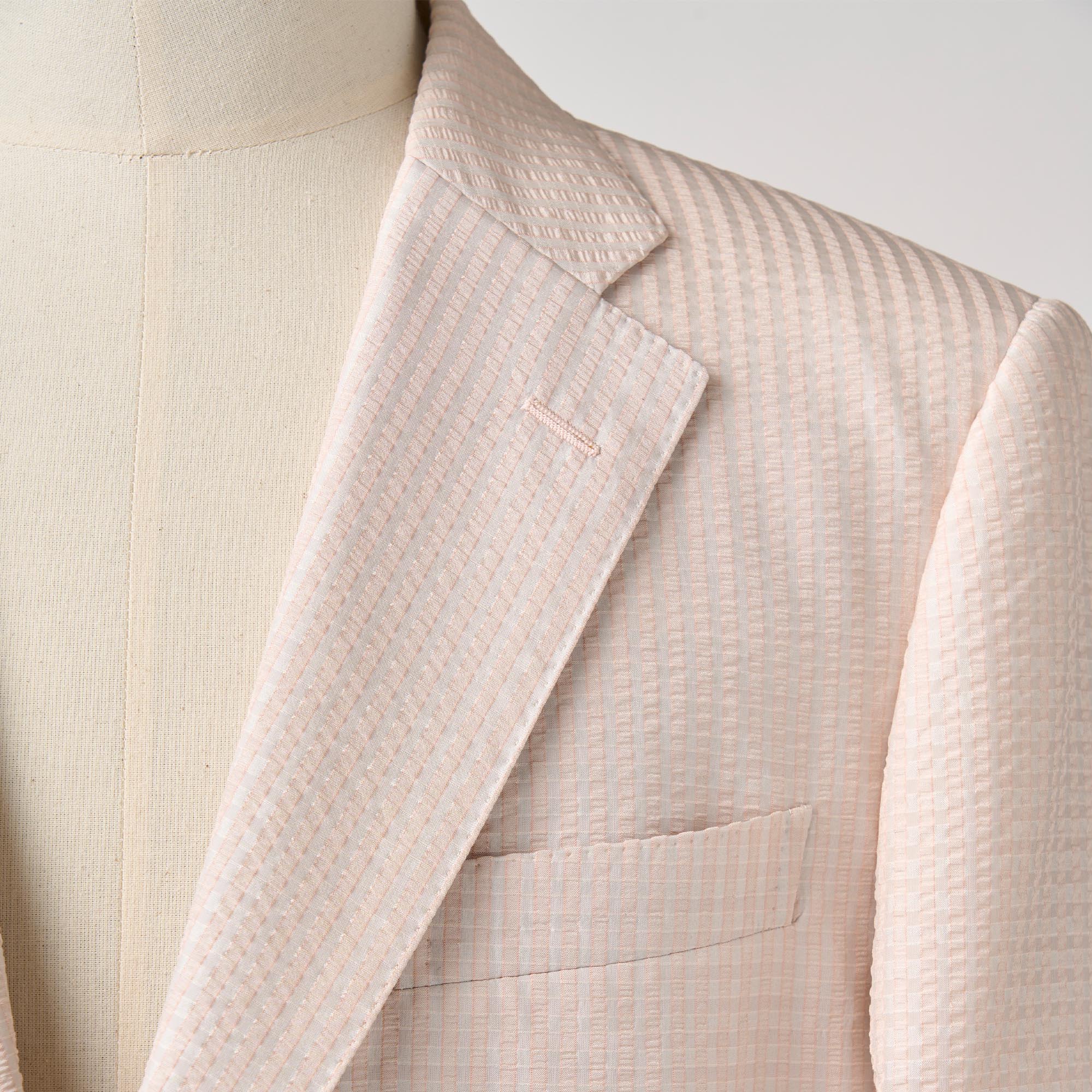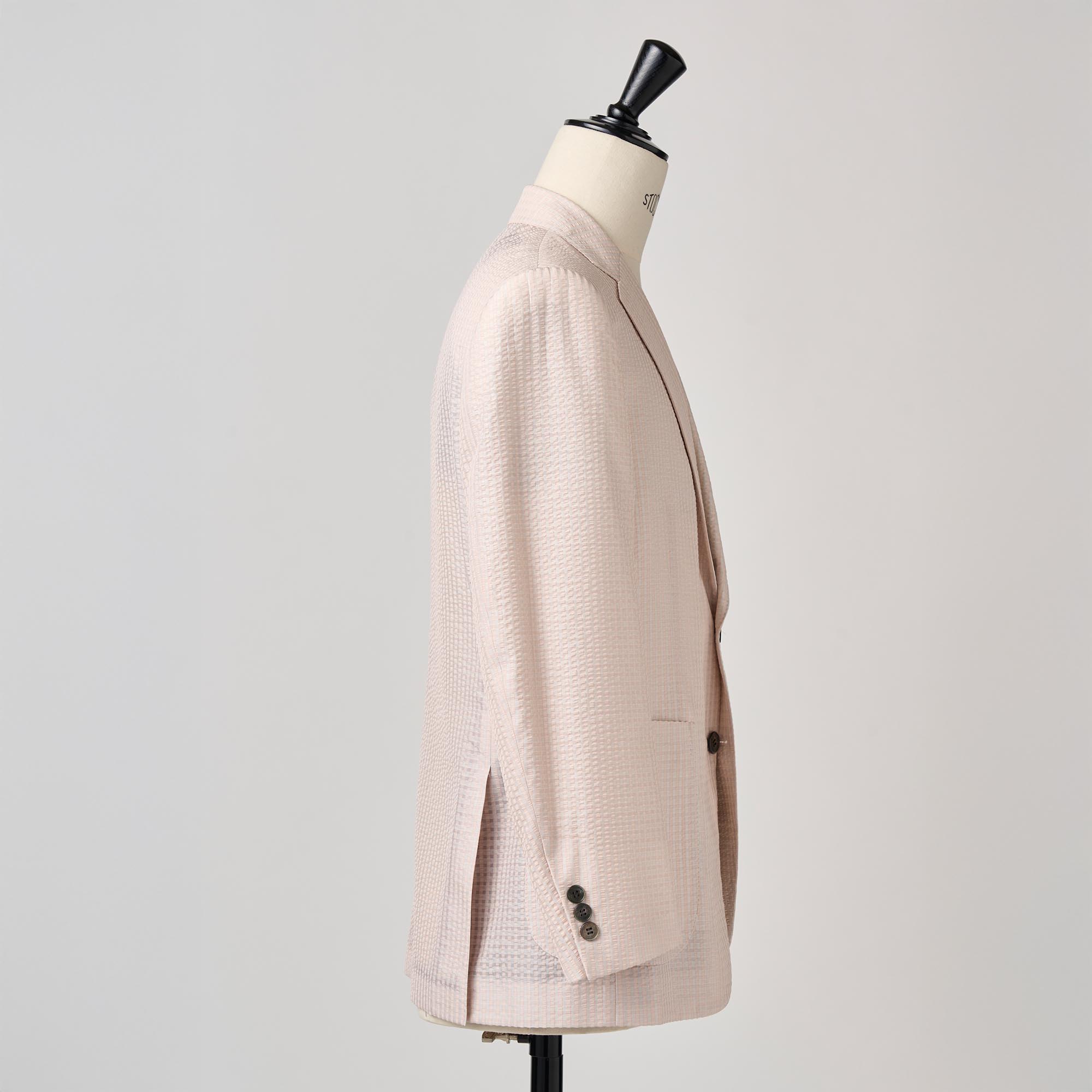 シルクの産地、山形県米沢市の生地メーカーとのコラボレーションから生まれたシルク100%のサッカー生地の軽い仕立てのジャケットです。サッカー生地特有の凹凸(シボ)に光が当たるとシルク特有の繊細な艶が浮き上がり、他のサッカー地とは一線を画す高級感を放ちます。