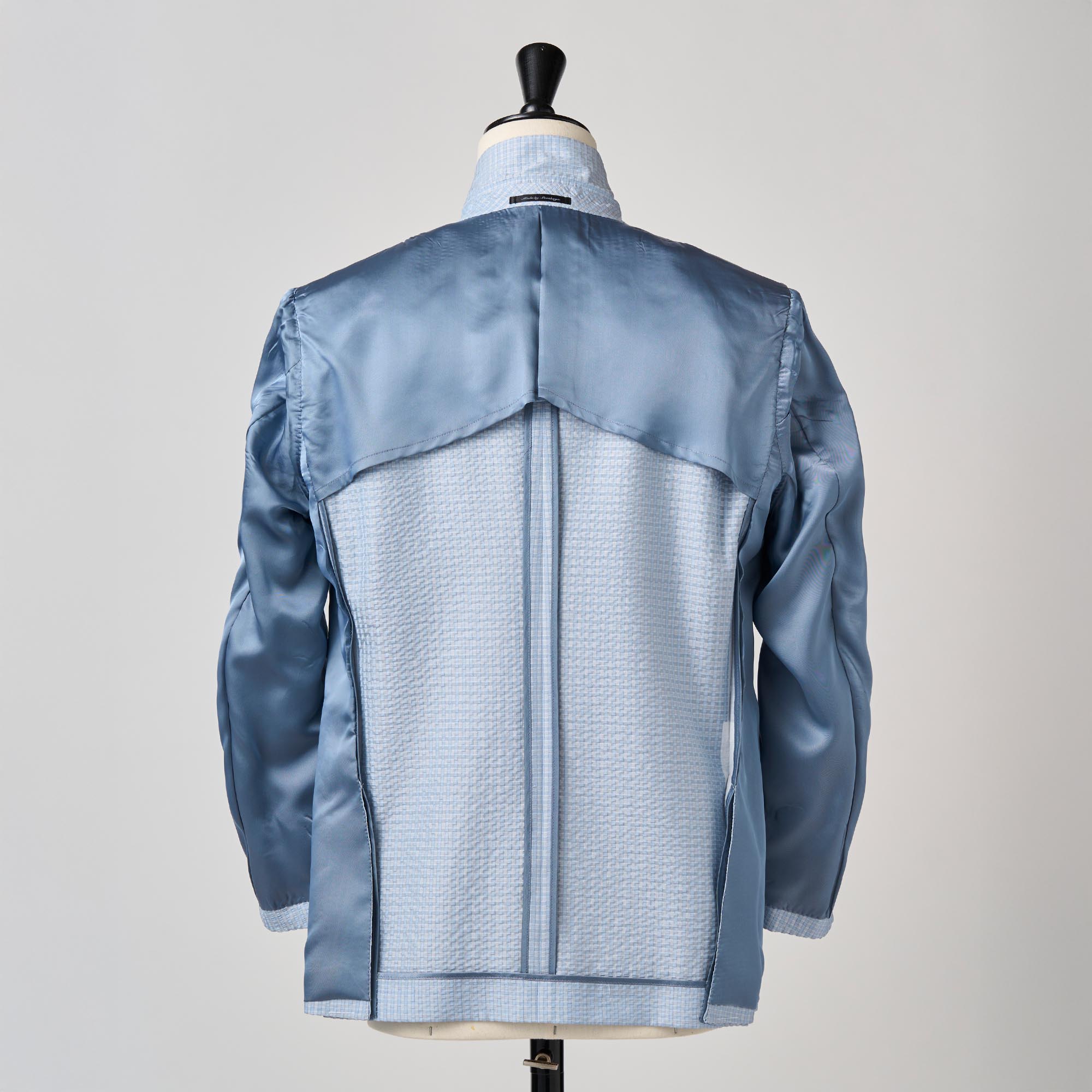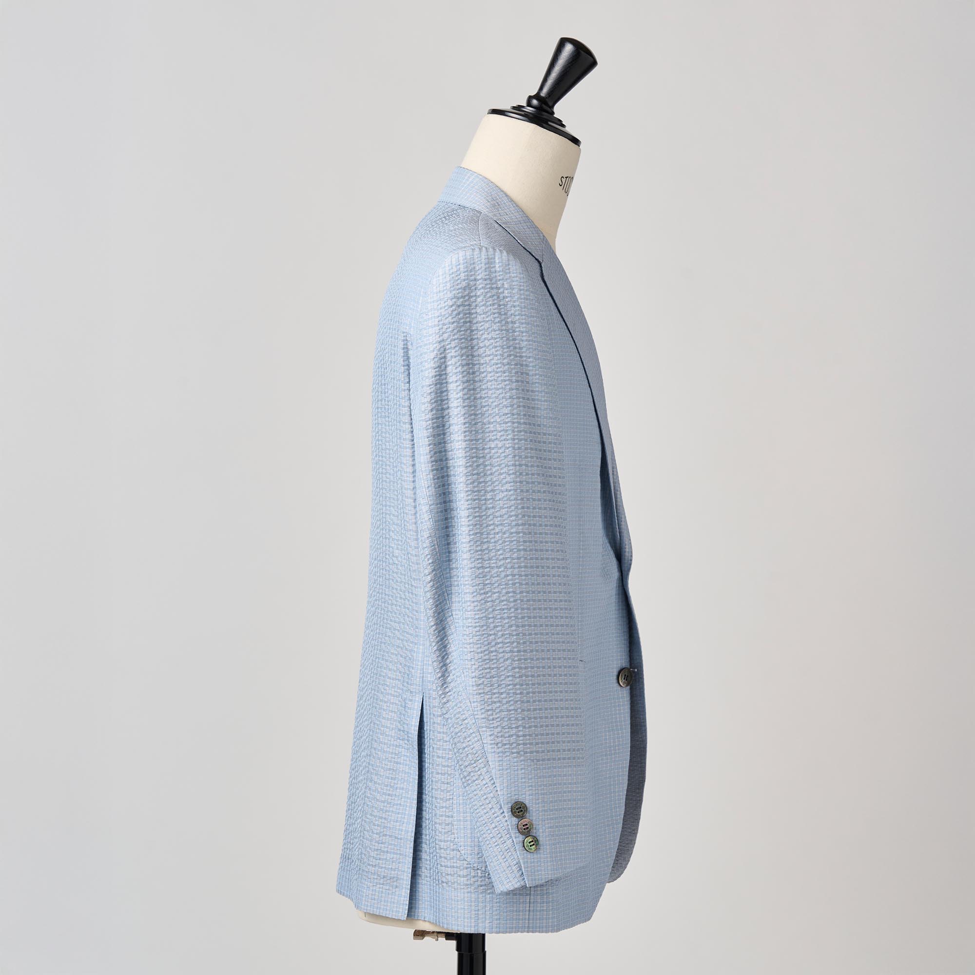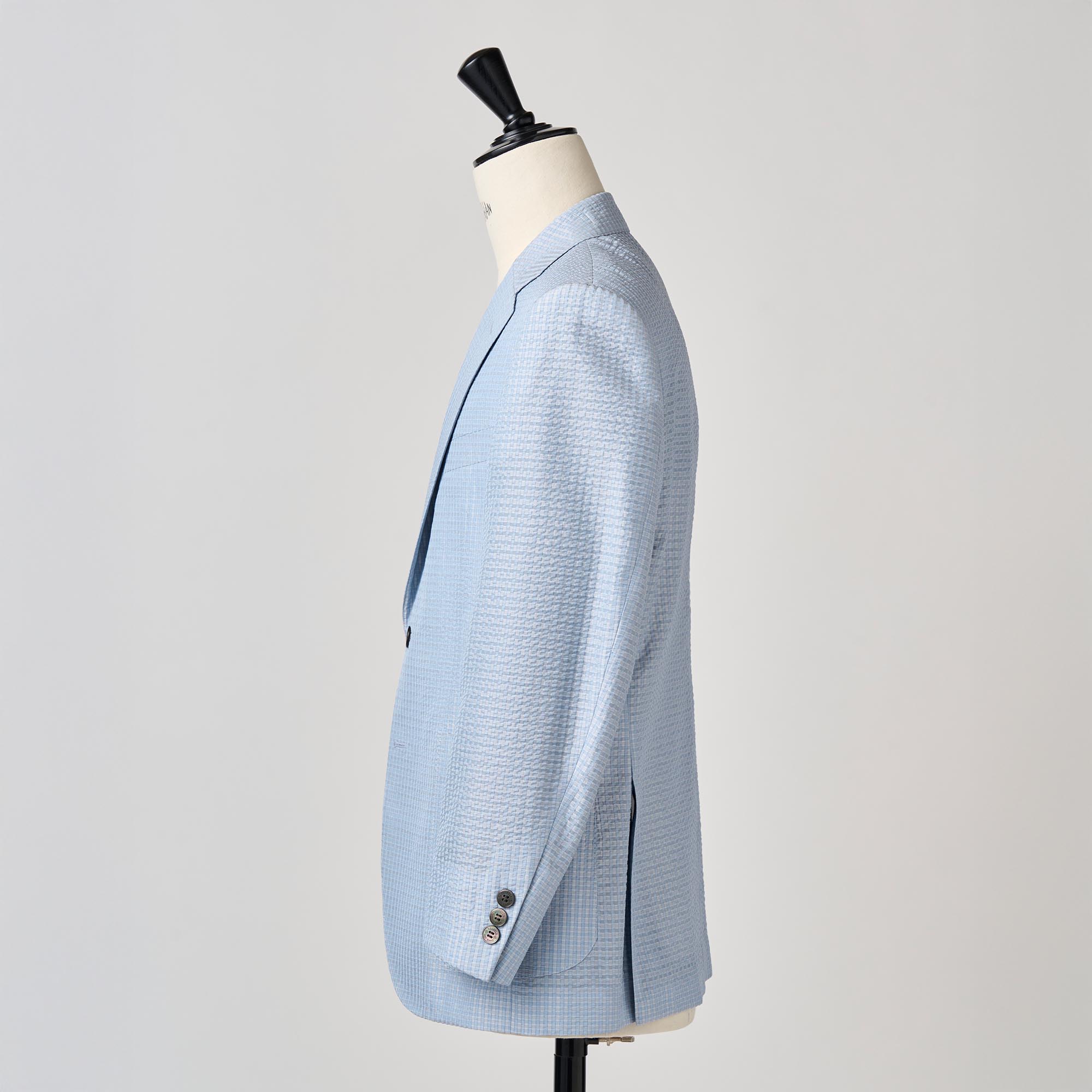 シルクの産地、山形県米沢市の生地メーカーとのコラボレーションから生まれたシルク100%のサッカー生地の軽い仕立てのジャケットです。サッカー生地特有の凹凸(シボ)に光が当たるとシルク特有の繊細な艶が浮き上がり、他のサッカー地とは一線を画す高級感を放ちます。