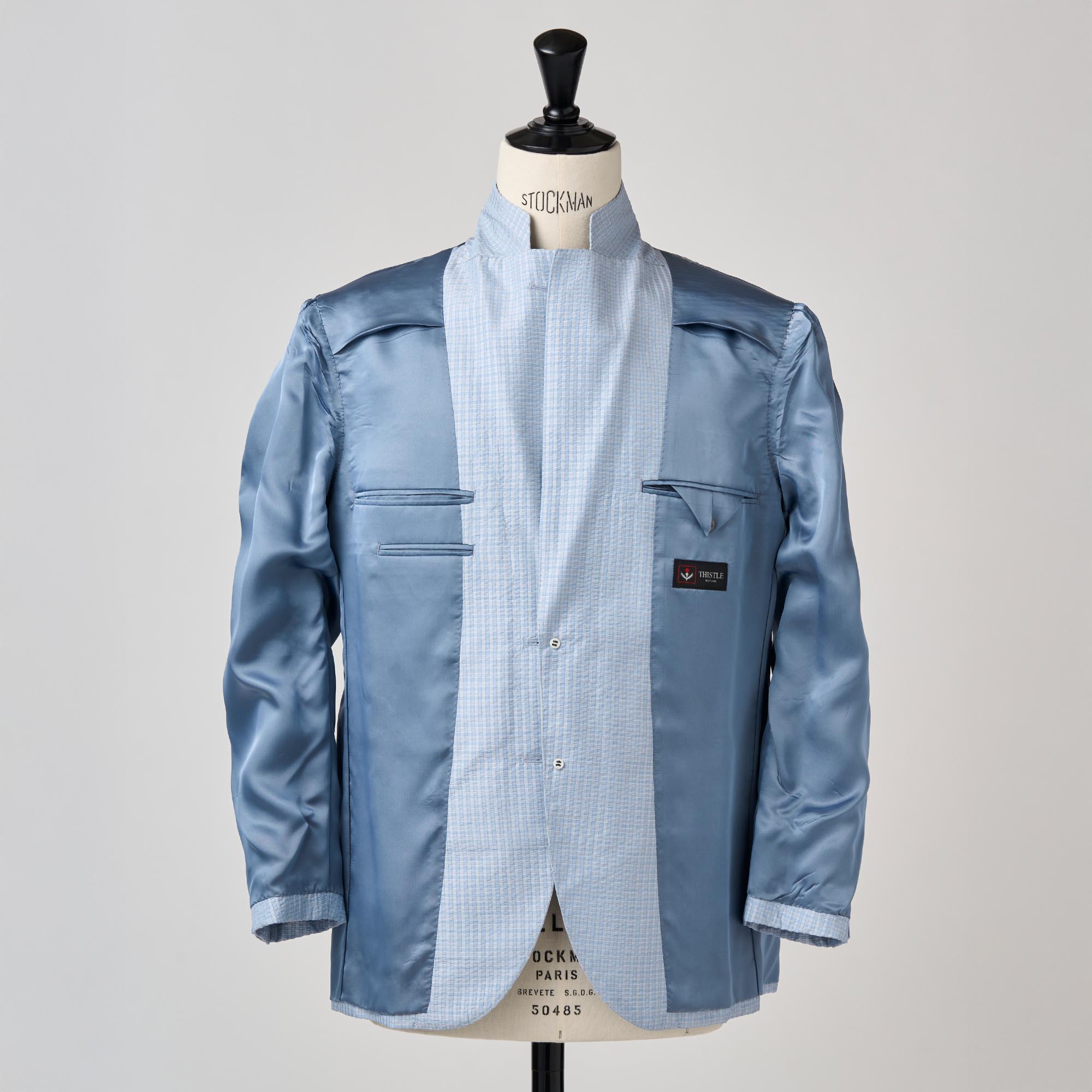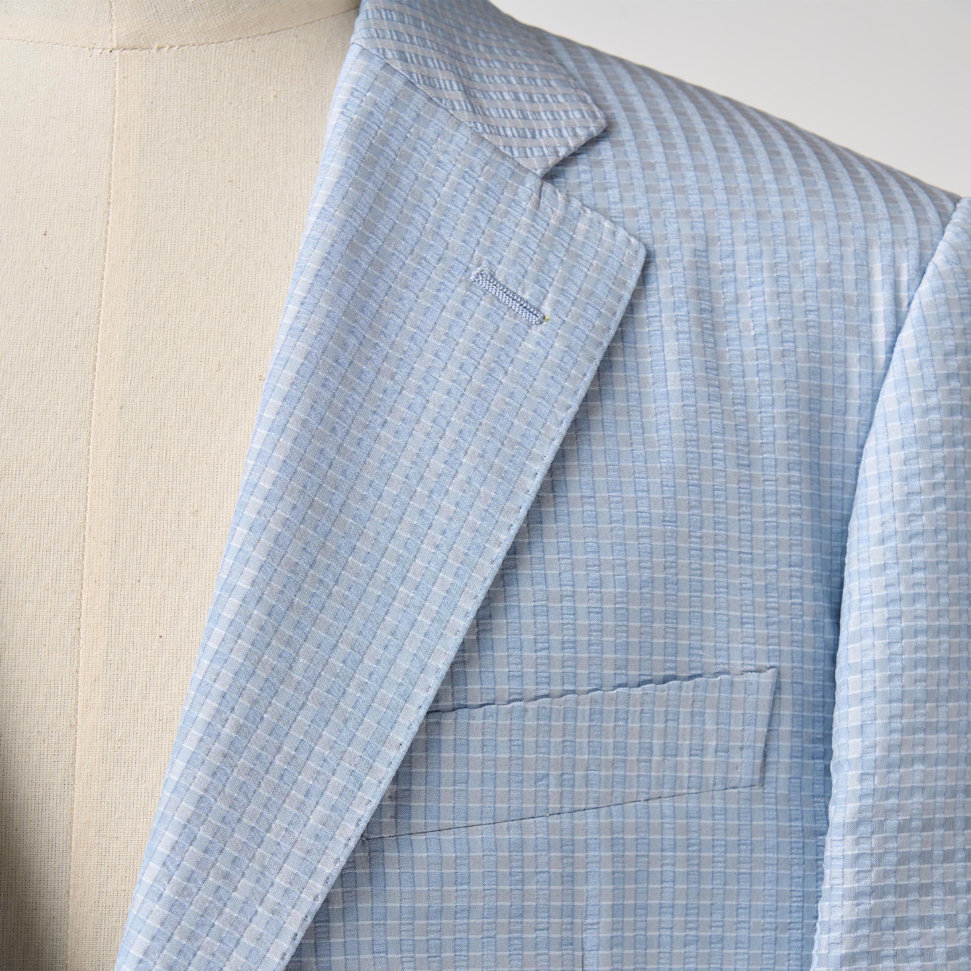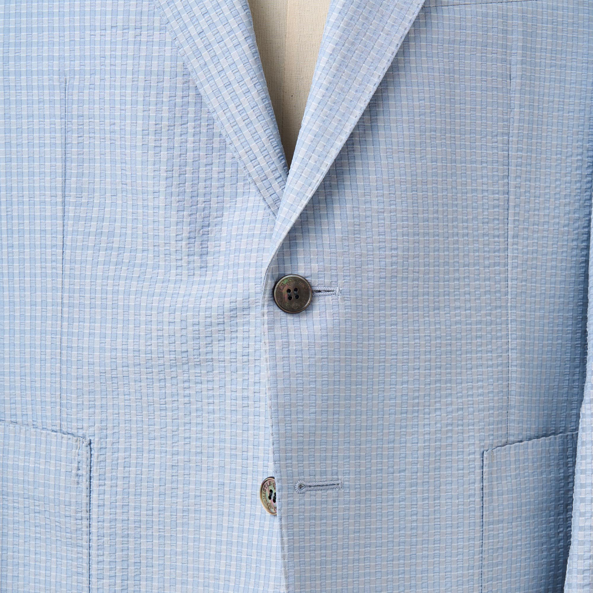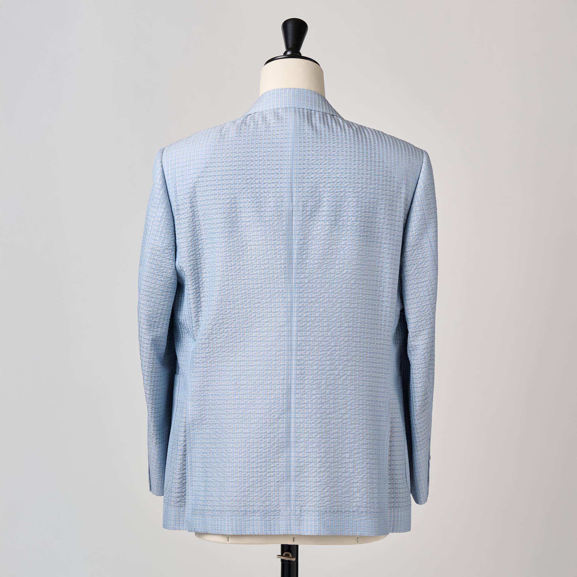 シルクの産地、山形県米沢市の生地メーカーとのコラボレーションから生まれたシルク100%のサッカー生地の軽い仕立てのジャケットです。サッカー生地特有の凹凸(シボ)に光が当たるとシルク特有の繊細な艶が浮き上がり、他のサッカー地とは一線を画す高級感を放ちます。