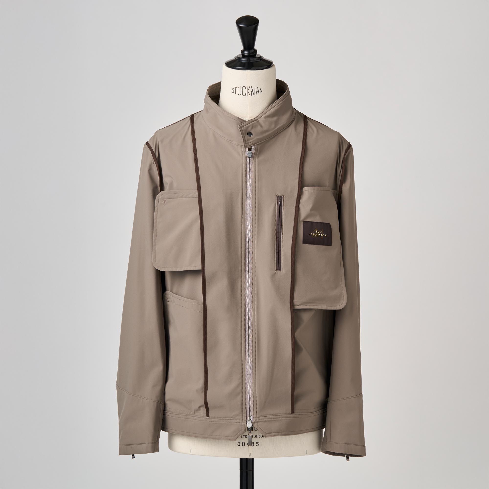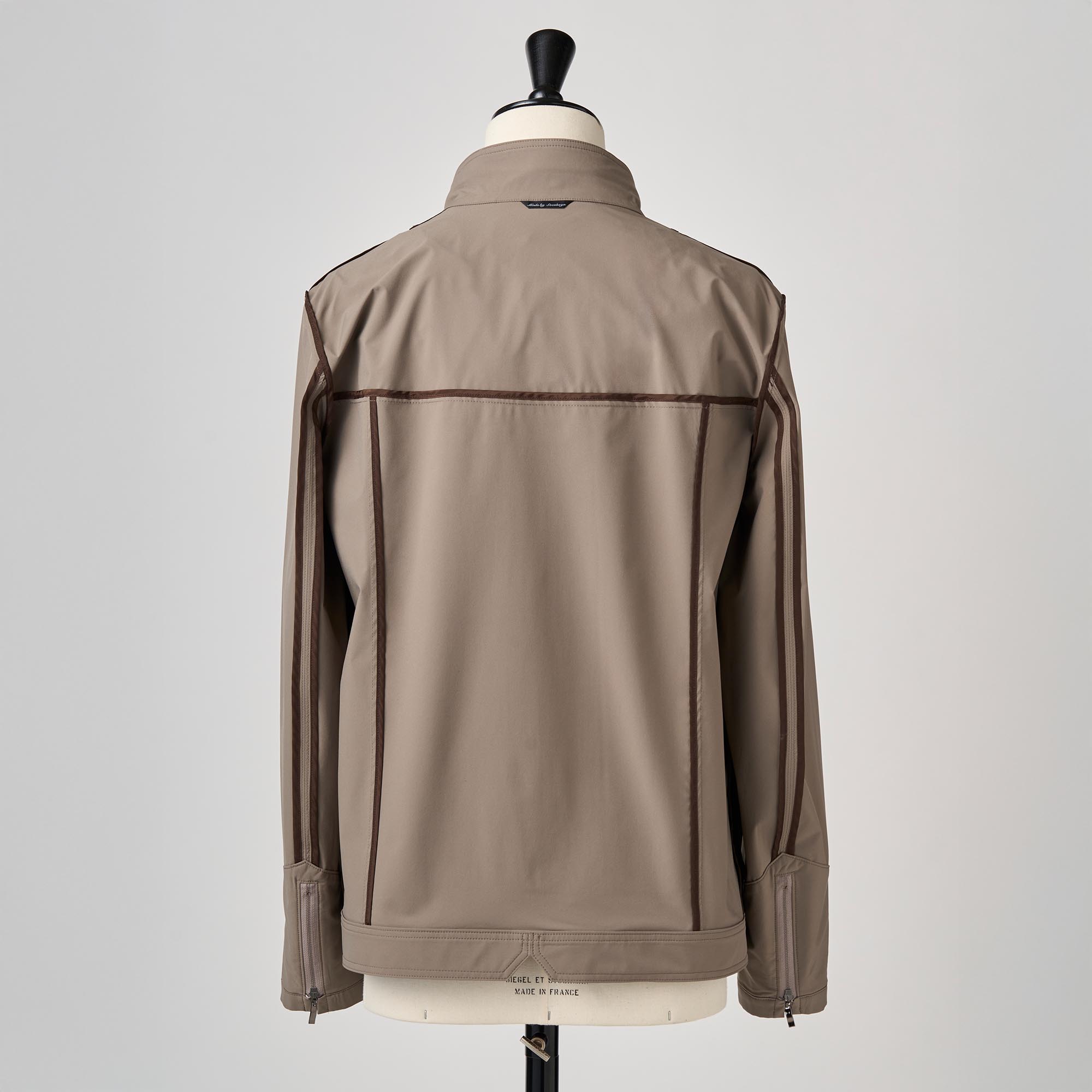 撥水機能とストレッチ性を持ち合わせたポリエステル素材を使用してショート丈のブルゾンを仕立てました。計算されたショート丈が、腰の位置を高く見せ、抜群のスタイルアップ効果を発揮します。フロントはダブルジップを使用し、機能性を高めています。
