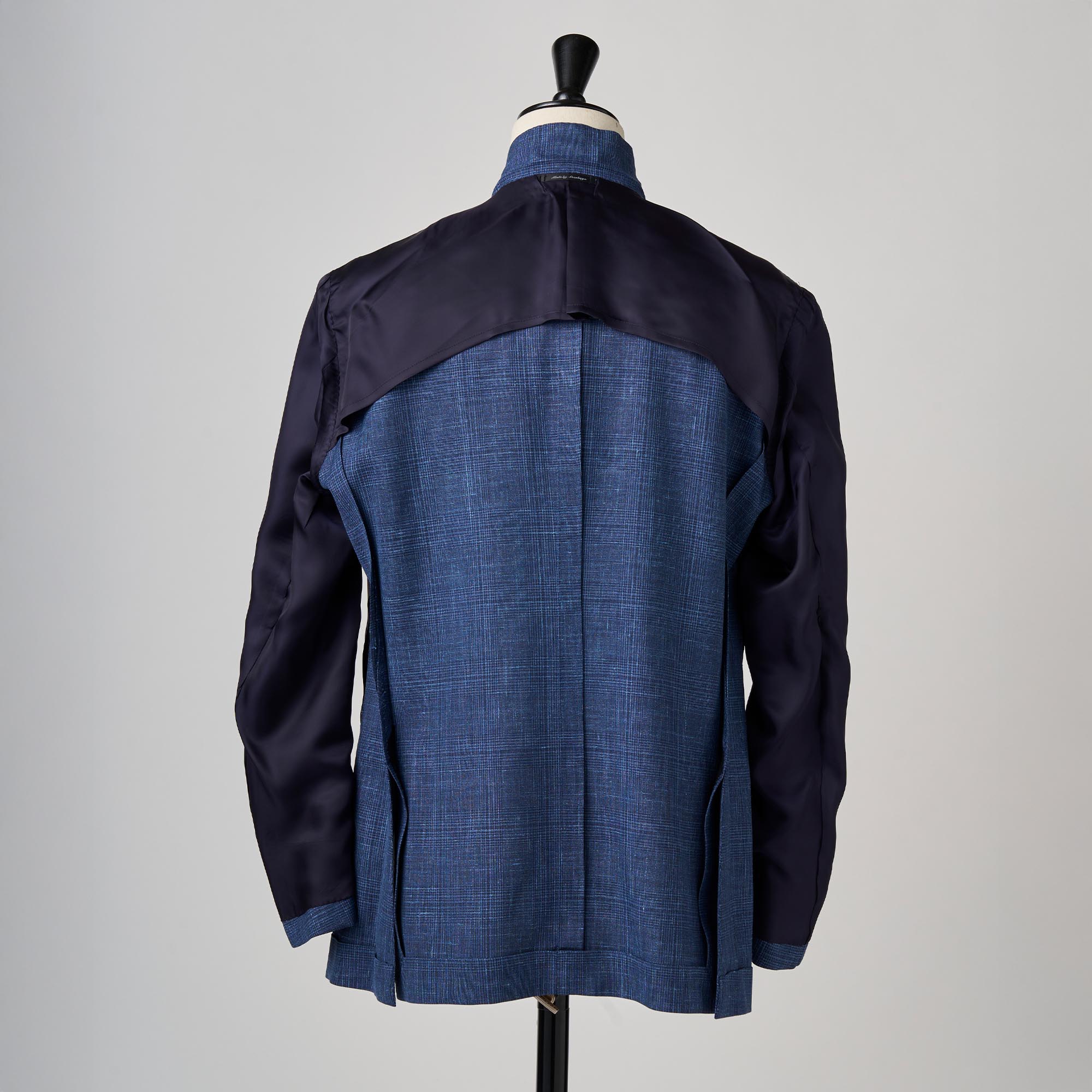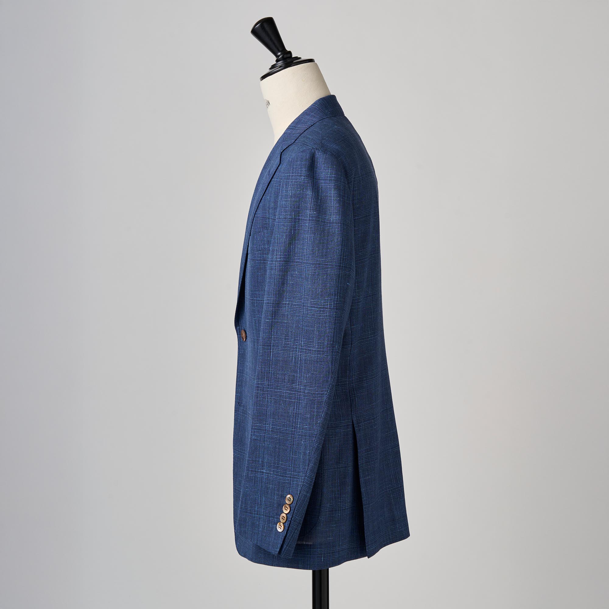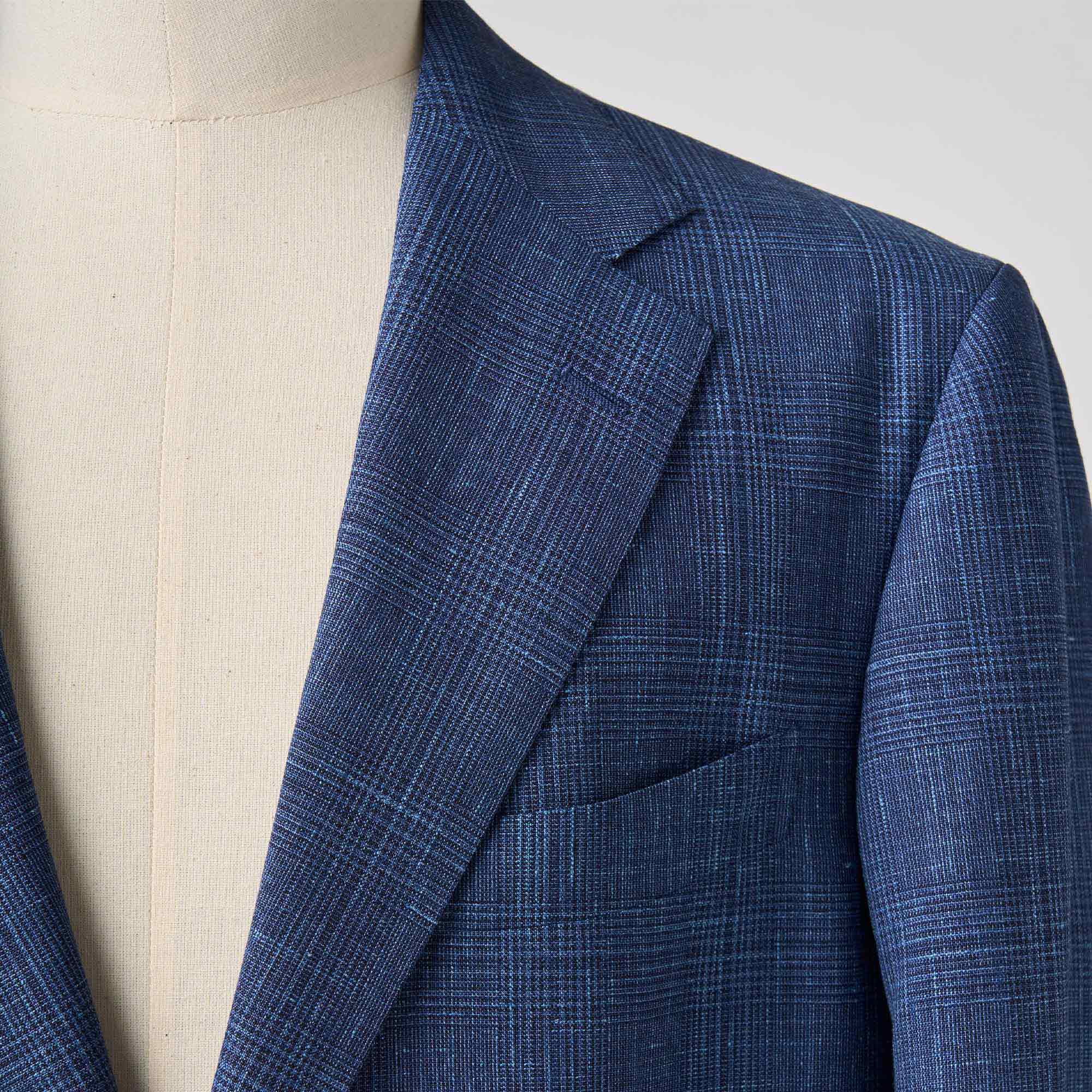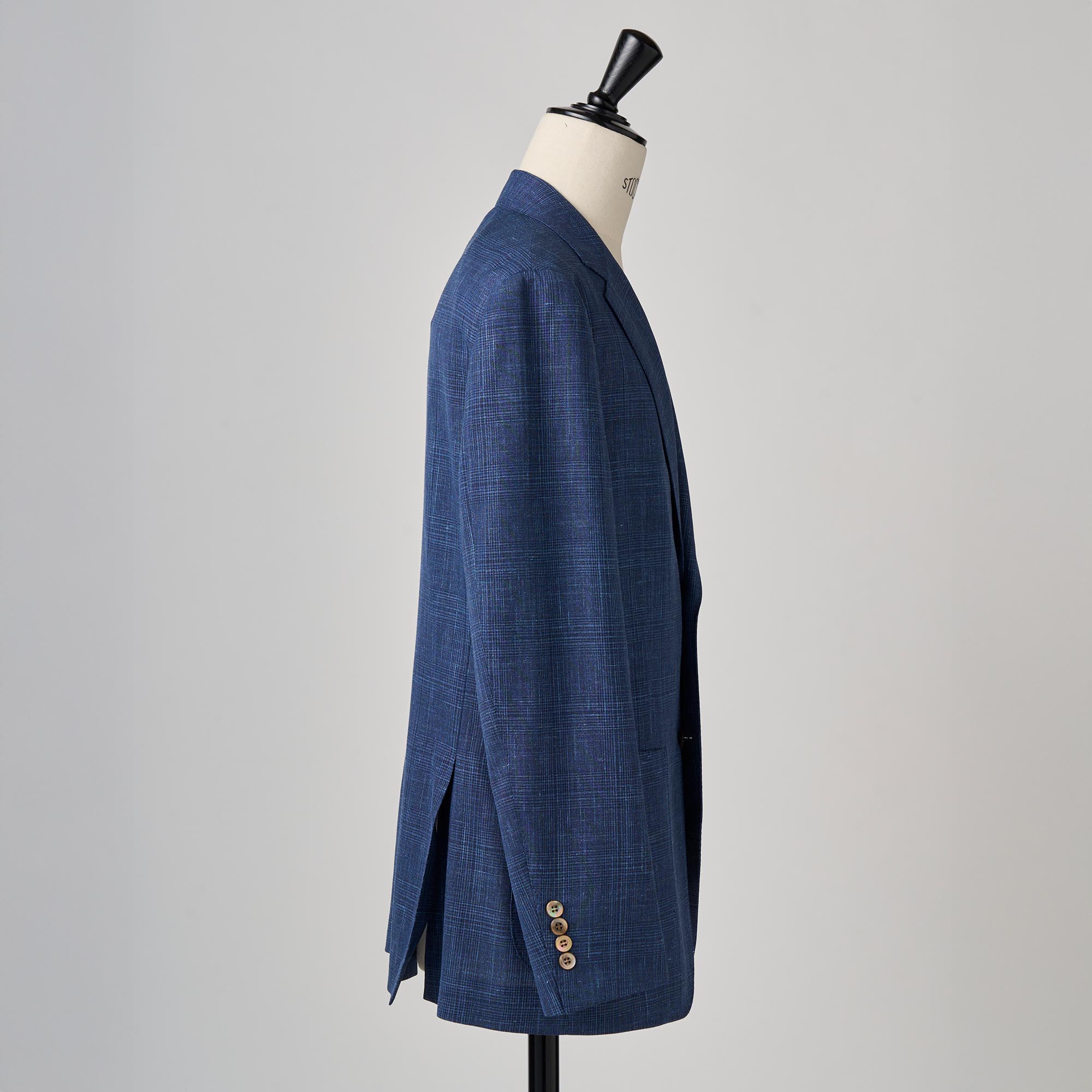 イタリアの老舗素材メーカーのウールシルクリネンのシャドウグレンチェックの素材を使用し柔らかい毛芯を入れた仕立てのジャケットです。三つの天然素材の長所、ウールの弾力、シルクの艶、リネンの清涼感と通気性を掛け合わせた非常に高級感のある素材です。伝統的なモノトーンのグレンチェックではなく、ネイビーのグラデーションで表現することで、柄の主張が強すぎず、ビジネスから休日まで幅広いコーディネイトに馴染みます。春夏シーズンの主役にふさわしい一着です。