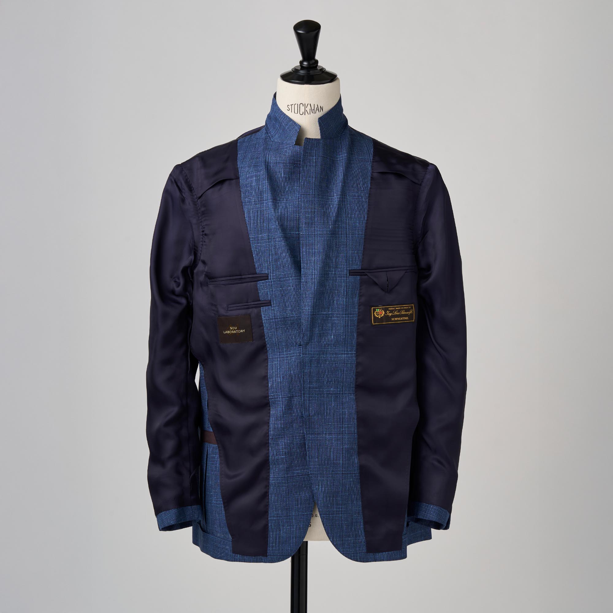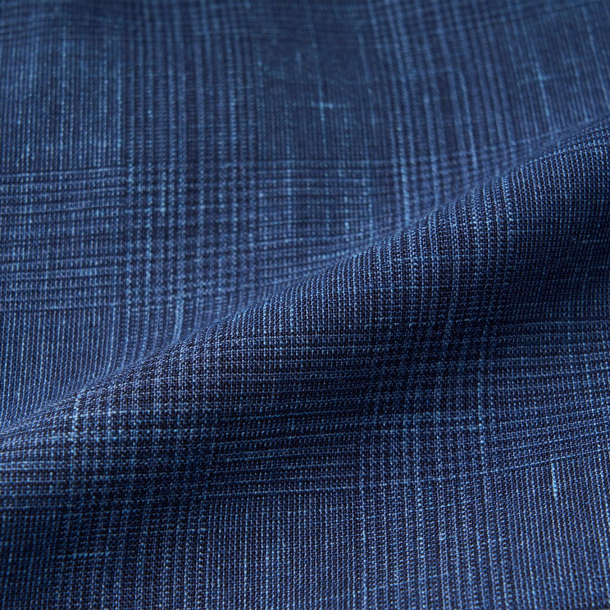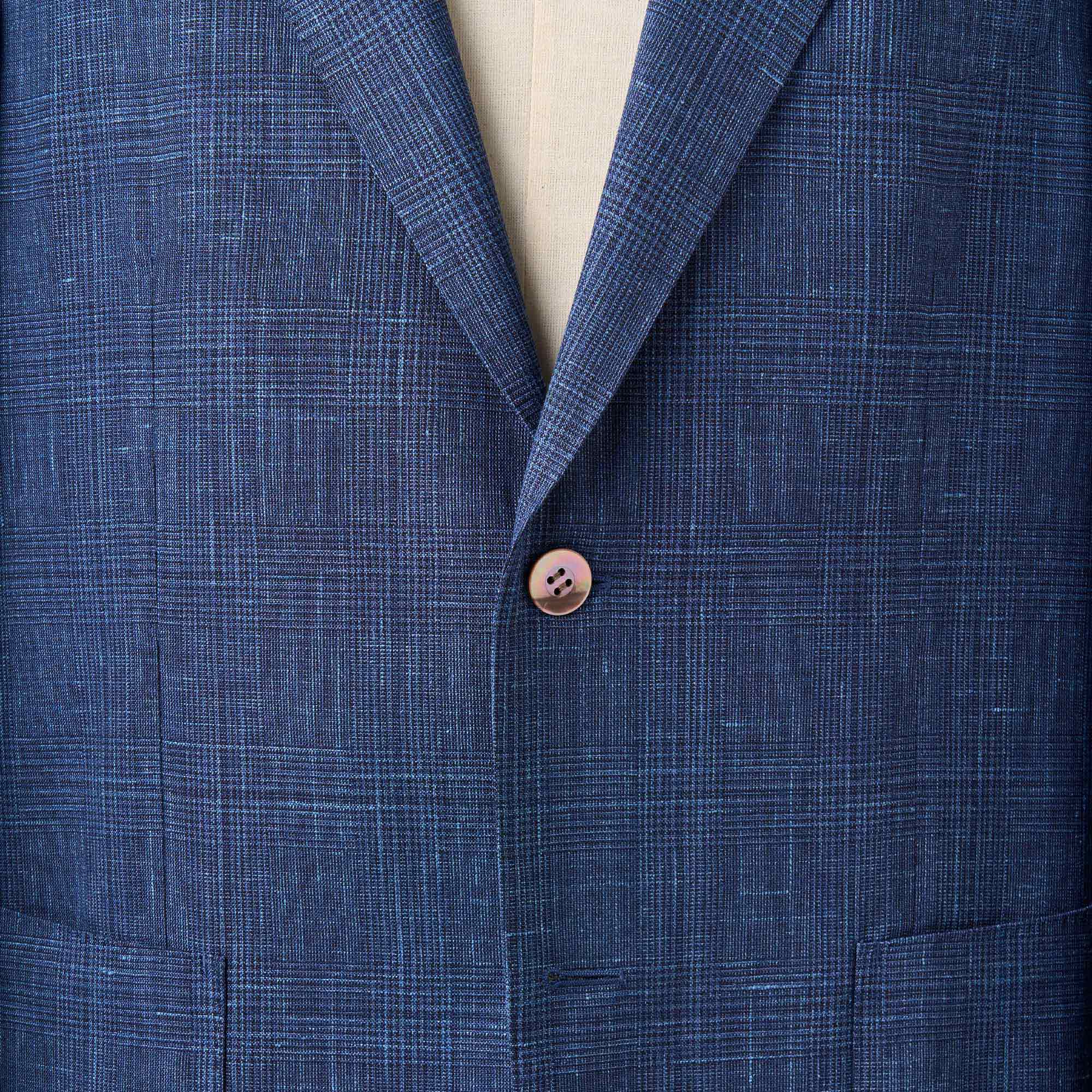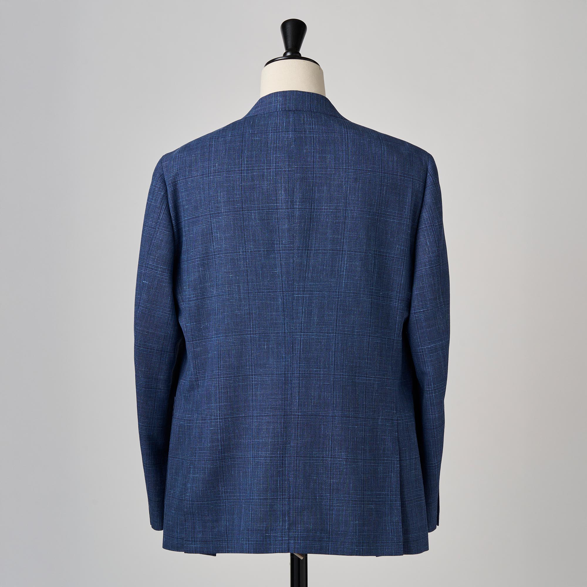 イタリアの老舗素材メーカーのウールシルクリネンのシャドウグレンチェックの素材を使用し柔らかい毛芯を入れた仕立てのジャケットです。三つの天然素材の長所、ウールの弾力、シルクの艶、リネンの清涼感と通気性を掛け合わせた非常に高級感のある素材です。伝統的なモノトーンのグレンチェックではなく、ネイビーのグラデーションで表現することで、柄の主張が強すぎず、ビジネスから休日まで幅広いコーディネイトに馴染みます。春夏シーズンの主役にふさわしい一着です。