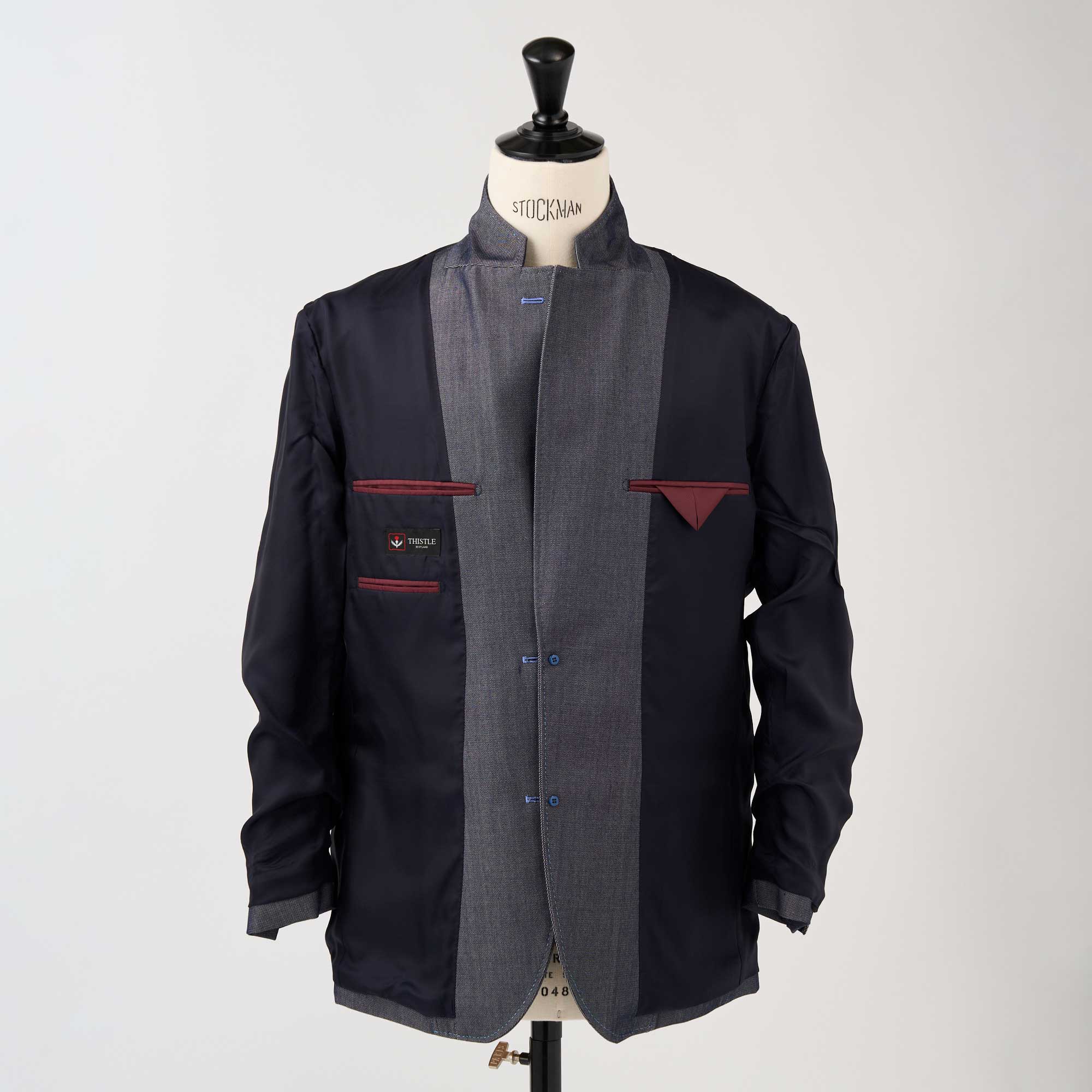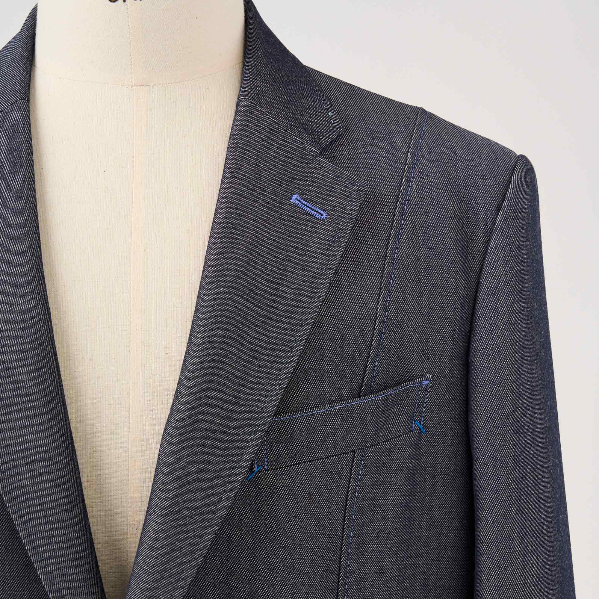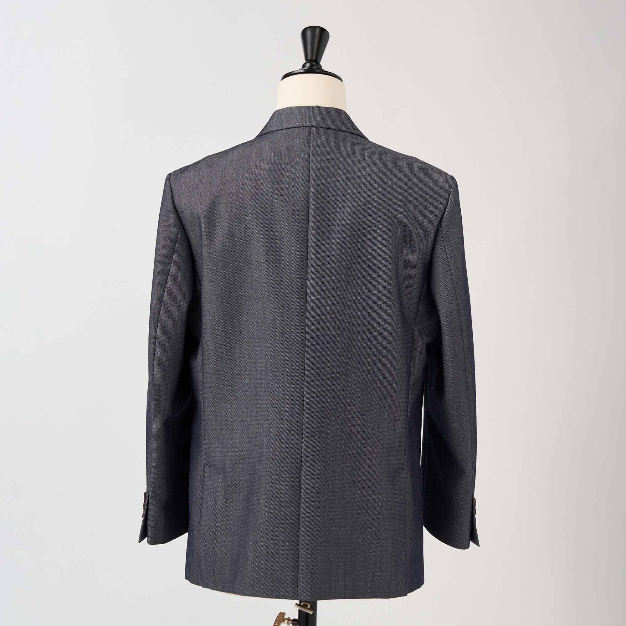 コットンデニムとは異なりスーツ生地のようなハリ感や膨らみを持った素材のジャケット。上品で光沢感のある素材にカジュアルデザインの特徴を持たせました。カラーステッチやカラーカンヌキ、肩から裾への切り替えなど、少し遊び心のある大人の為のカジュアルアイテムです。