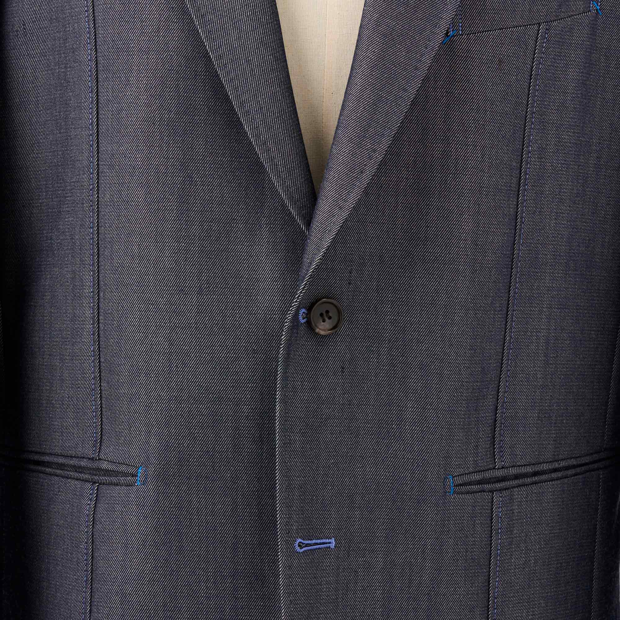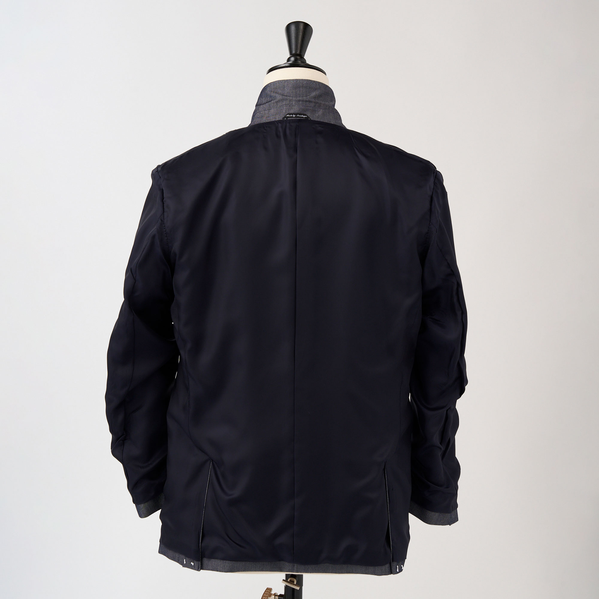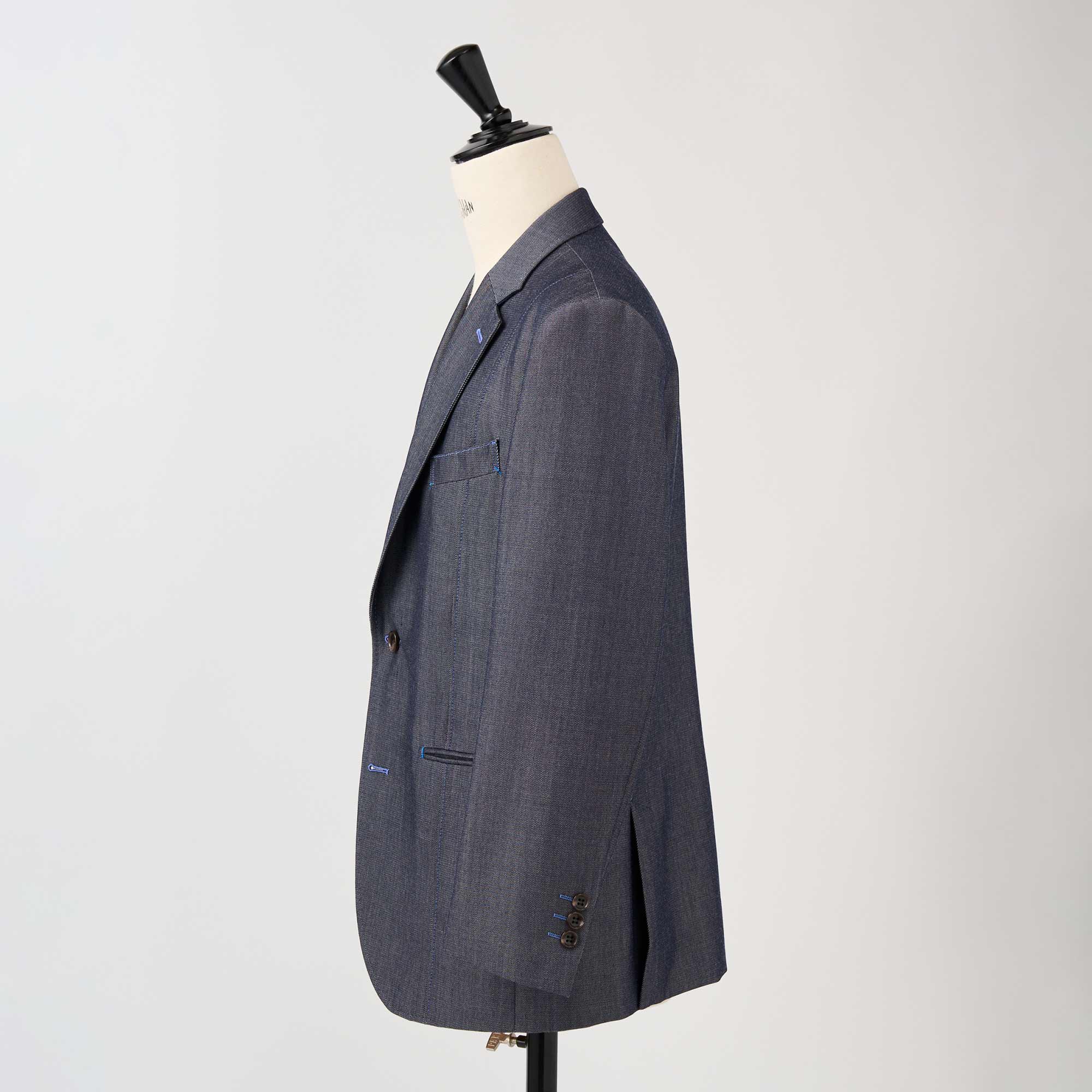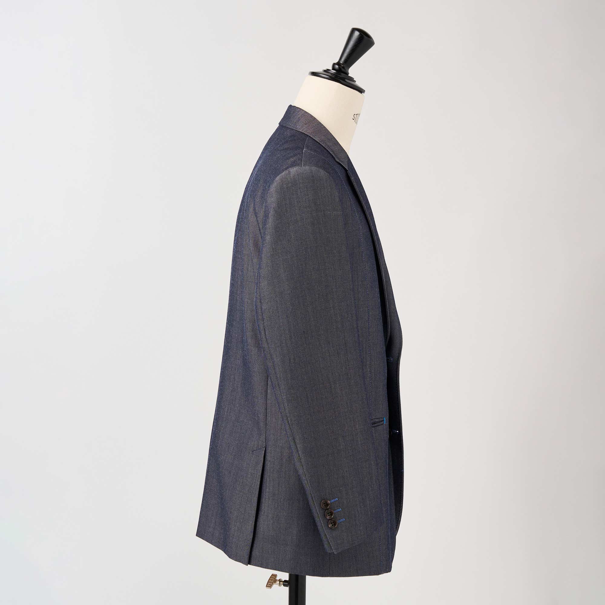 コットンデニムとは異なりスーツ生地のようなハリ感や膨らみを持った素材のジャケット。上品で光沢感のある素材にカジュアルデザインの特徴を持たせました。カラーステッチやカラーカンヌキ、肩から裾への切り替えなど、少し遊び心のある大人の為のカジュアルアイテムです。