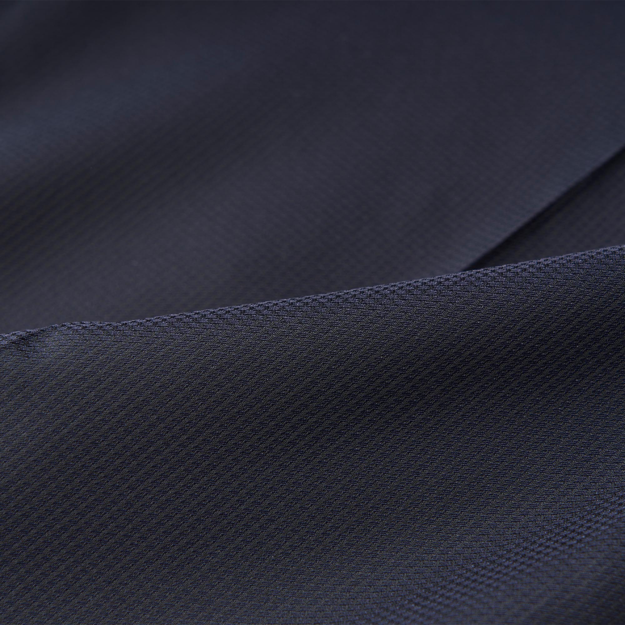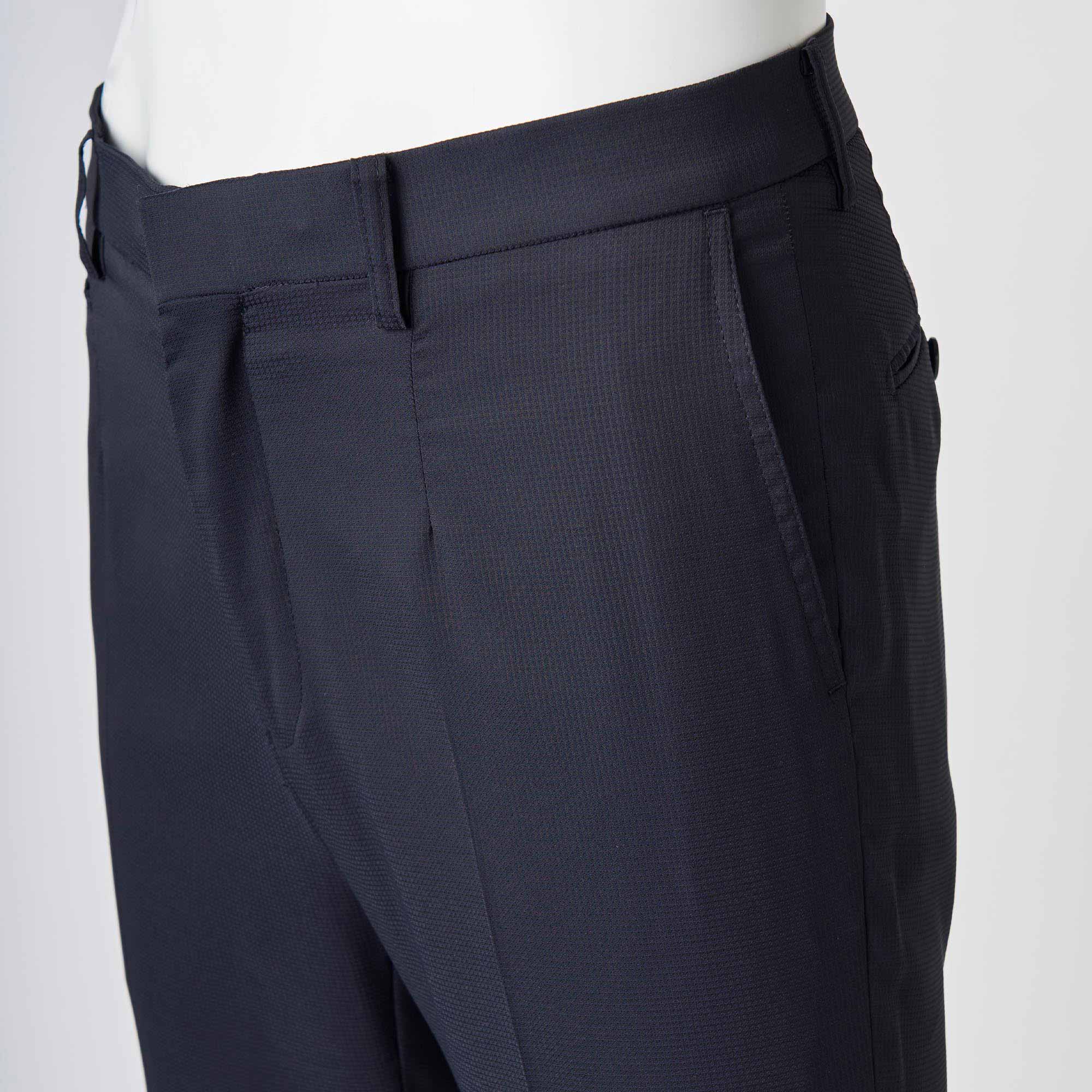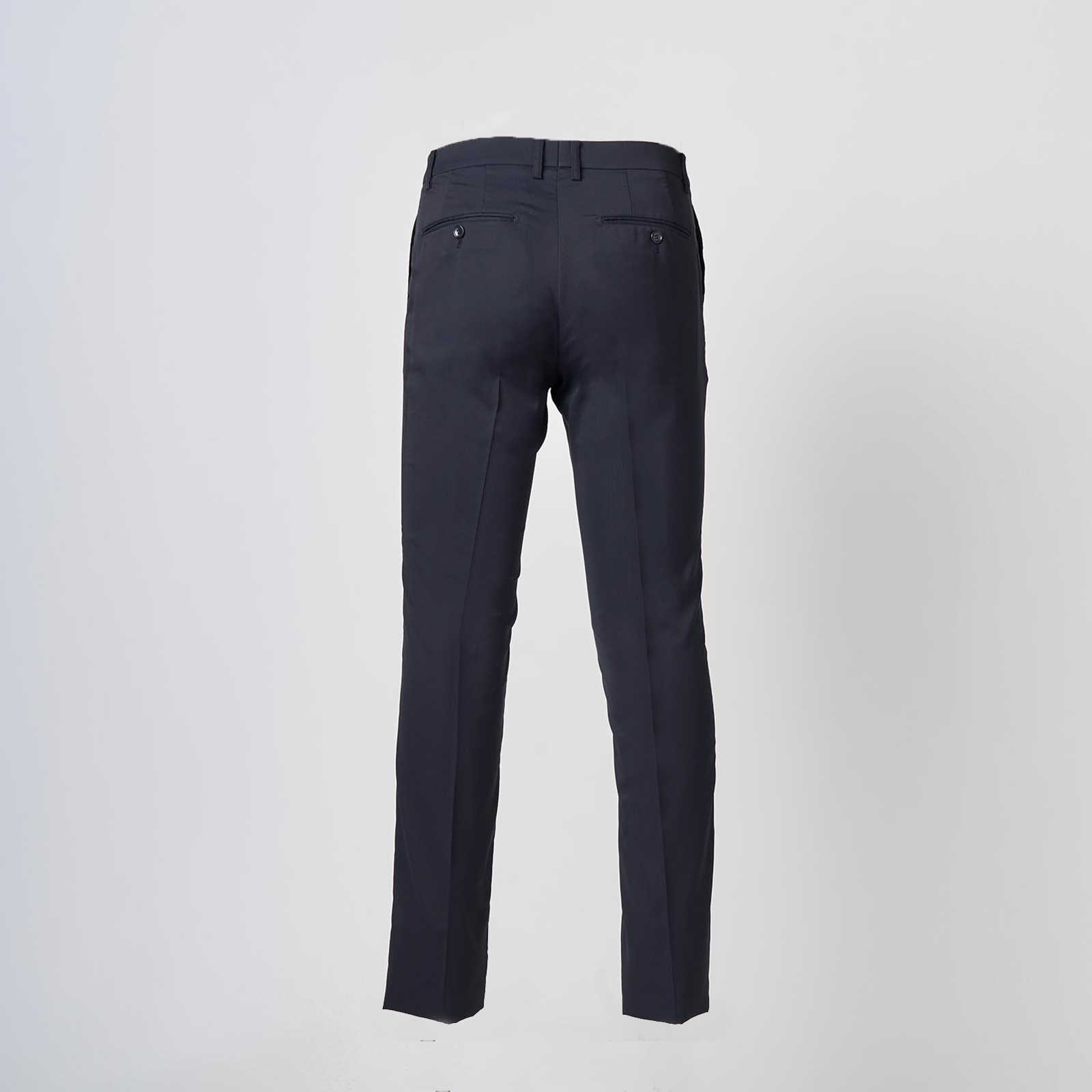 群馬県桐生市の生地メーカーとのコラボレーションにより織り上げられたソロテックスを緯糸に使用したストレッチポリエステルで仕立てたノープリーツスラックスです。シャープなテーパードシルエットです。