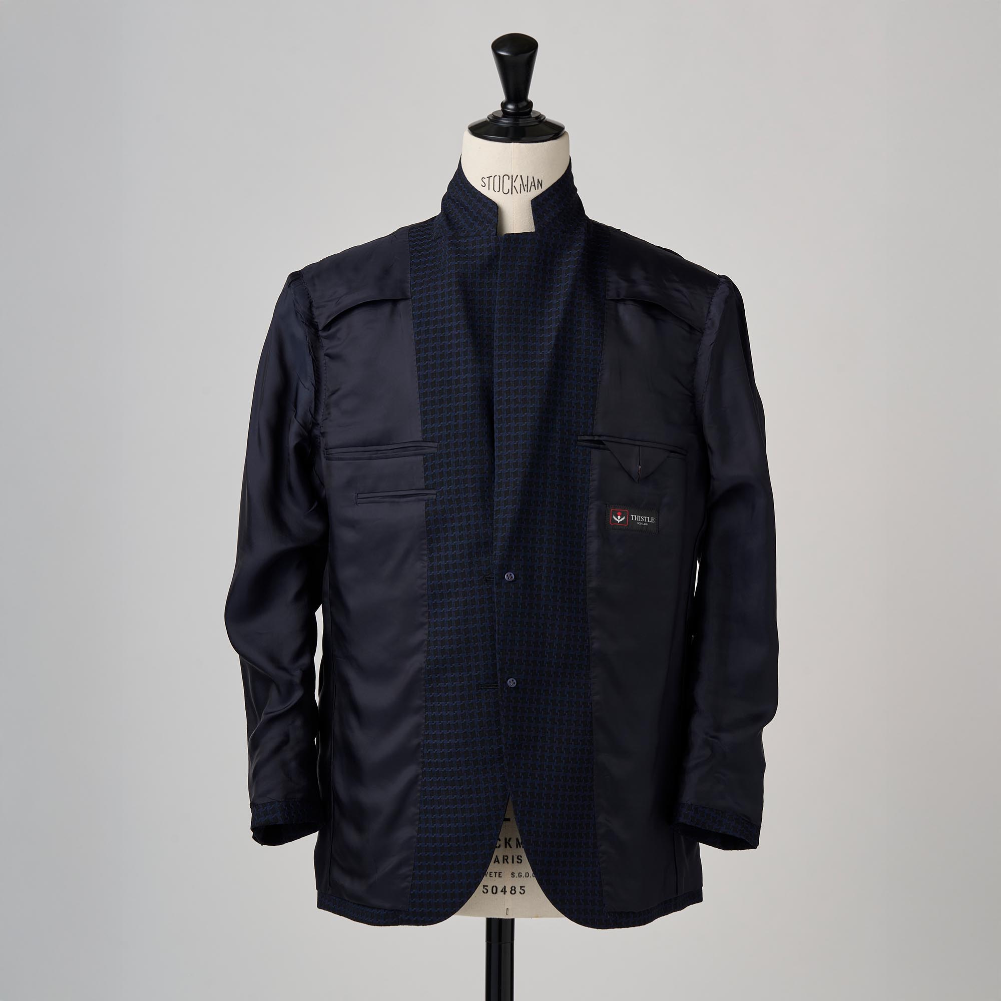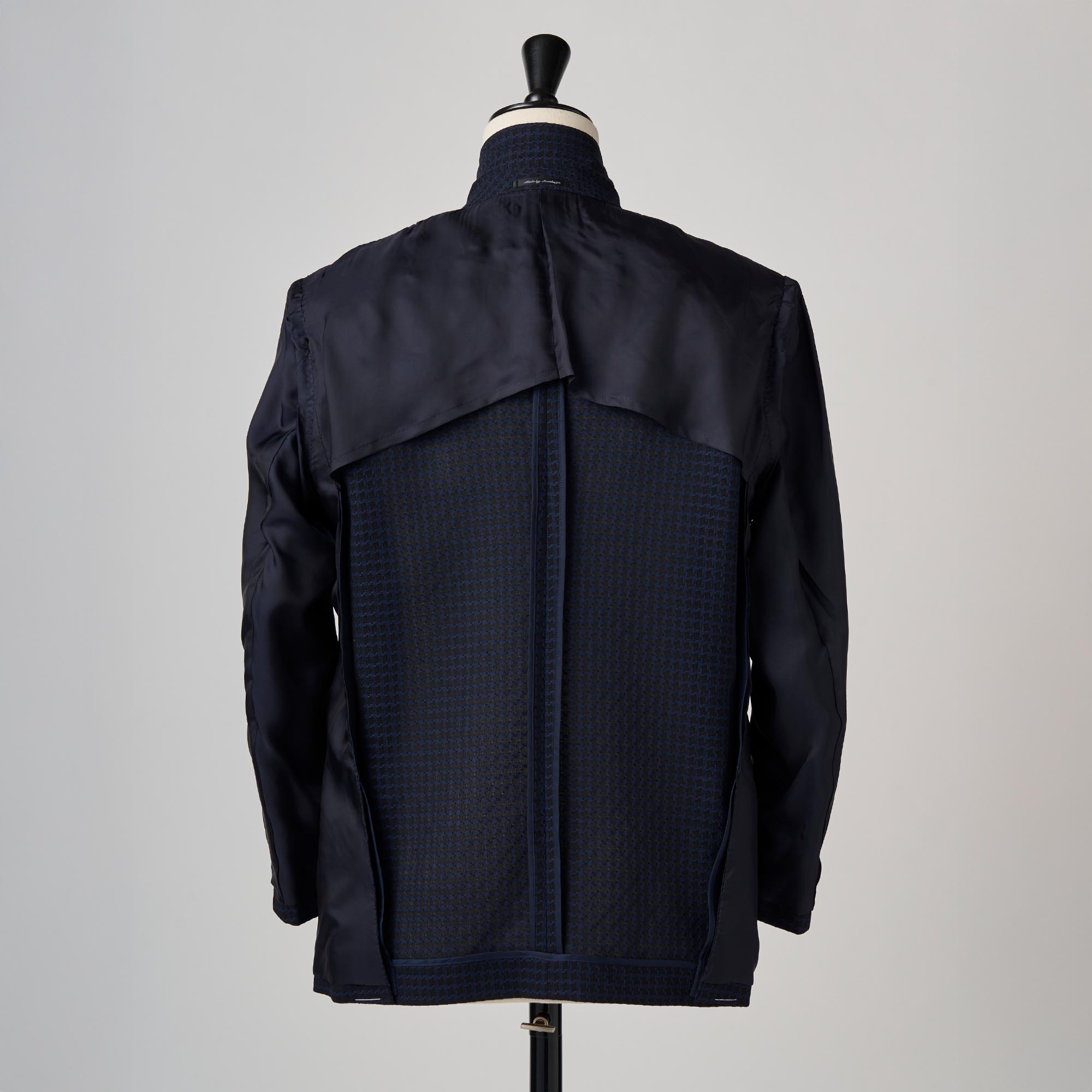 日本有数のウール産地・尾州の生地メーカーとのコラボレーションにより織り上げられた変形メッシュ組織のウール素材です。軽量でありながら芯地をしっかりと使用して構築的に仕立てています。