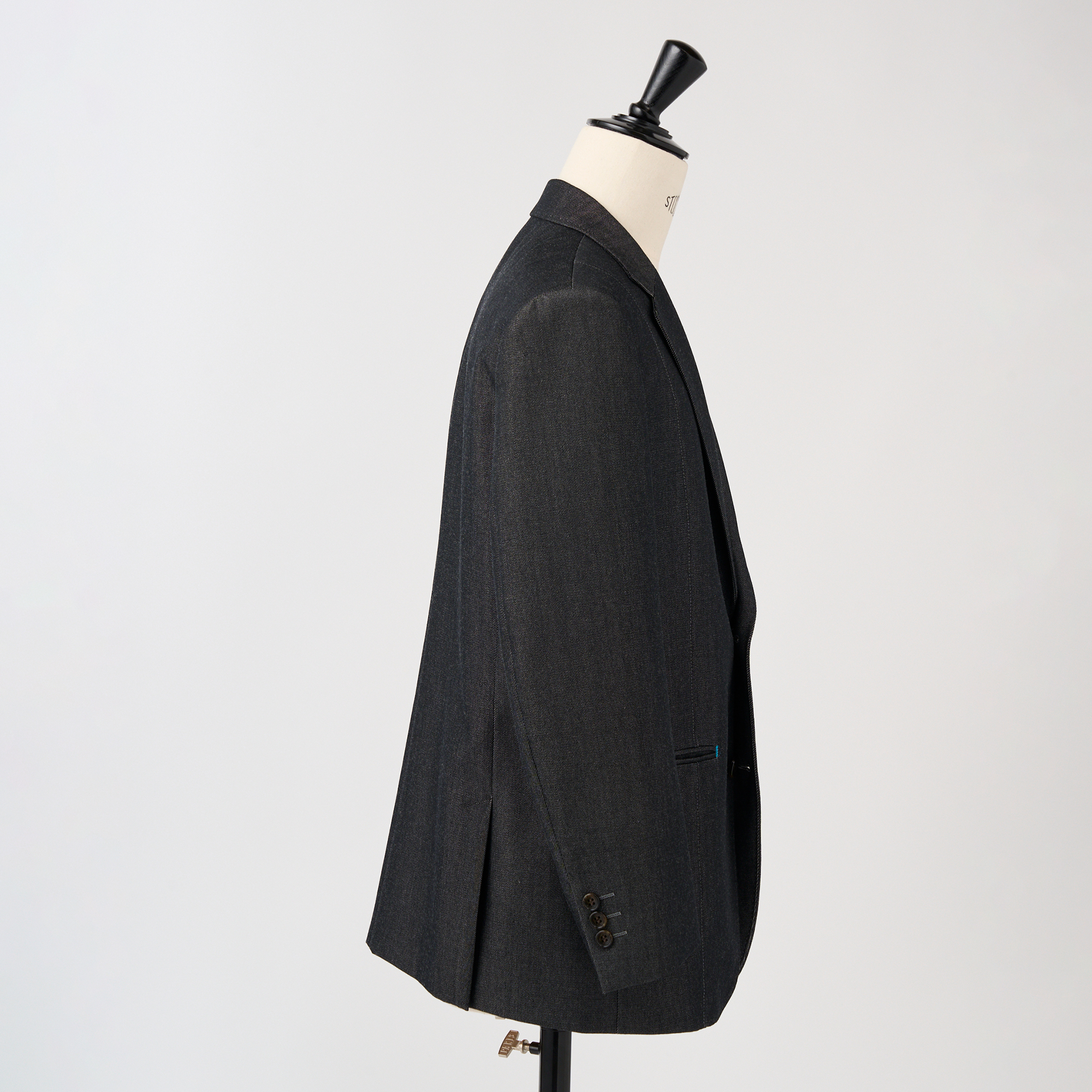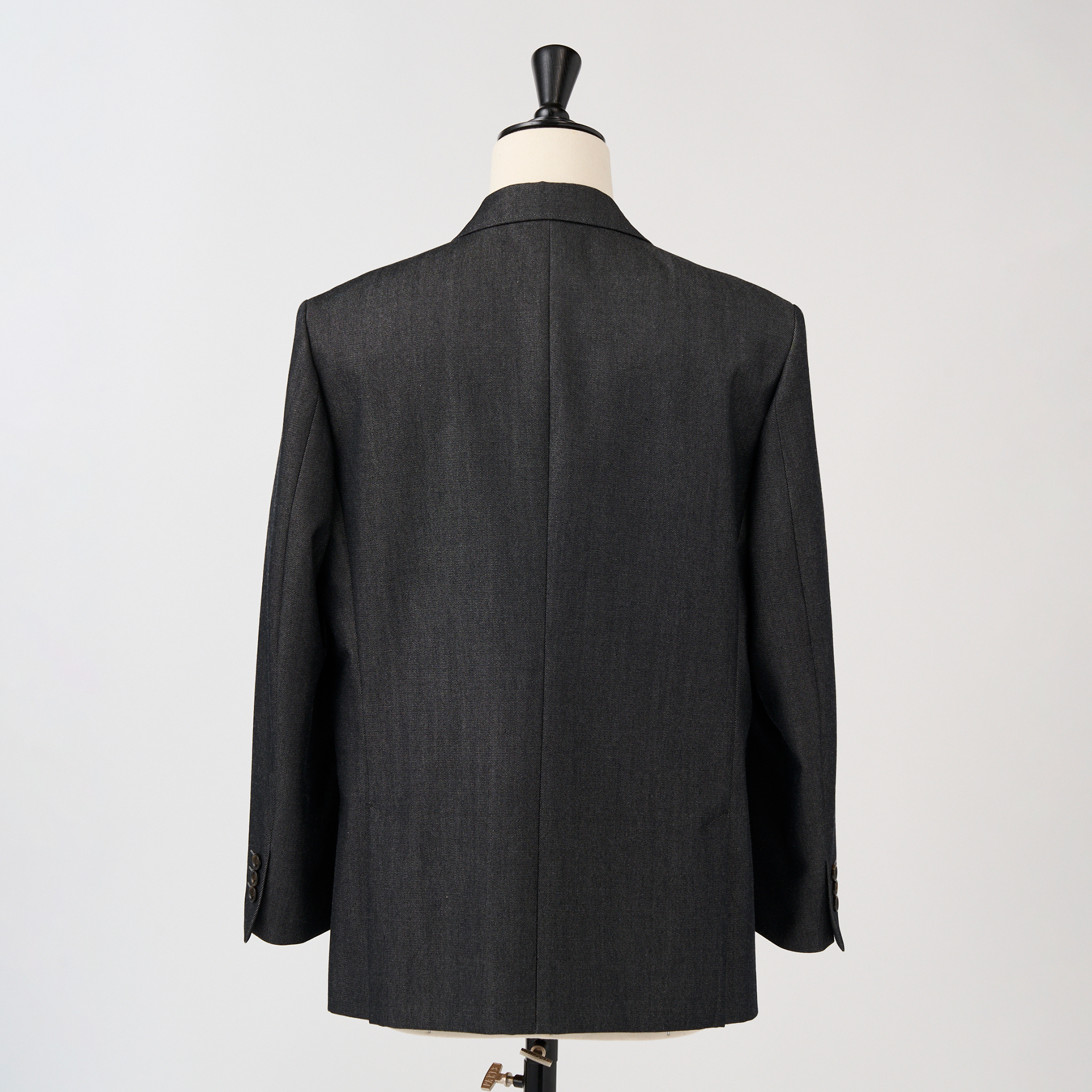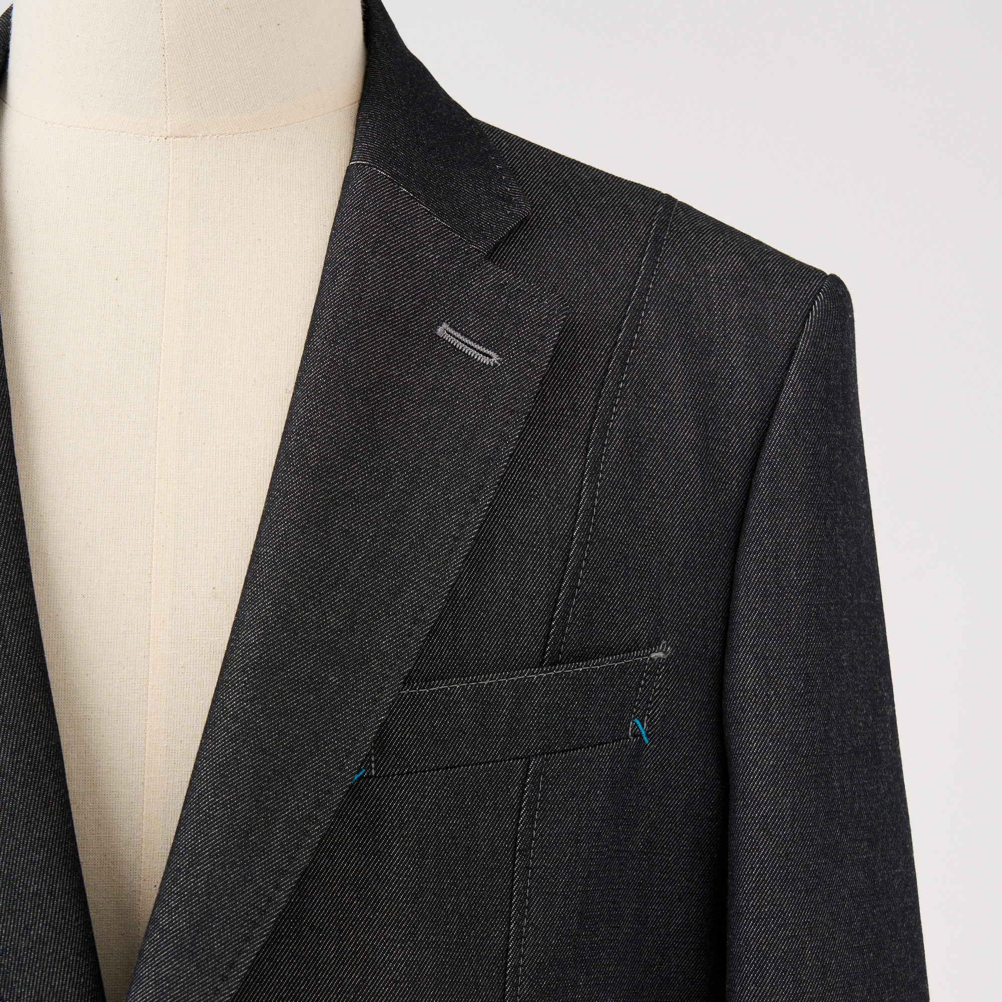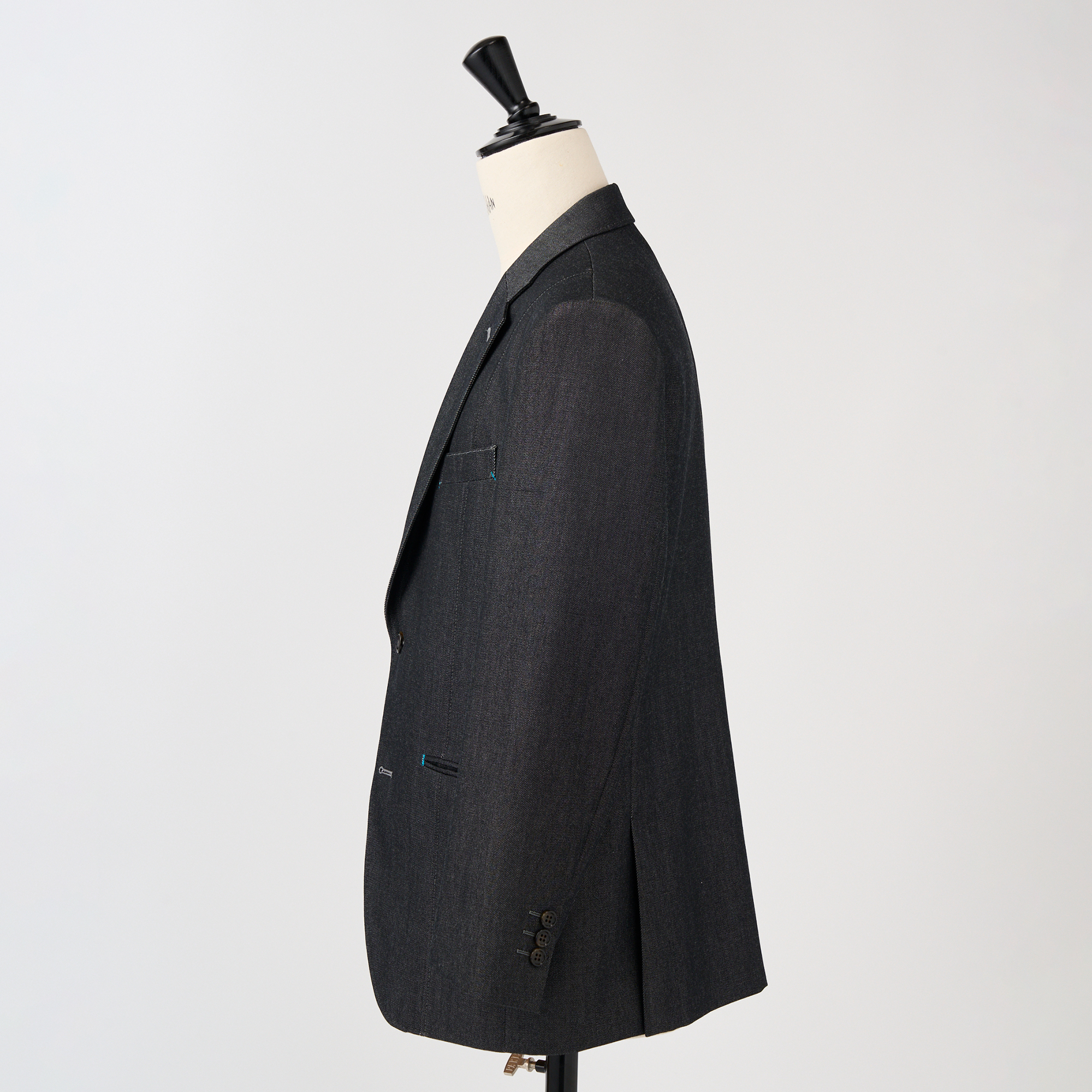 コットンデニムとは異なりスーツ生地のようなハリ感や膨らみを持った素材のジャケット。上品で光沢感のある素材にカジュアルデザインの特徴を持たせました。カラーステッチやカラーカンヌキ、肩から裾への切り替えなど、少し遊び心のある大人の為のカジュアルアイテムです。