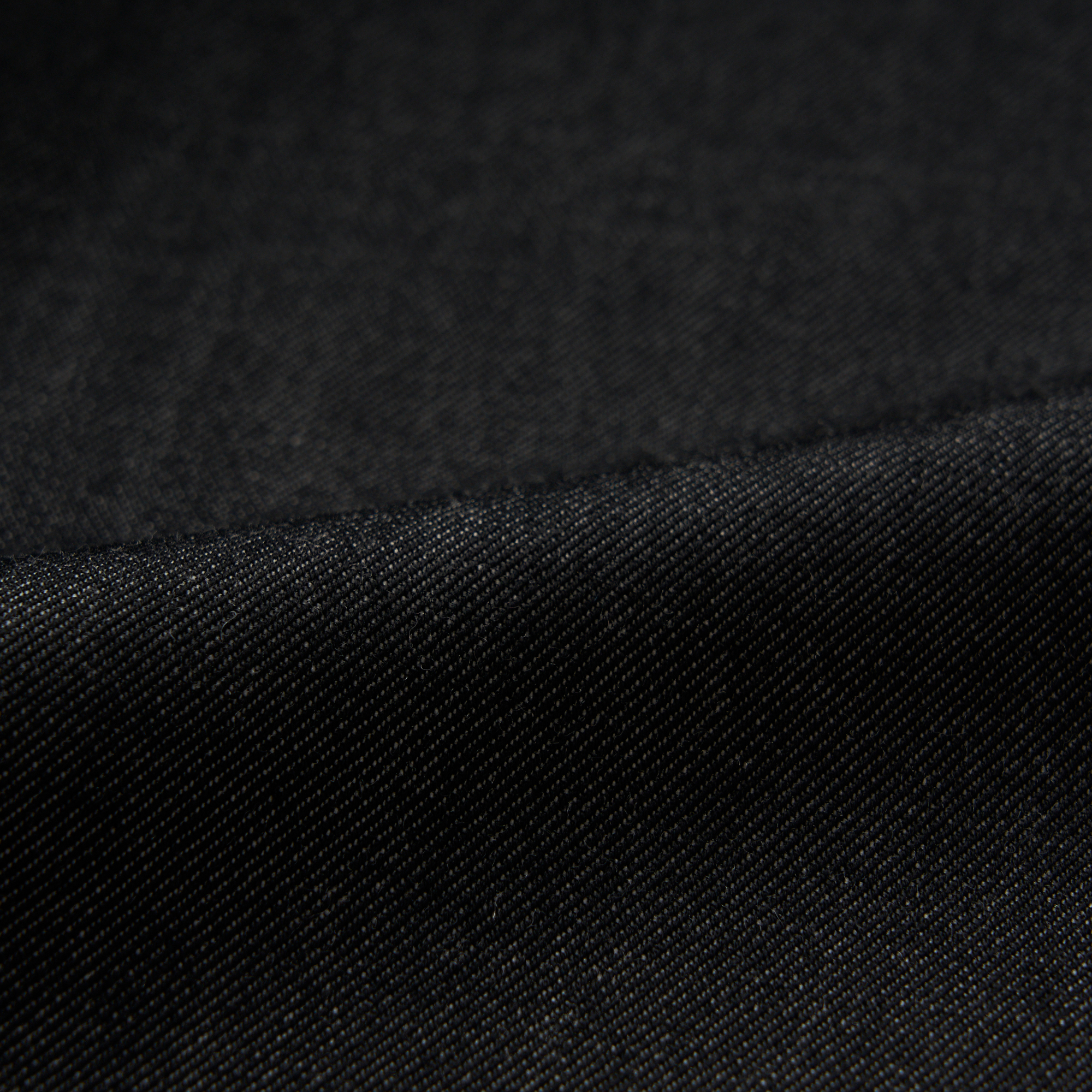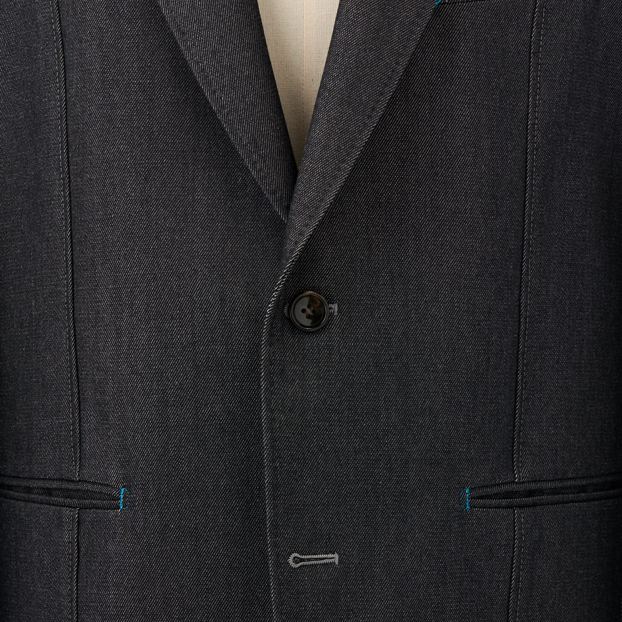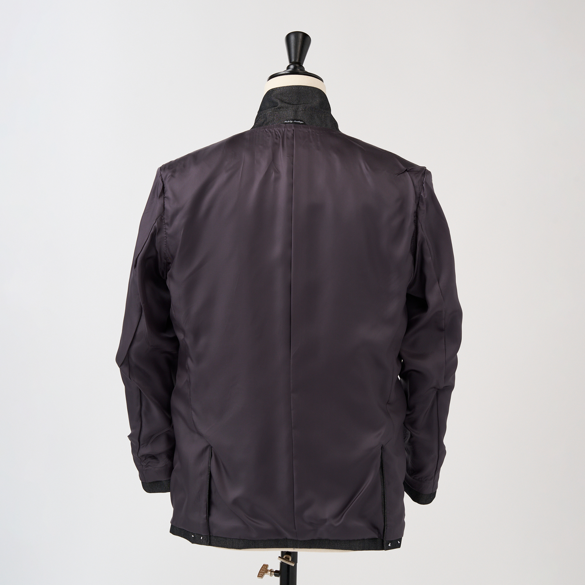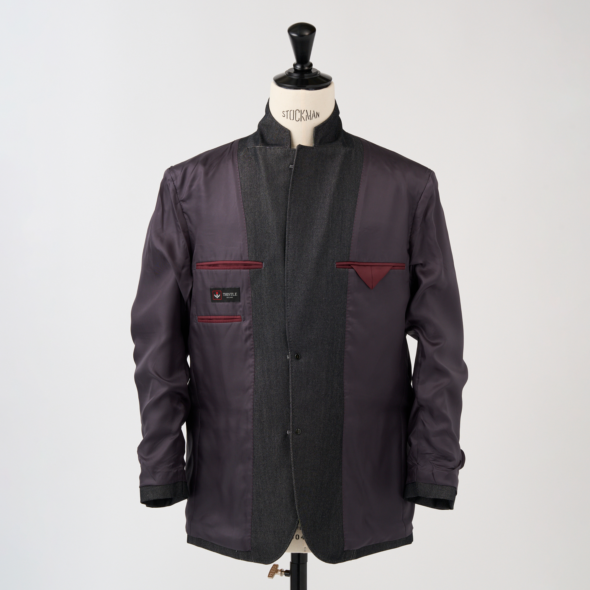 コットンデニムとは異なりスーツ生地のようなハリ感や膨らみを持った素材のジャケット。上品で光沢感のある素材にカジュアルデザインの特徴を持たせました。カラーステッチやカラーカンヌキ、肩から裾への切り替えなど、少し遊び心のある大人の為のカジュアルアイテムです。