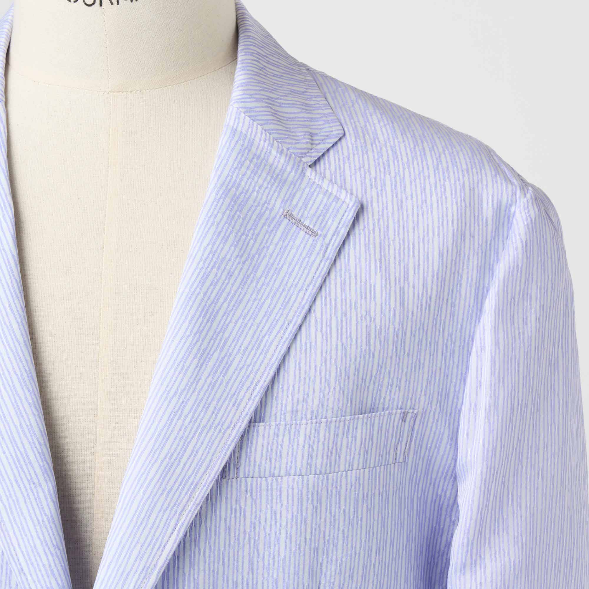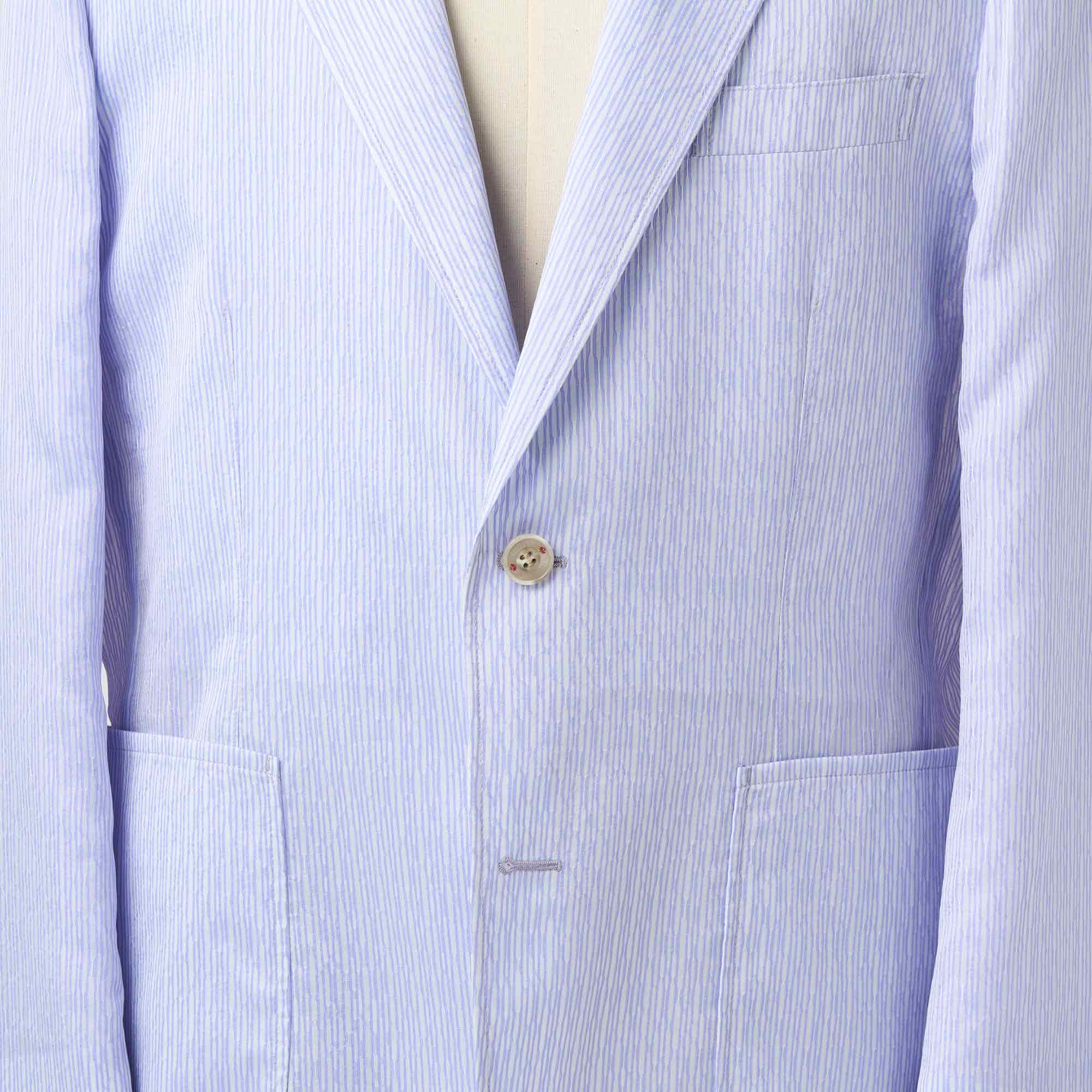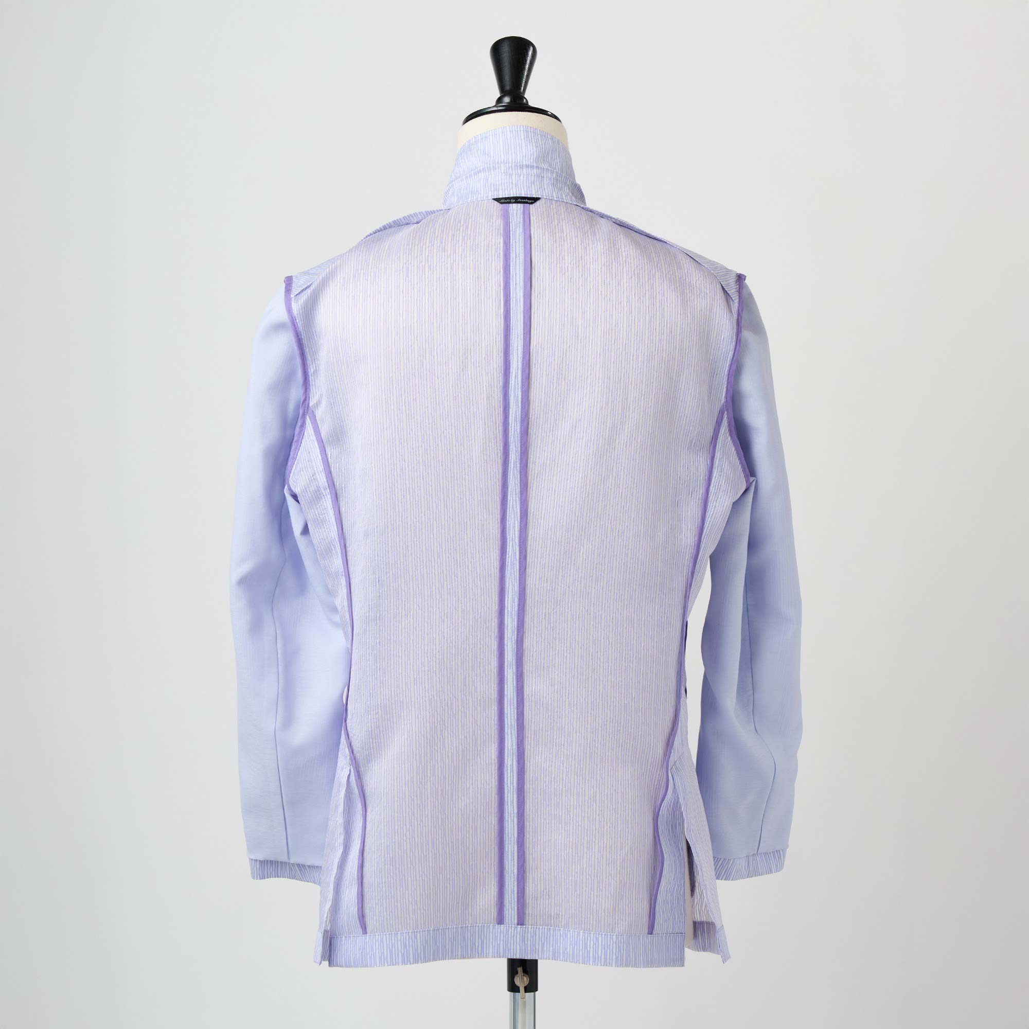 シルクの産地、山形県米沢市の生地メーカーとのコラボレーションから生まれたシルクポリエステルの透け感のあるオーガンジー生地で仕立てた超軽量なジャケットです。生地が極薄のため、身返しは大身返しにしてフロントを安定させています。各箇所には補強テープを貼り、ステッチをかけて引き裂き強度を上げています。素材はシルク特有の上品な光沢を備えながら、ポリエステルをブレンドすることでシワになりにくく、摩擦や水濡れにも比較的強い仕上がりになっています。透け感のある生地が繊細な光の変化を生み、鮮やかな色合いがモダンな雰囲気を醸し出します。軽量でありながら、ボリューム感のあるシルエットを一日中キープします。夏のリゾートでひときわ映える、エレガントなジャケットです。