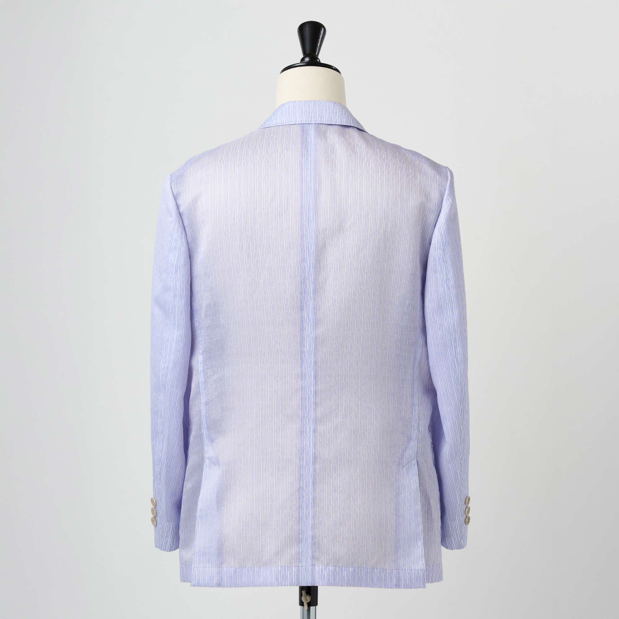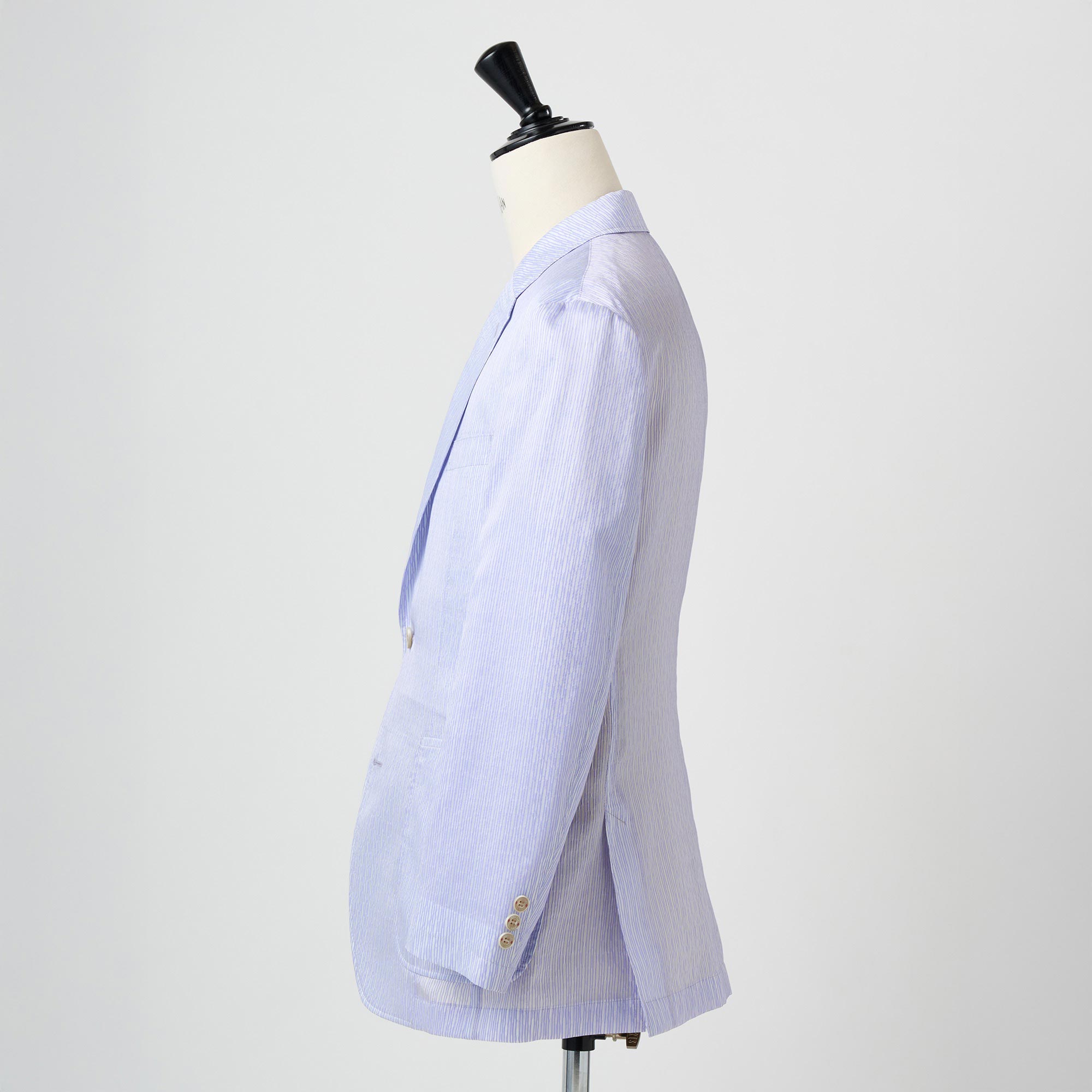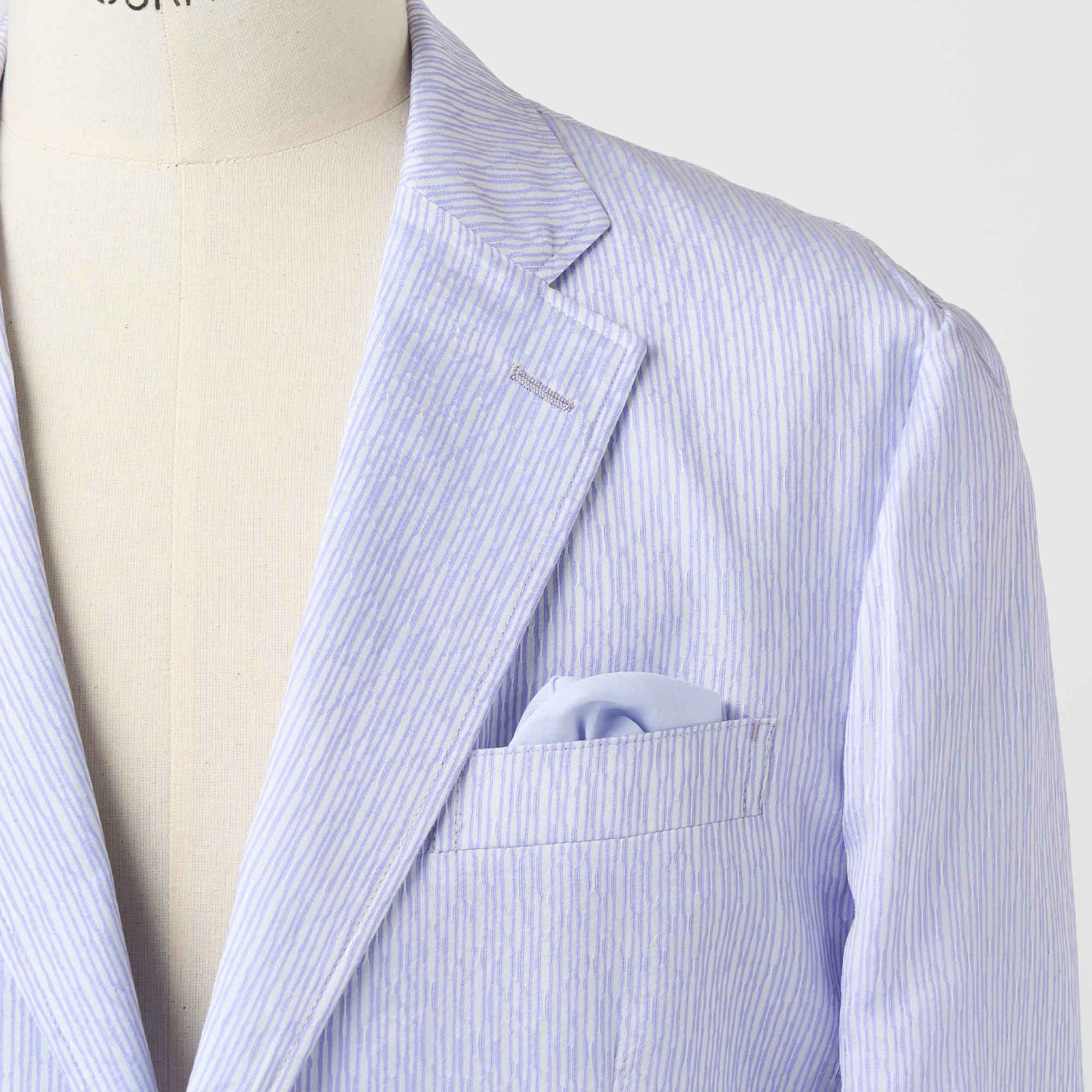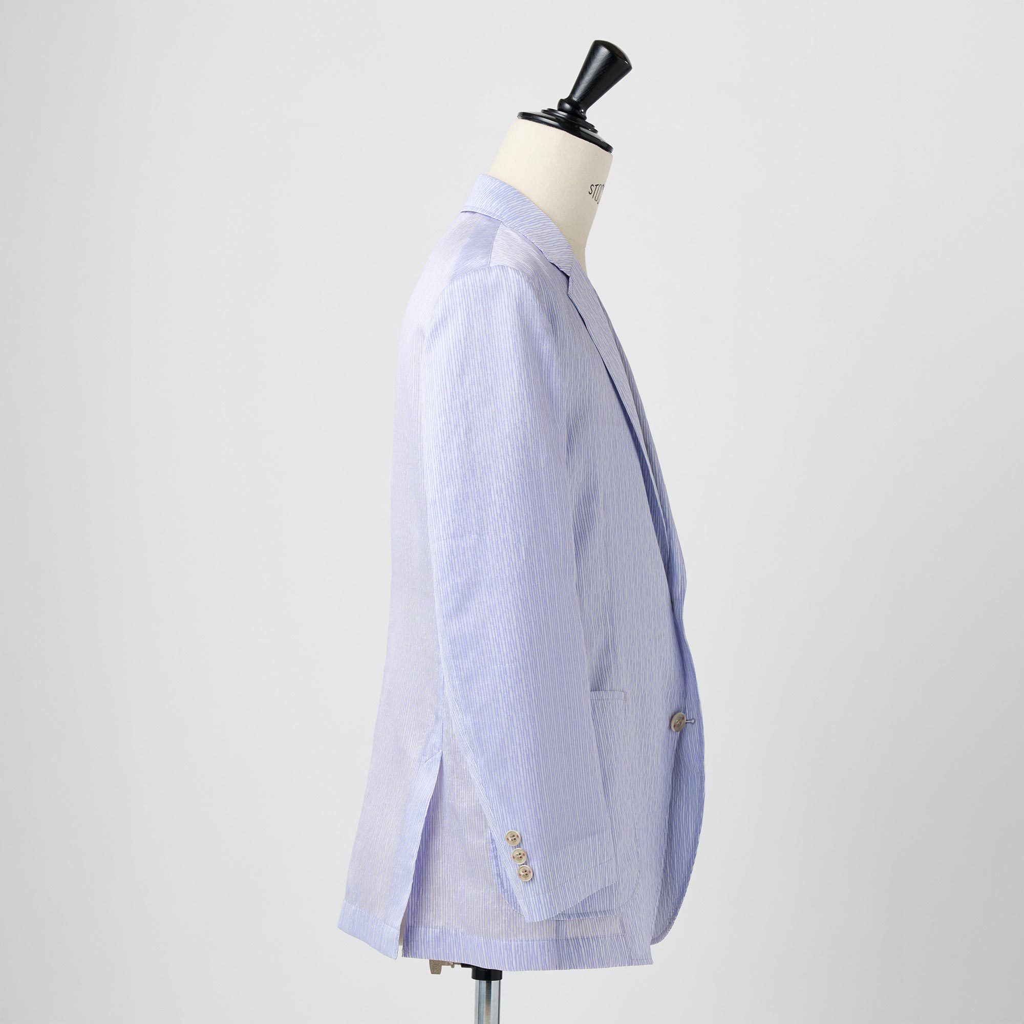 シルクの産地、山形県米沢市の生地メーカーとのコラボレーションから生まれたシルクポリエステルの透け感のあるオーガンジー生地で仕立てた超軽量なジャケットです。生地が極薄のため、身返しは大身返しにしてフロントを安定させています。各箇所には補強テープを貼り、ステッチをかけて引き裂き強度を上げています。素材はシルク特有の上品な光沢を備えながら、ポリエステルをブレンドすることでシワになりにくく、摩擦や水濡れにも比較的強い仕上がりになっています。透け感のある生地が繊細な光の変化を生み、鮮やかな色合いがモダンな雰囲気を醸し出します。軽量でありながら、ボリューム感のあるシルエットを一日中キープします。夏のリゾートでひときわ映える、エレガントなジャケットです。