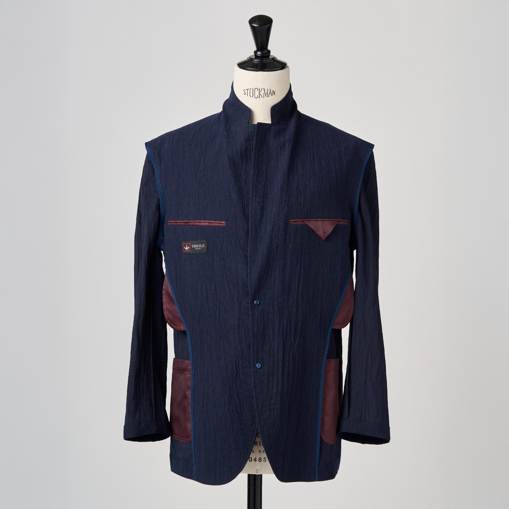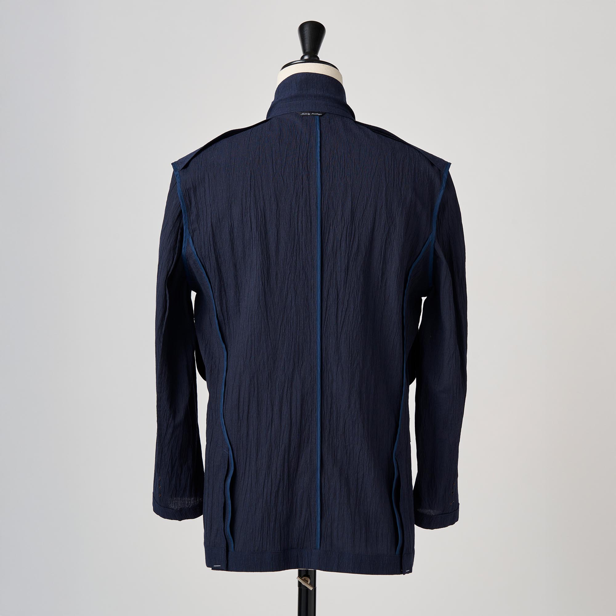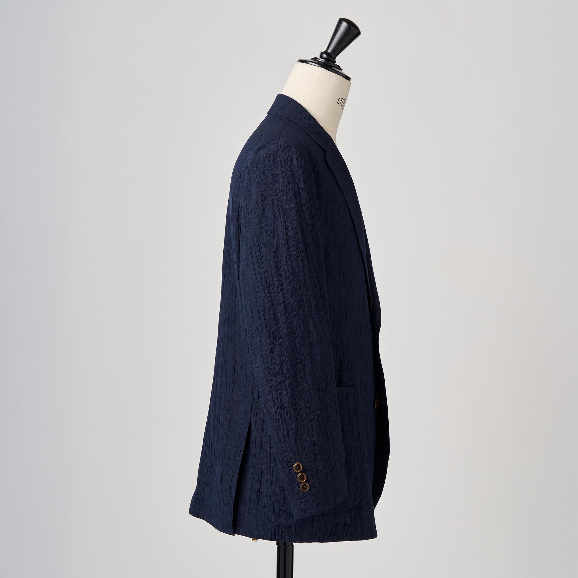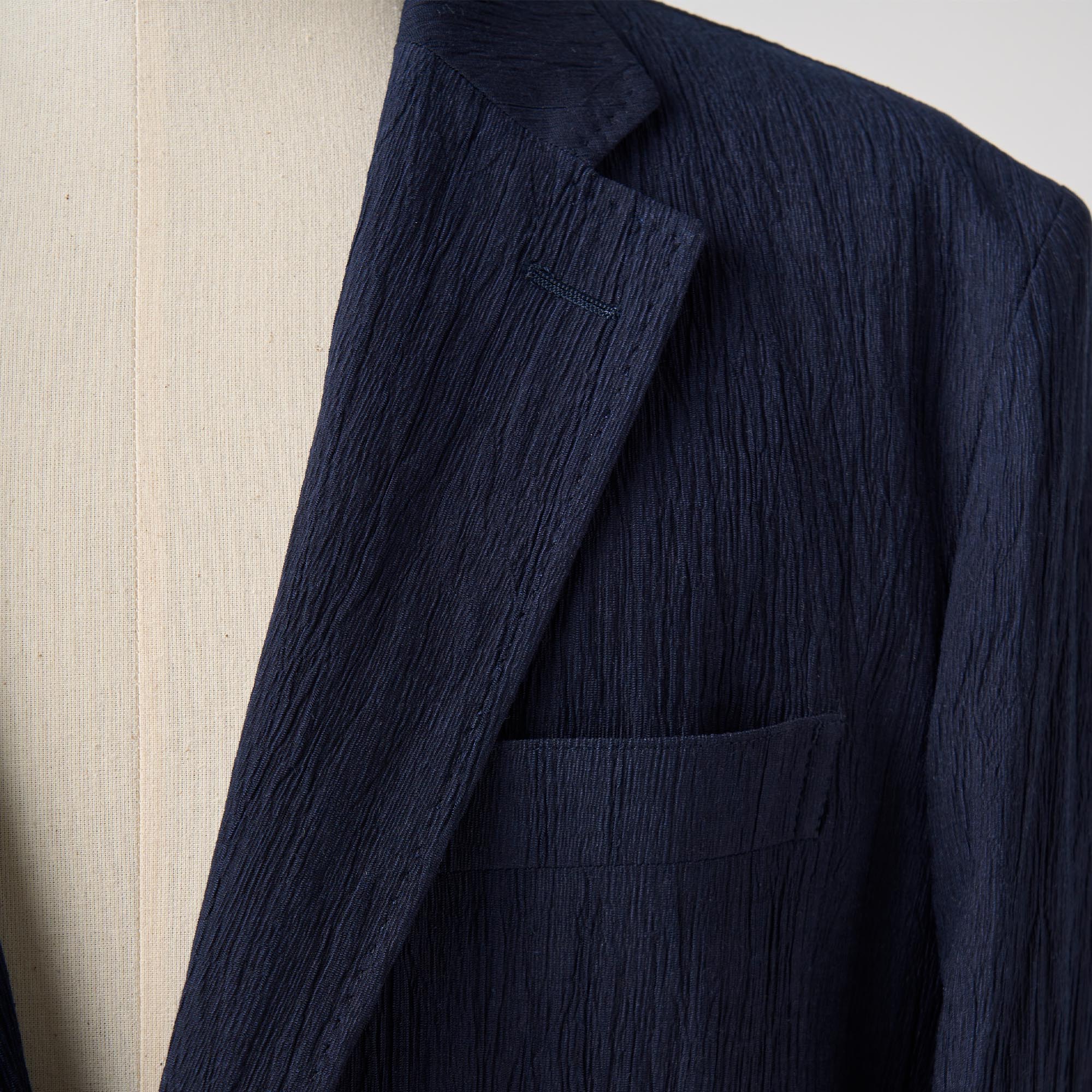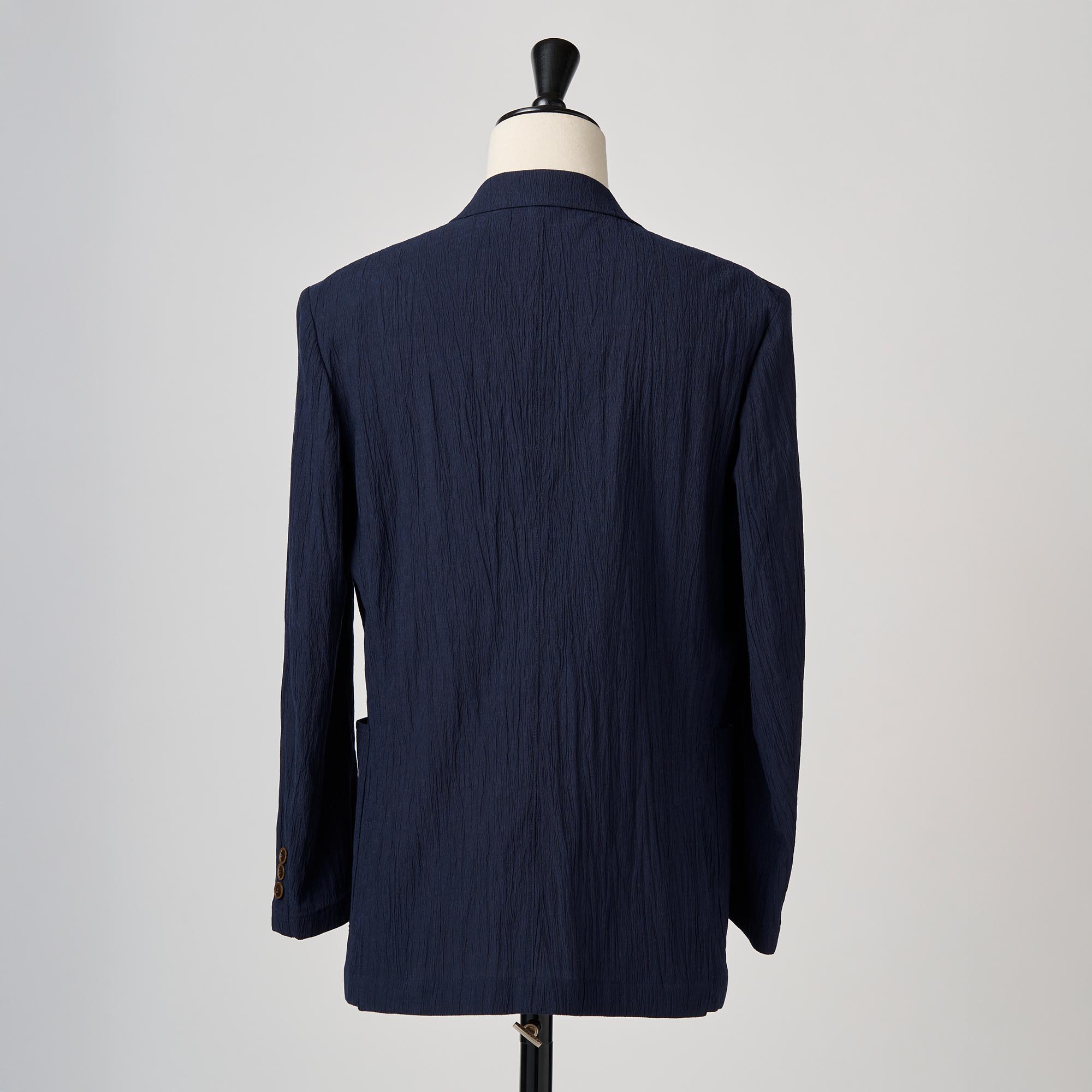 利便性に優れたポリエステルと、美しい落ち感を持つレーヨンを混紡して、更にワッシャー加工(シワ加工)をほどこしたハイブリッドな生地を使用して、軽い仕立てのジャケットを作りました。