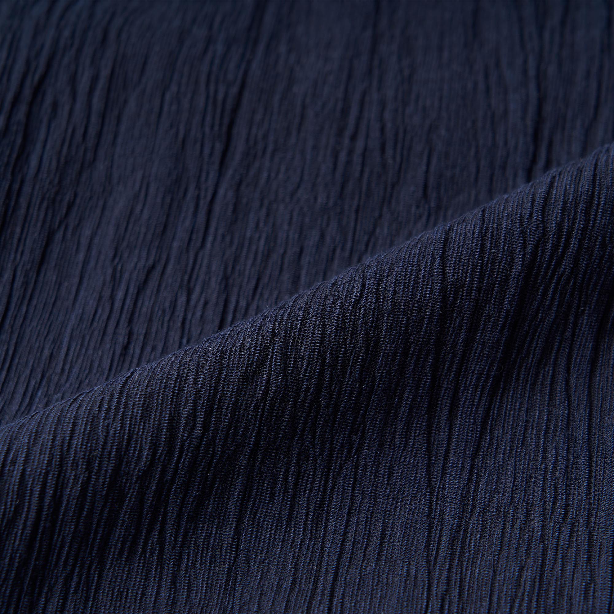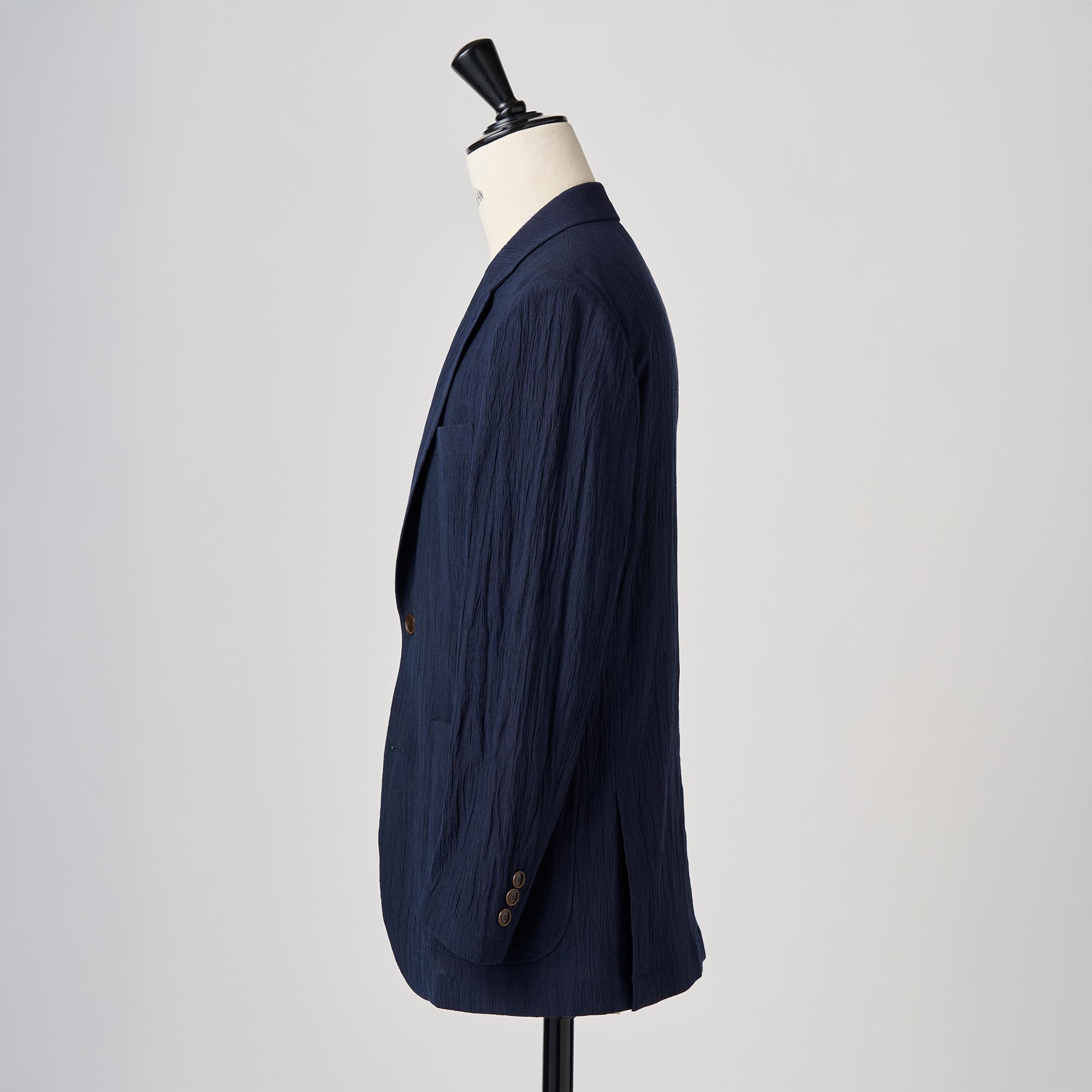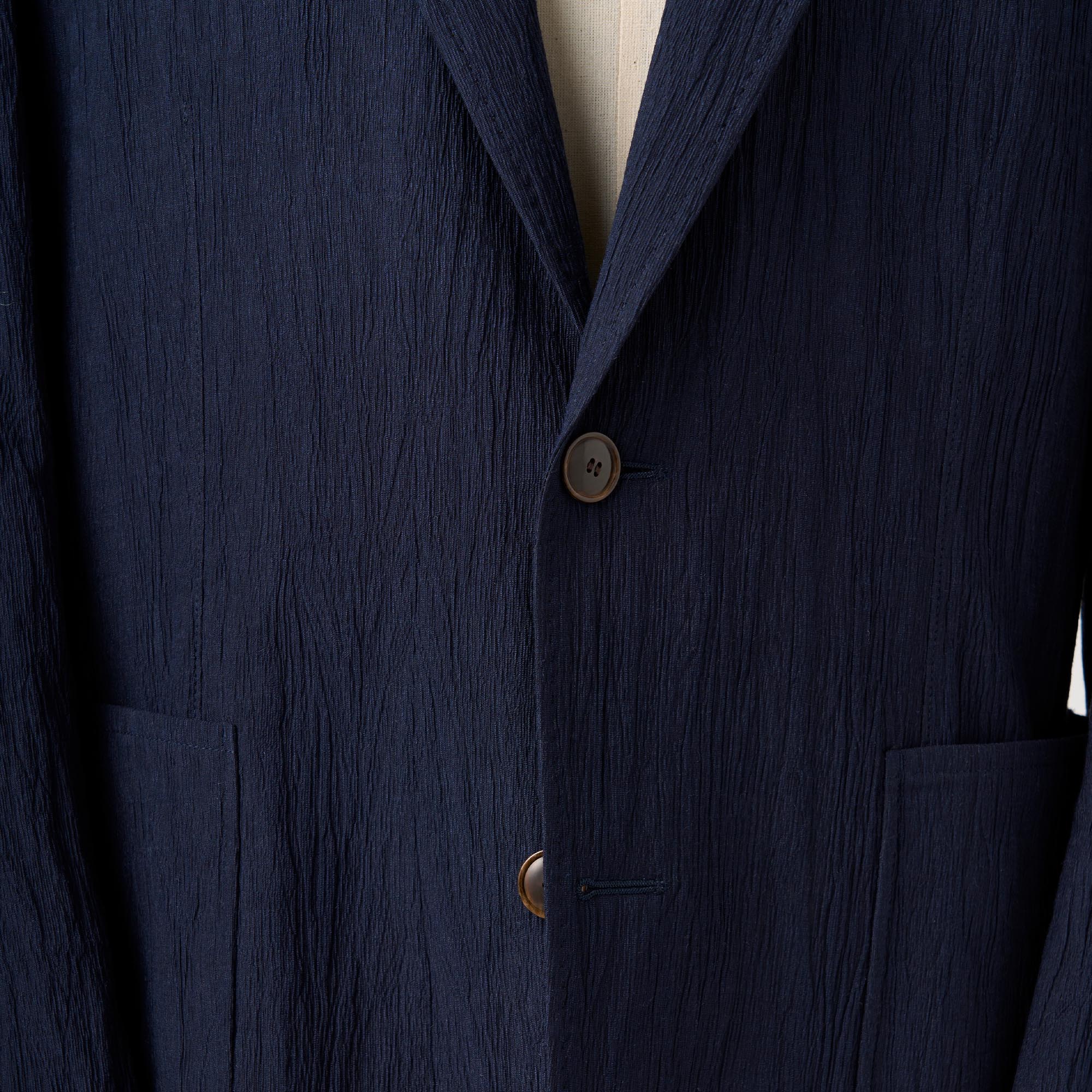 最大の特徴は、生地全体に施された繊細なワッシャー加工。あえて不均一なシワ感を与える事でネイビーの持つ硬い印象を程よく崩し、奥行きのあるナチュラルな表情を引き出しました。
