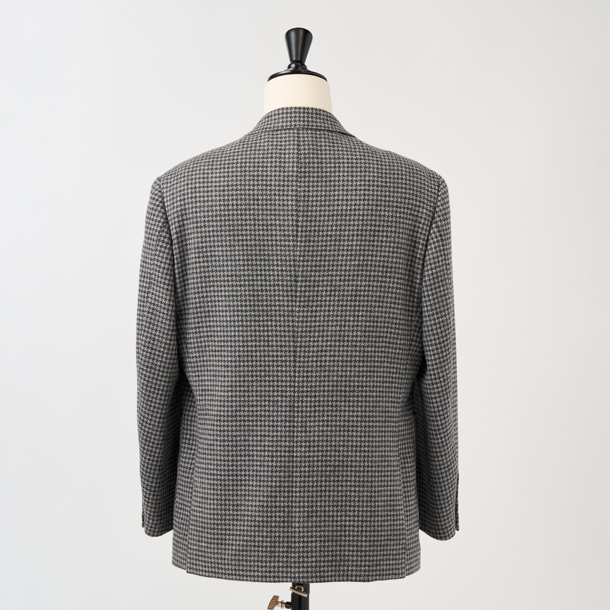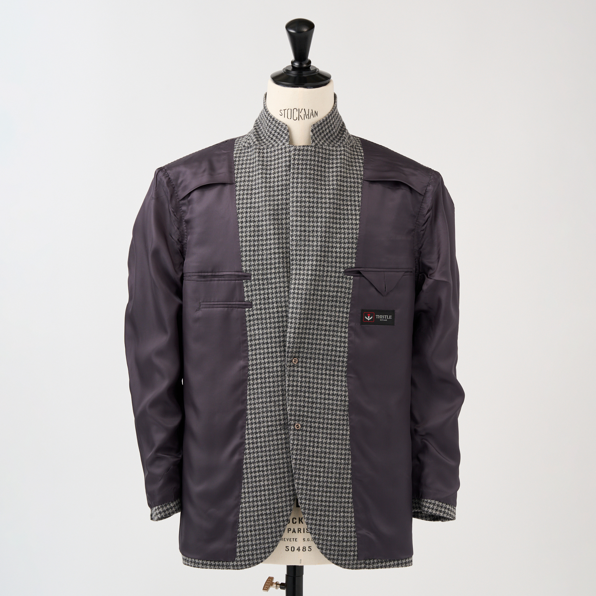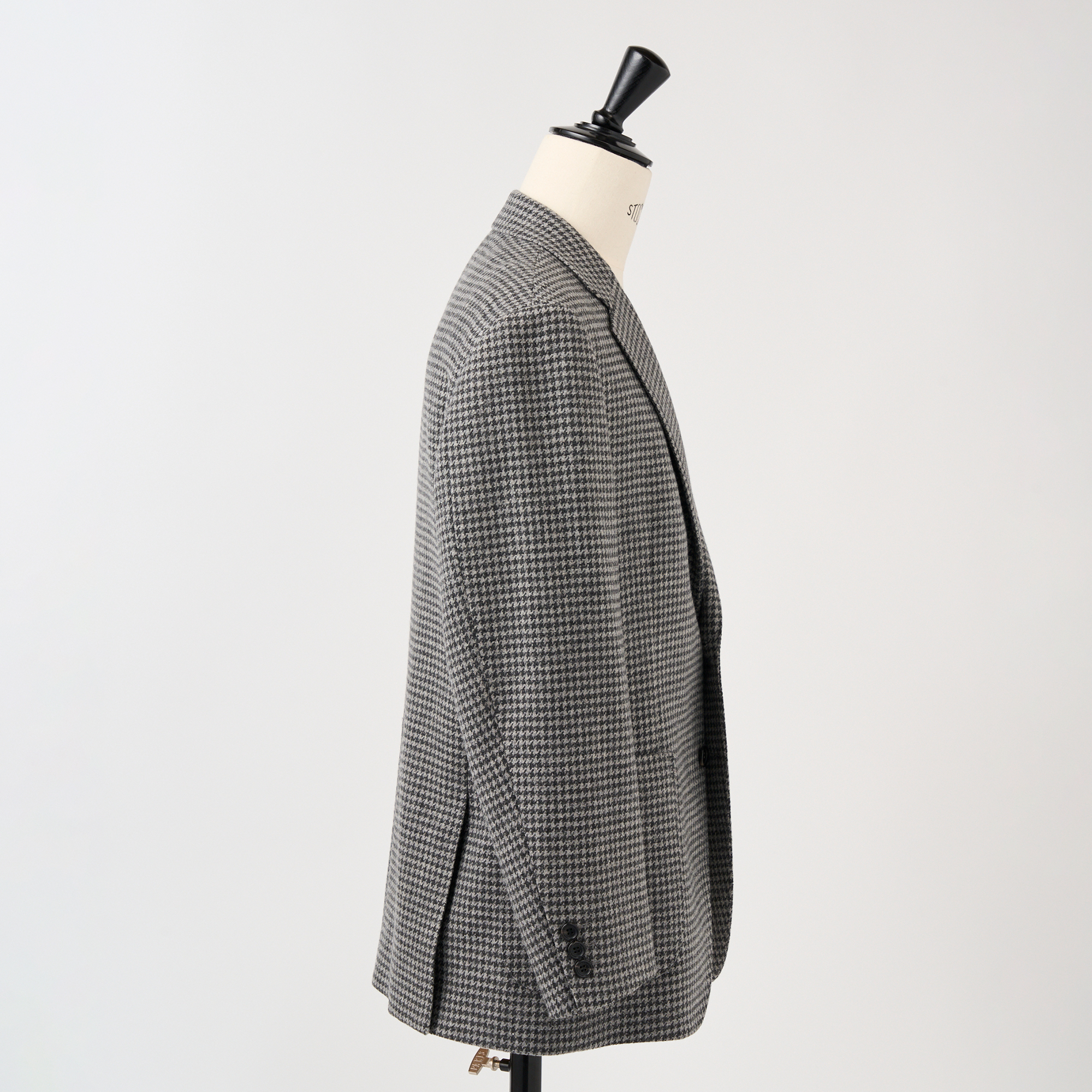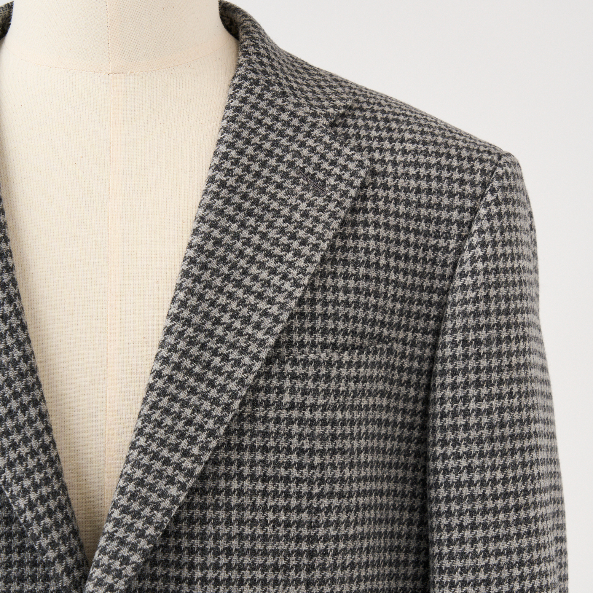ウールナイロンのグレー千鳥格子柄のツイード素材で仕立てたクラシックなジャケット。ツイード素材の特徴として独特な風合いと見た目があります。ネップが混ざっていたり、ザックリとした織り感があったりと素朴で温かみのある風合いが魅力です。
