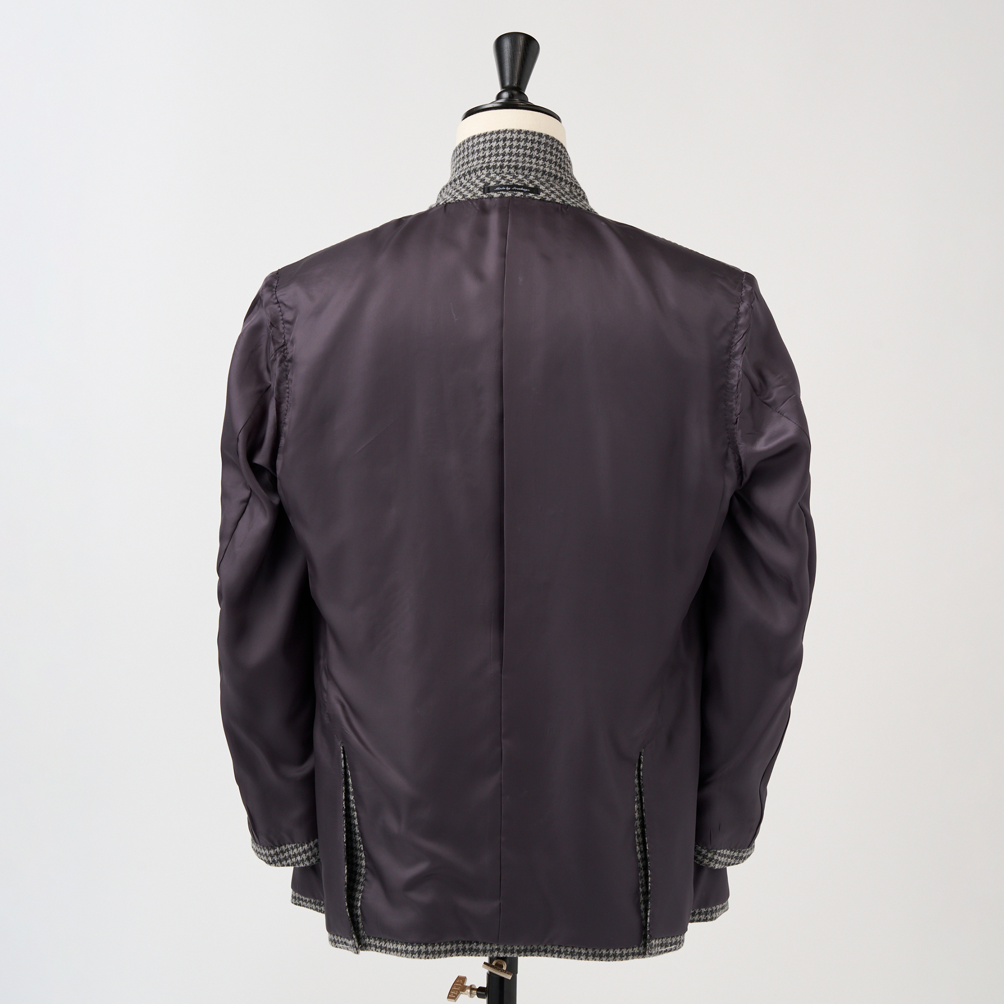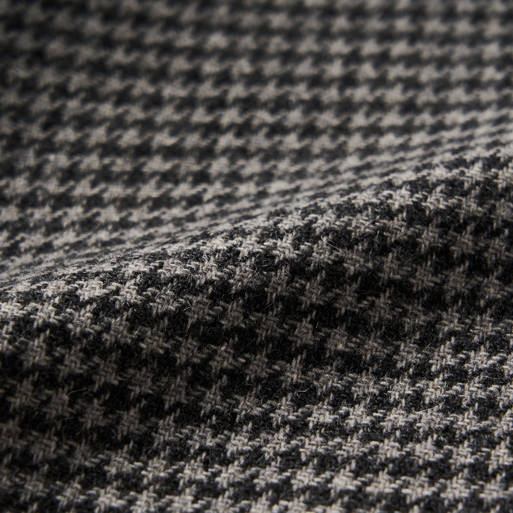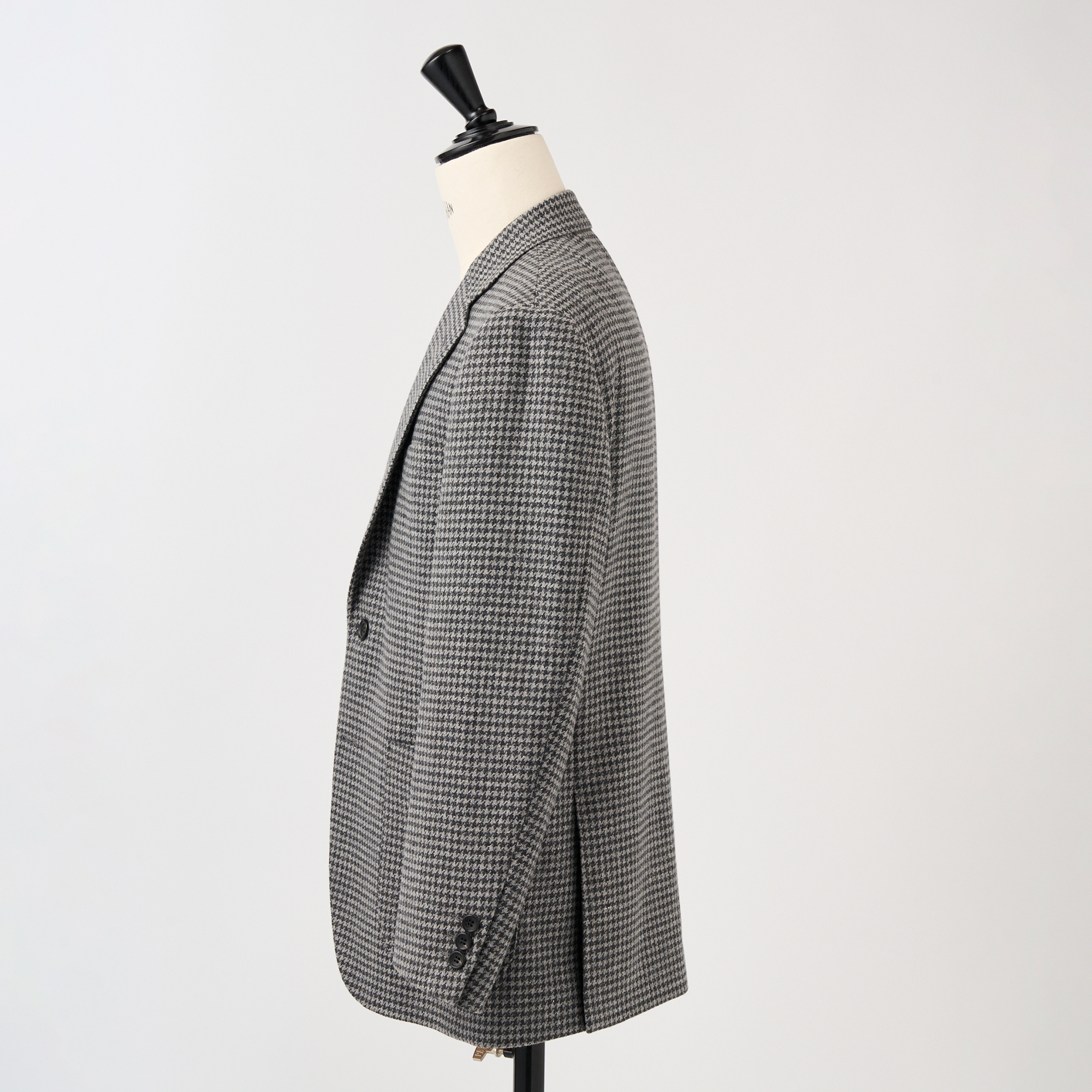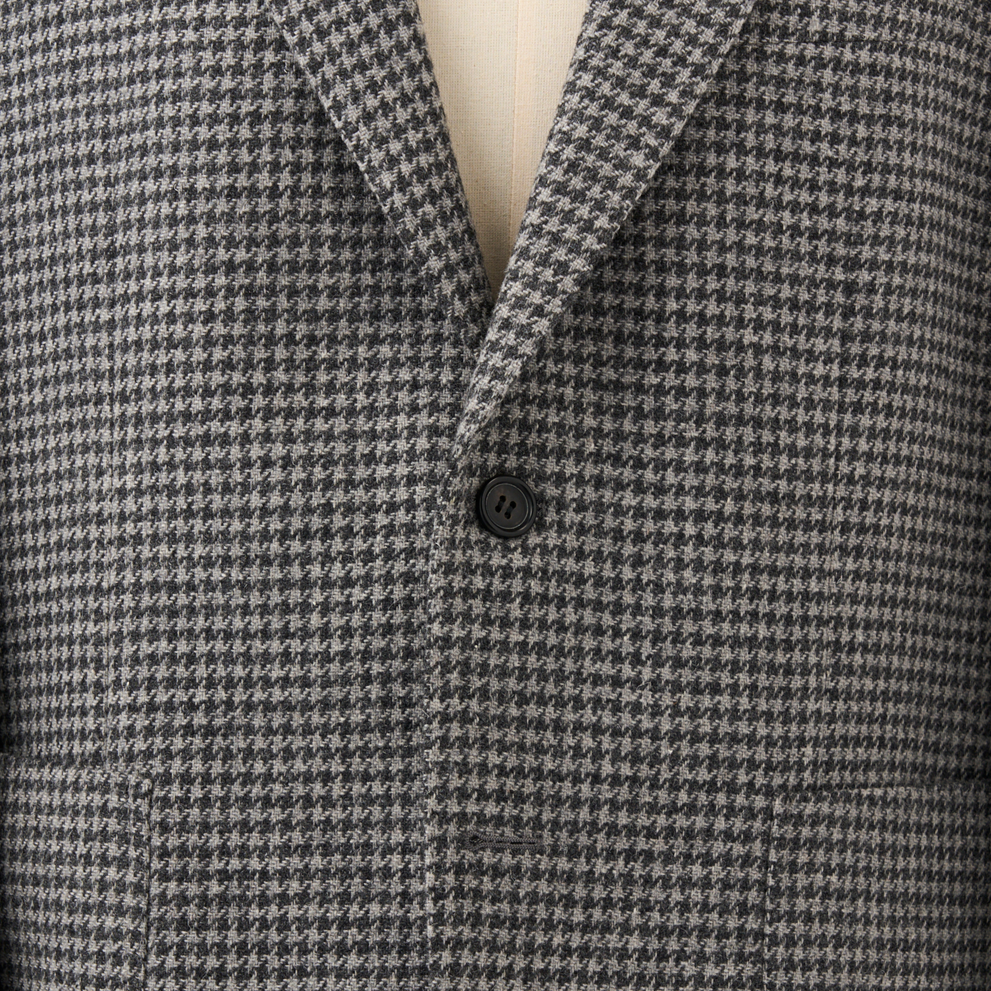 ウールナイロンのグレー千鳥格子柄のツイード素材で仕立てたクラシックなジャケット。ツイード素材の特徴として独特な風合いと見た目があります。ネップが混ざっていたり、ザックリとした織り感があったりと素朴で温かみのある風合いが魅力です。